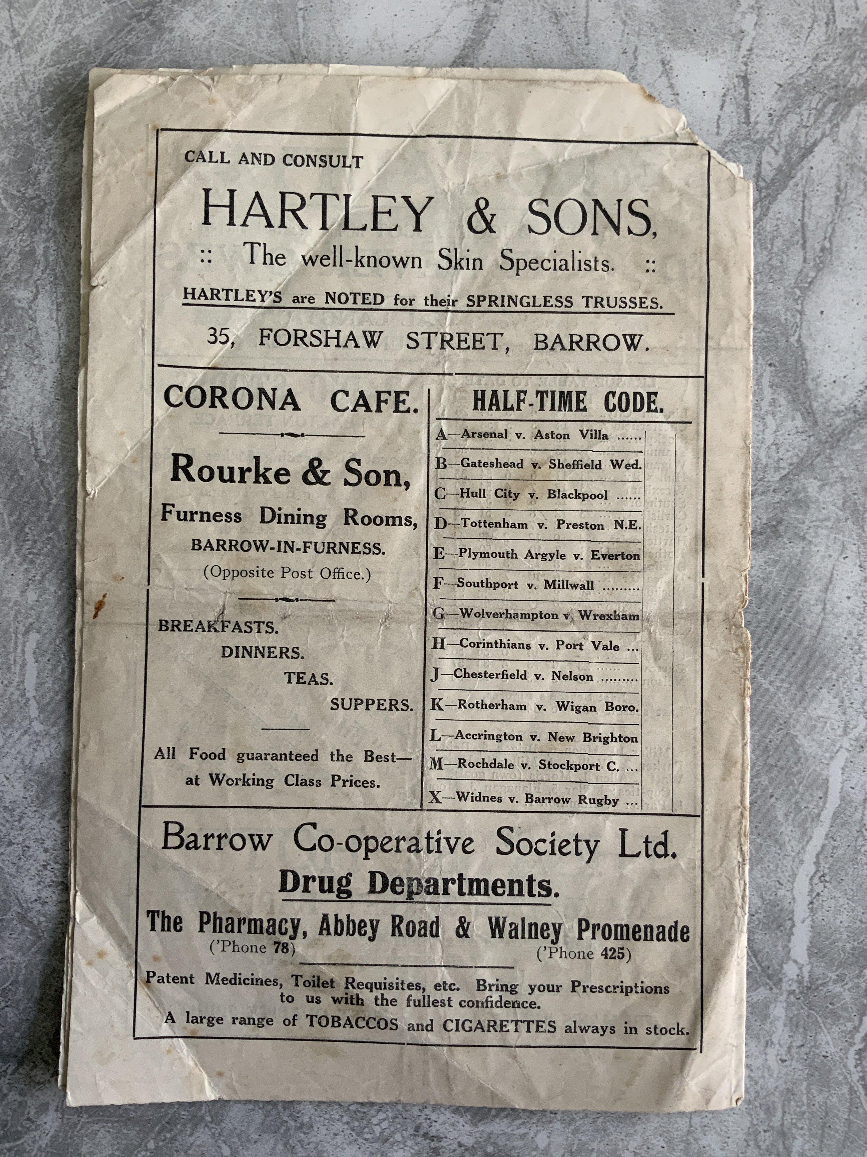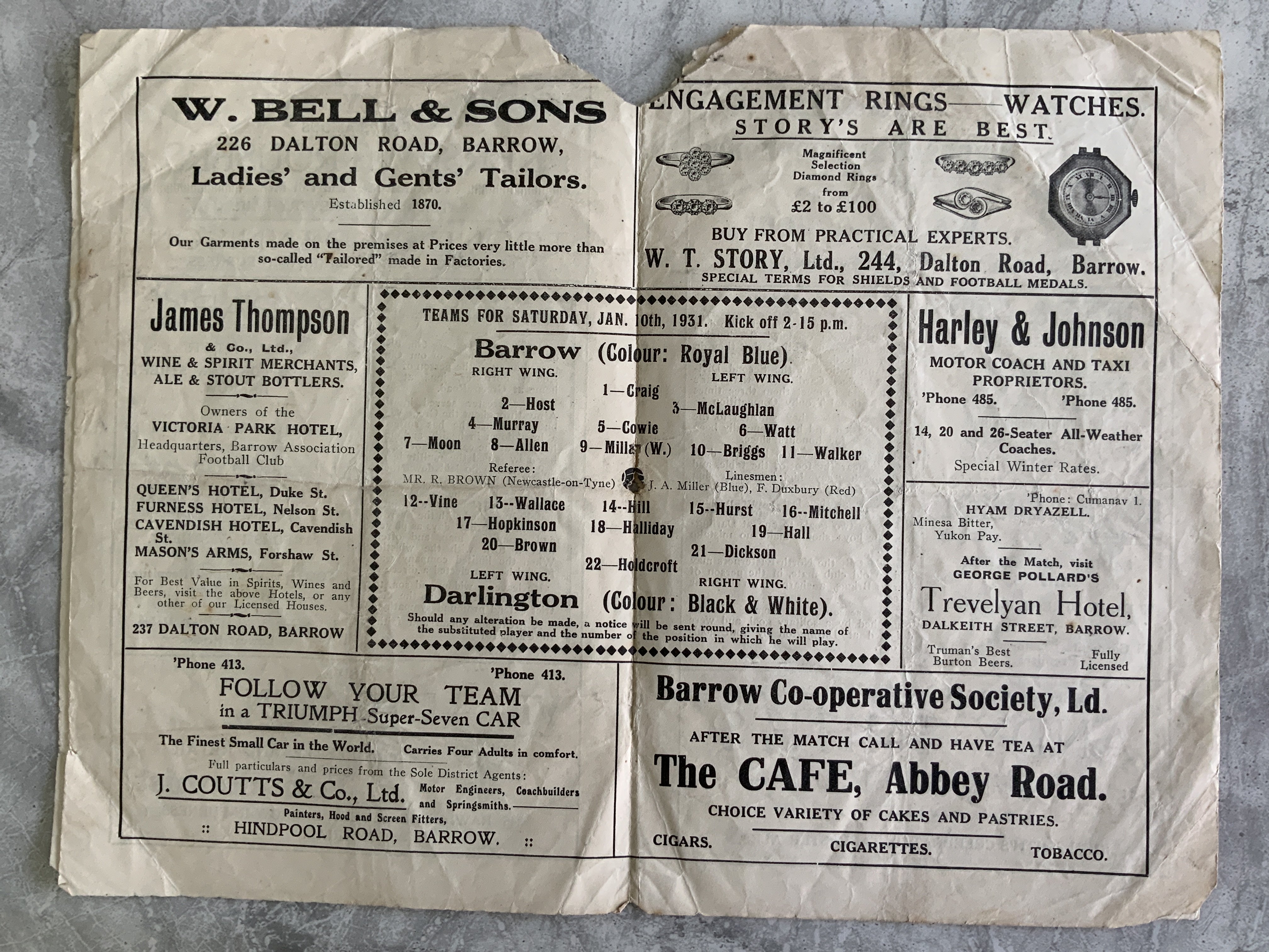 30/31 Barrow v Darlington Football Programme: 3rd Division North match in poor/fair condition with no team changes. Piece missing. See online photos.