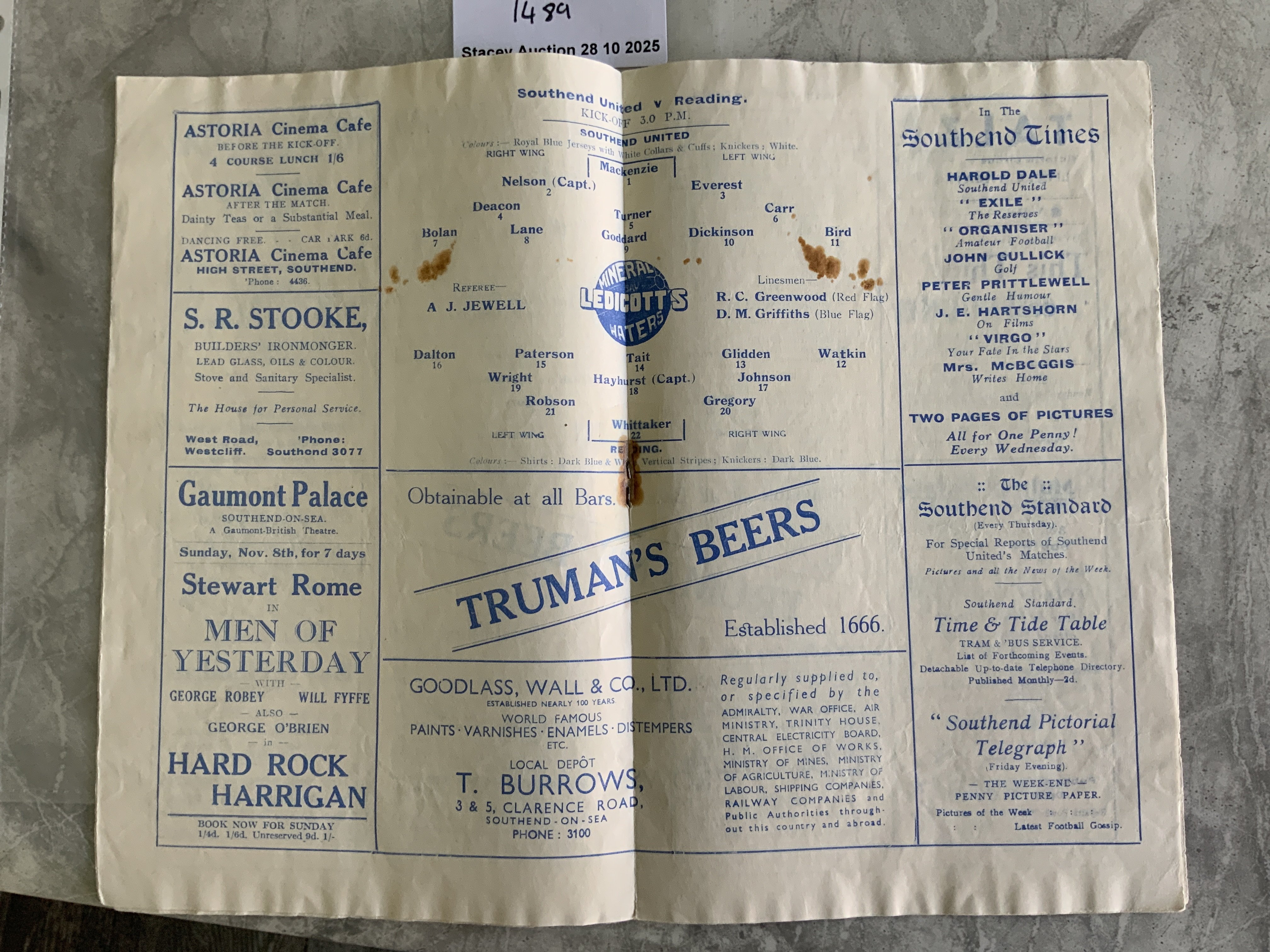 36/37 Southend United v Reading Football Programme: 3rd Division South match in fair condition with no team changes. Repair at rusty staple area.