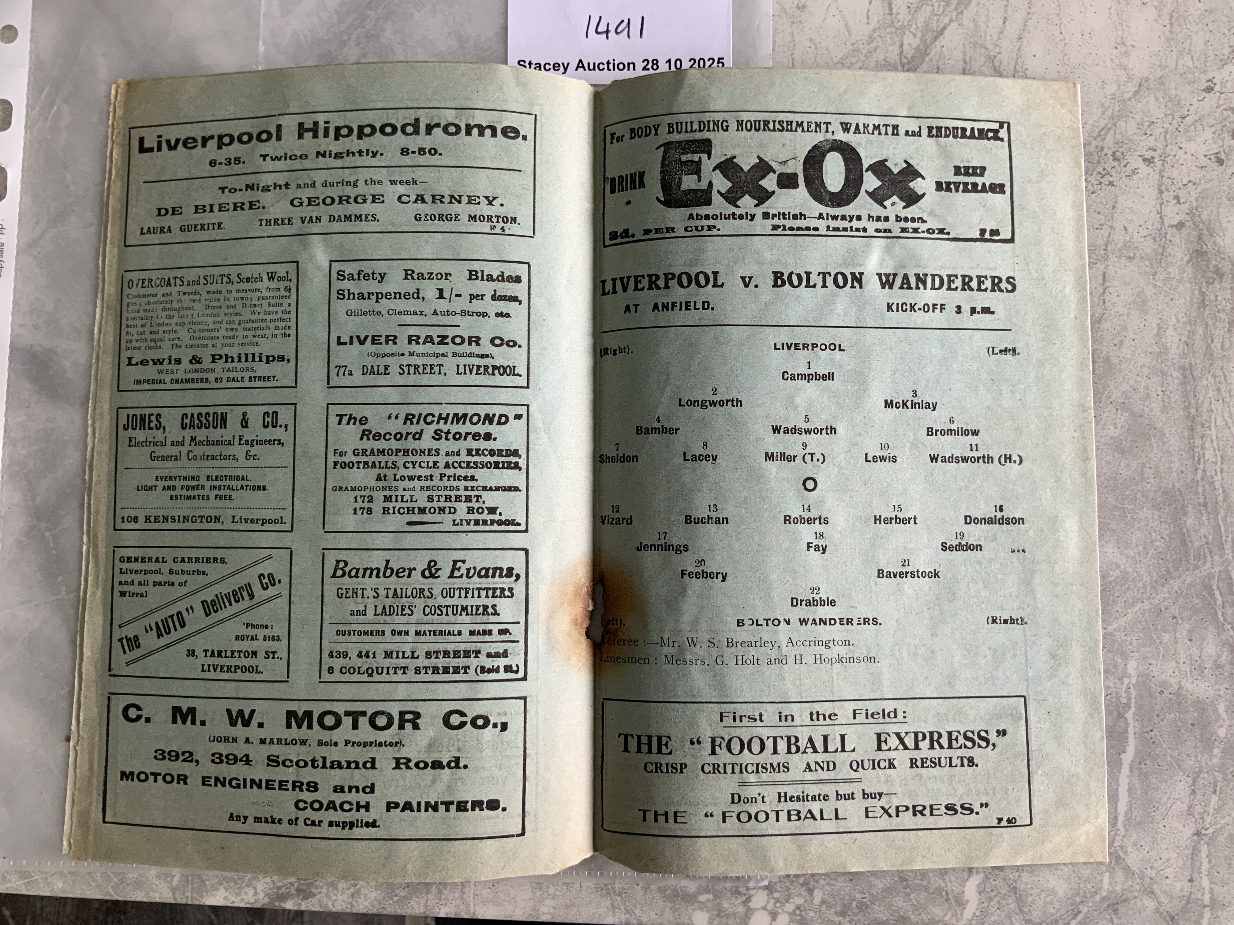 1919 - 1920 Liverpool v Bolton Football Programme: 1st Division match in fair condition with no team changes. Staple rotted away leaving hole.