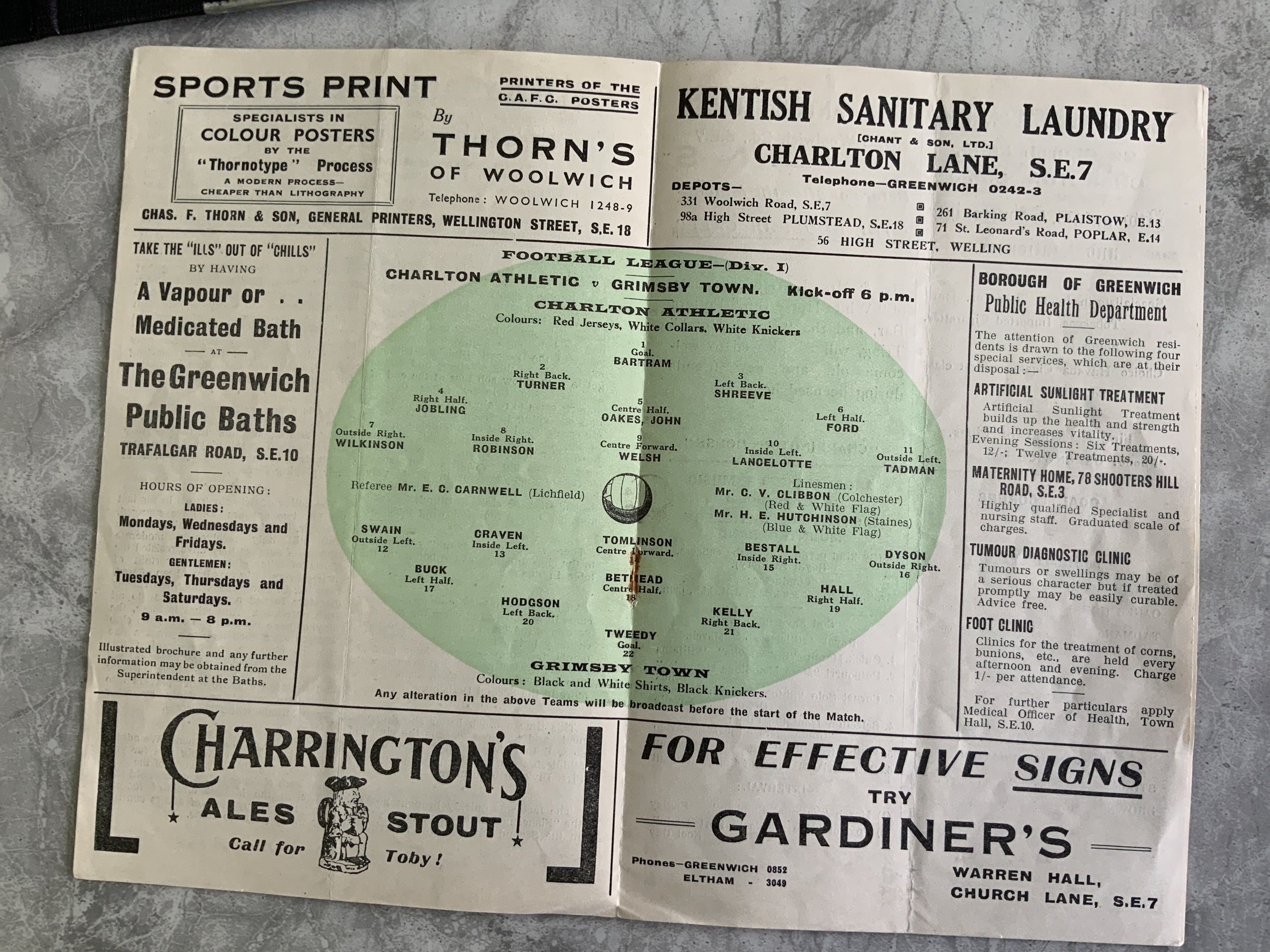37/38 Charlton v Grimsby Town Football Programme: 1st Division match in very good condition with no team changes. Staple removed not rotted away.