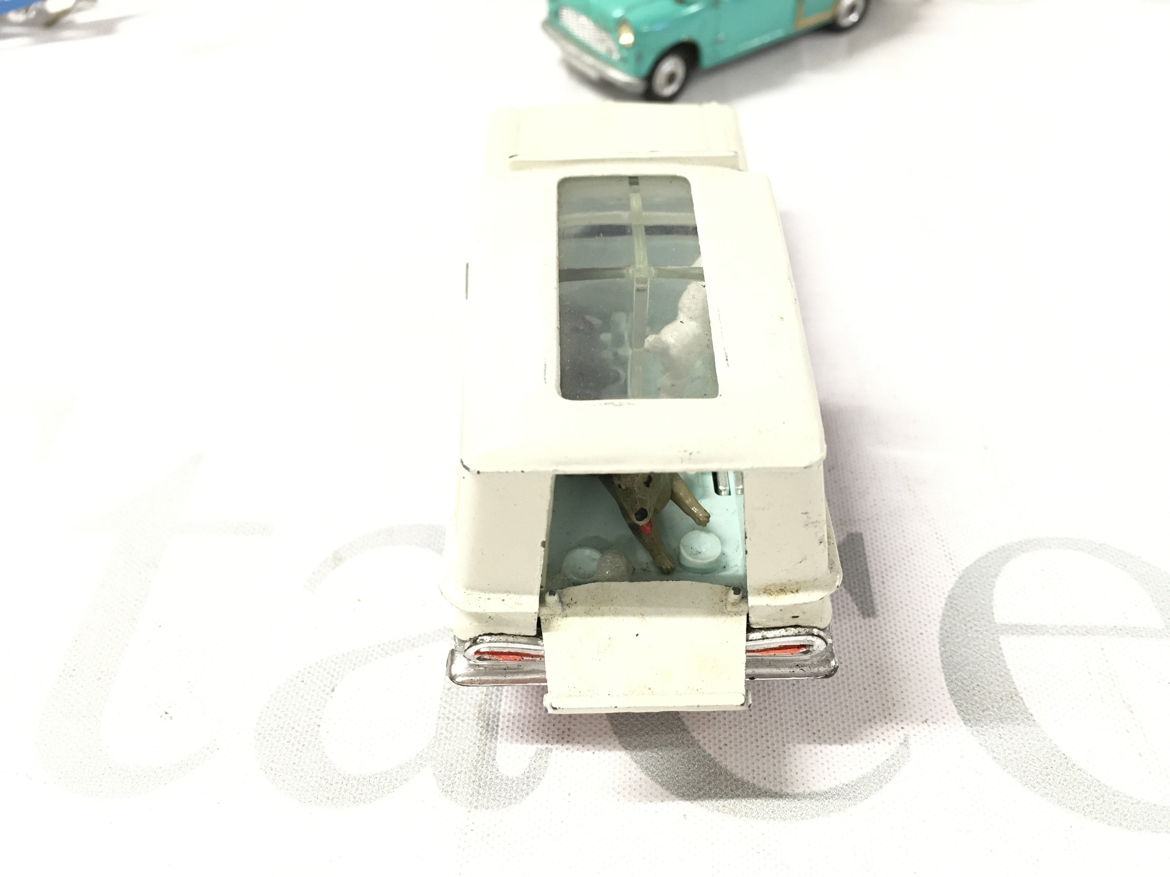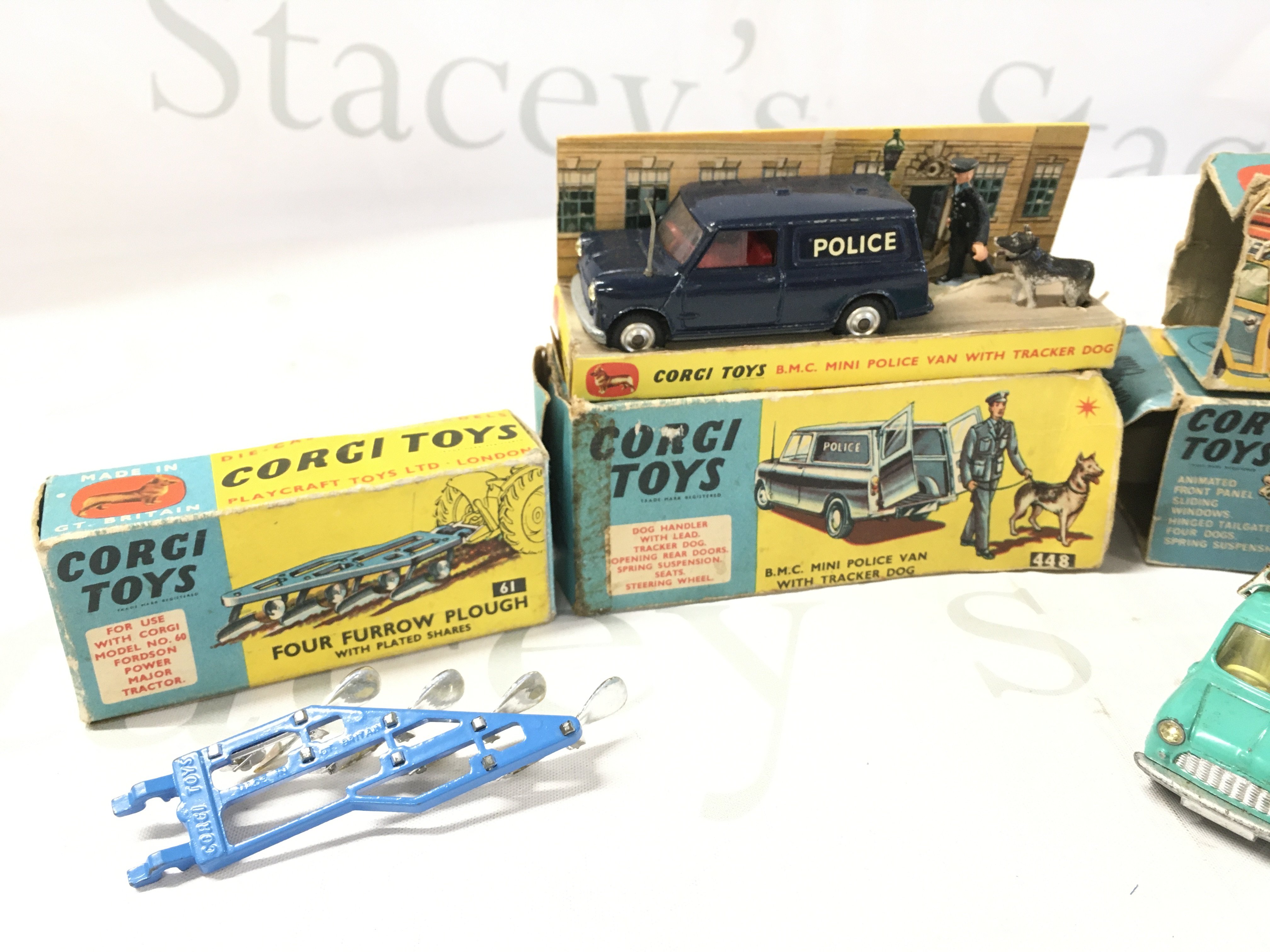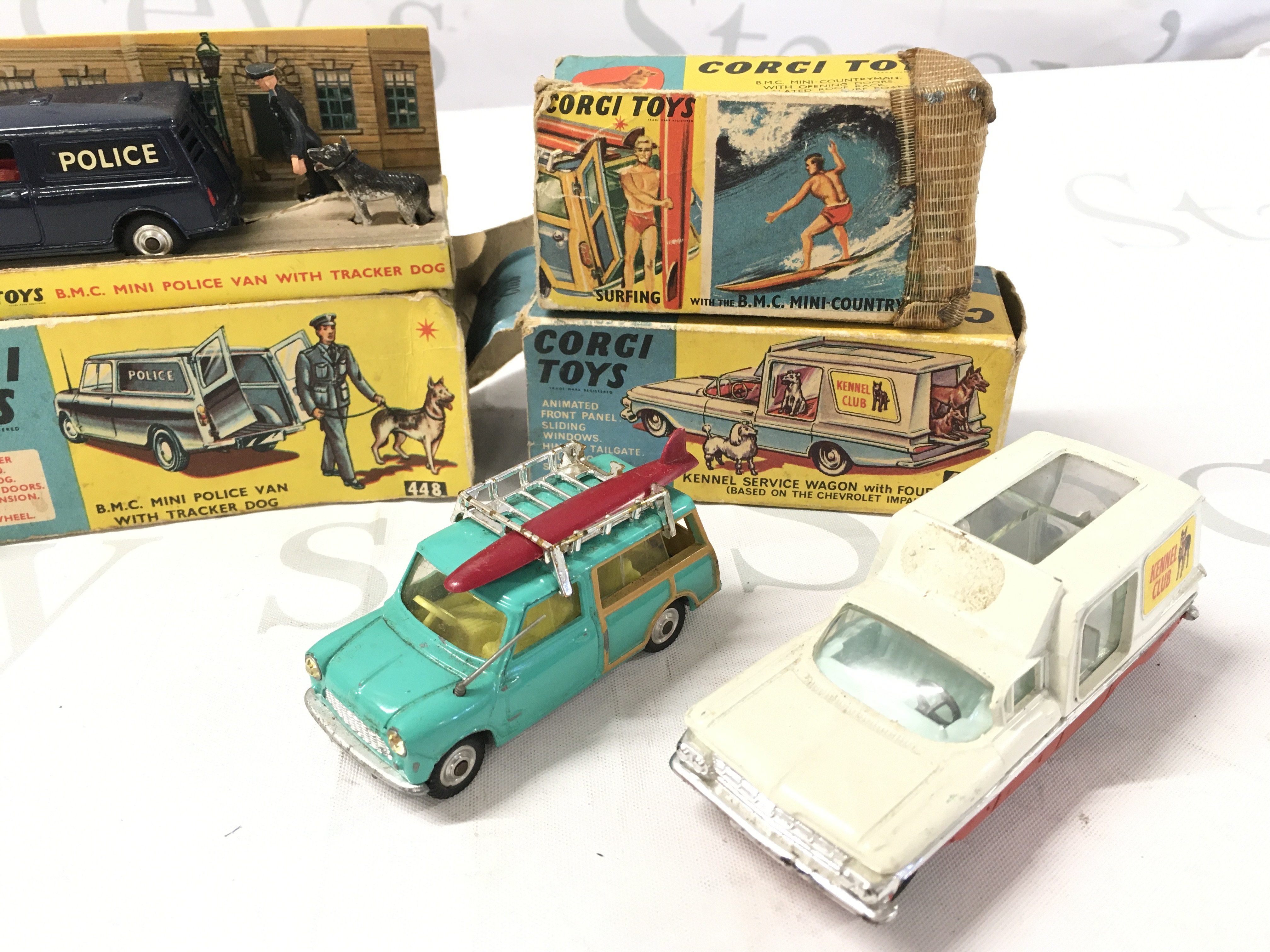 A Collection Of 4 Boxed Corgi Vehicles. A Four Four Plough #61. A B.M.C. Mini Police Van With Tracker Dog #458 (lead Broken) A Surfing B.M.C. Mini Countryman #485 And A Kennel Service Wagon #486. All Boxes Are Worn Etc.