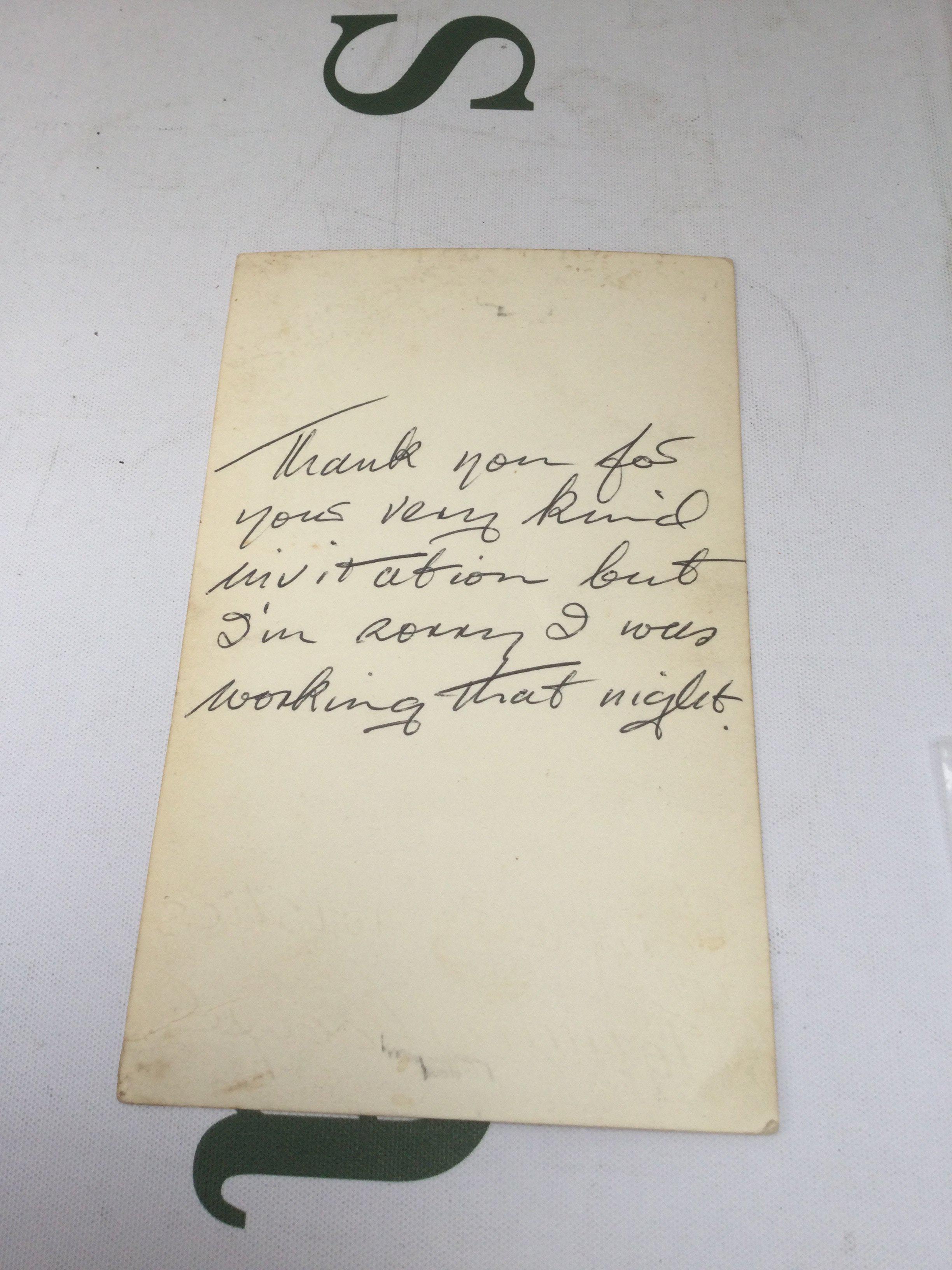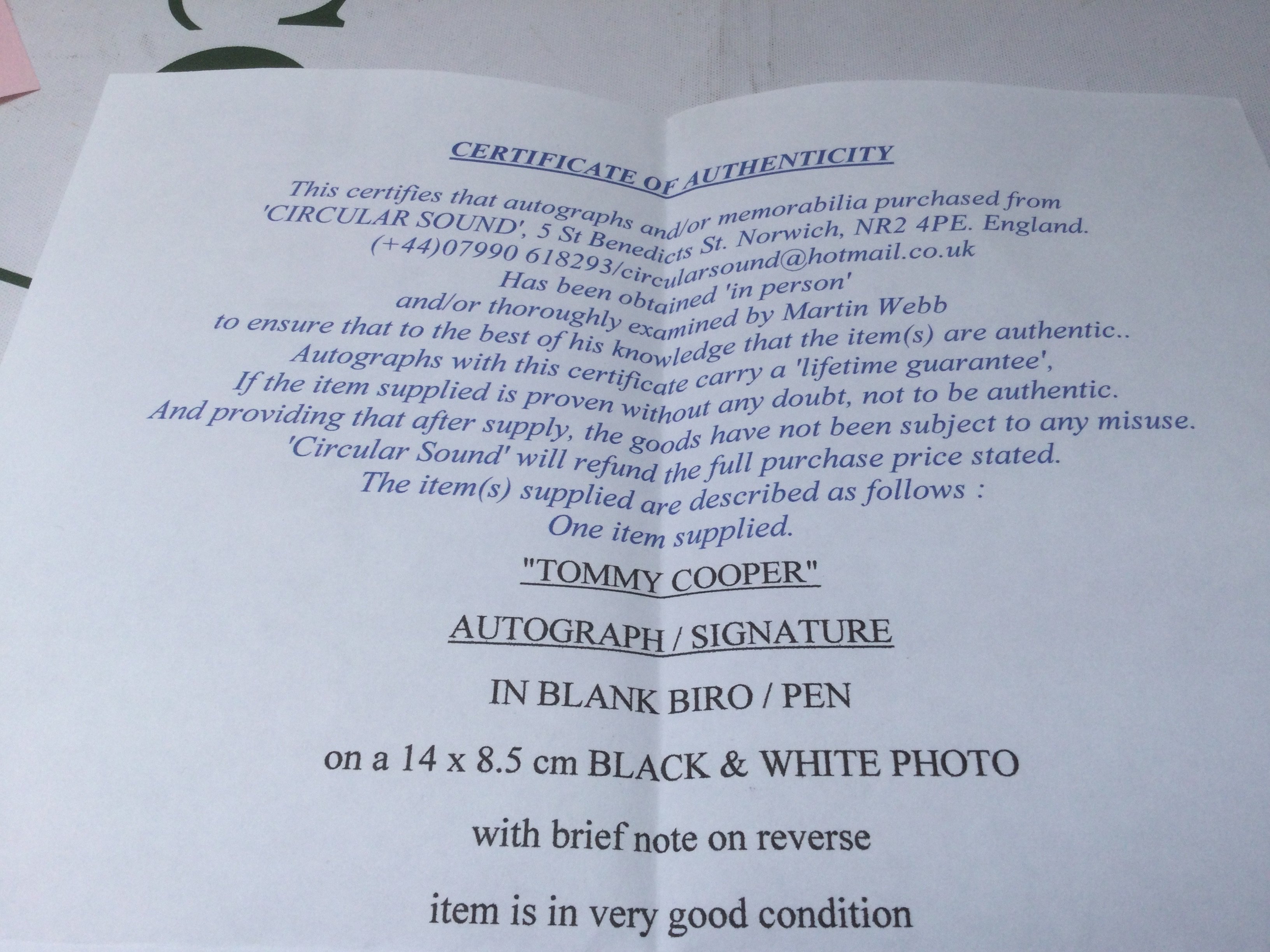 A signed Tommy Cooper photographic card with handwritten notes on the reverse.
