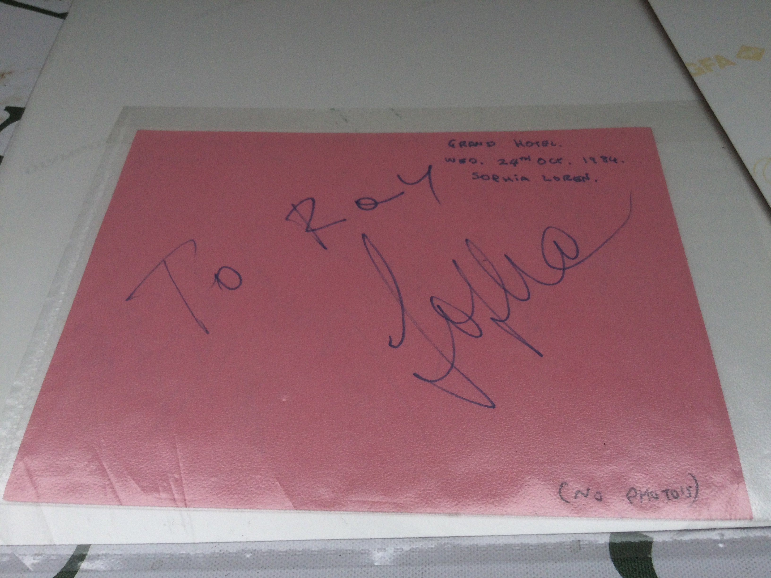 Three signed photos of actresses comprising Sophia Loren, Britt Ekland and Catherine Deneuve plus a Sophia Loren autograph on a booklet page.