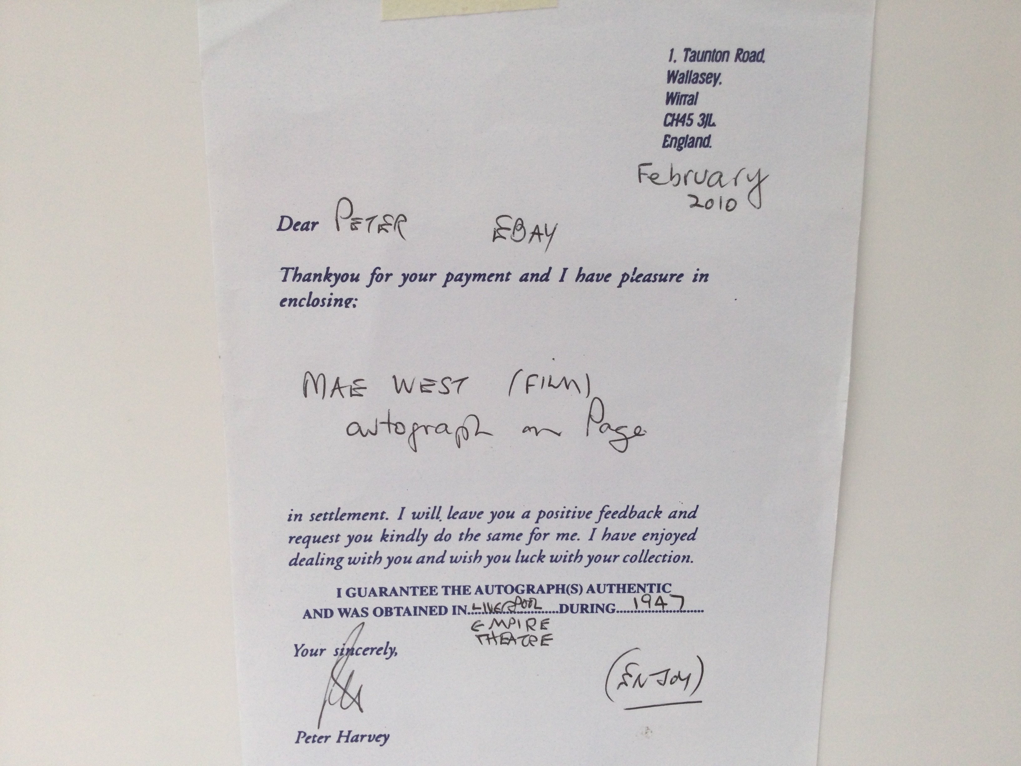 A framed and signed display of Mae West with COA, approx 30cm x 40cm.