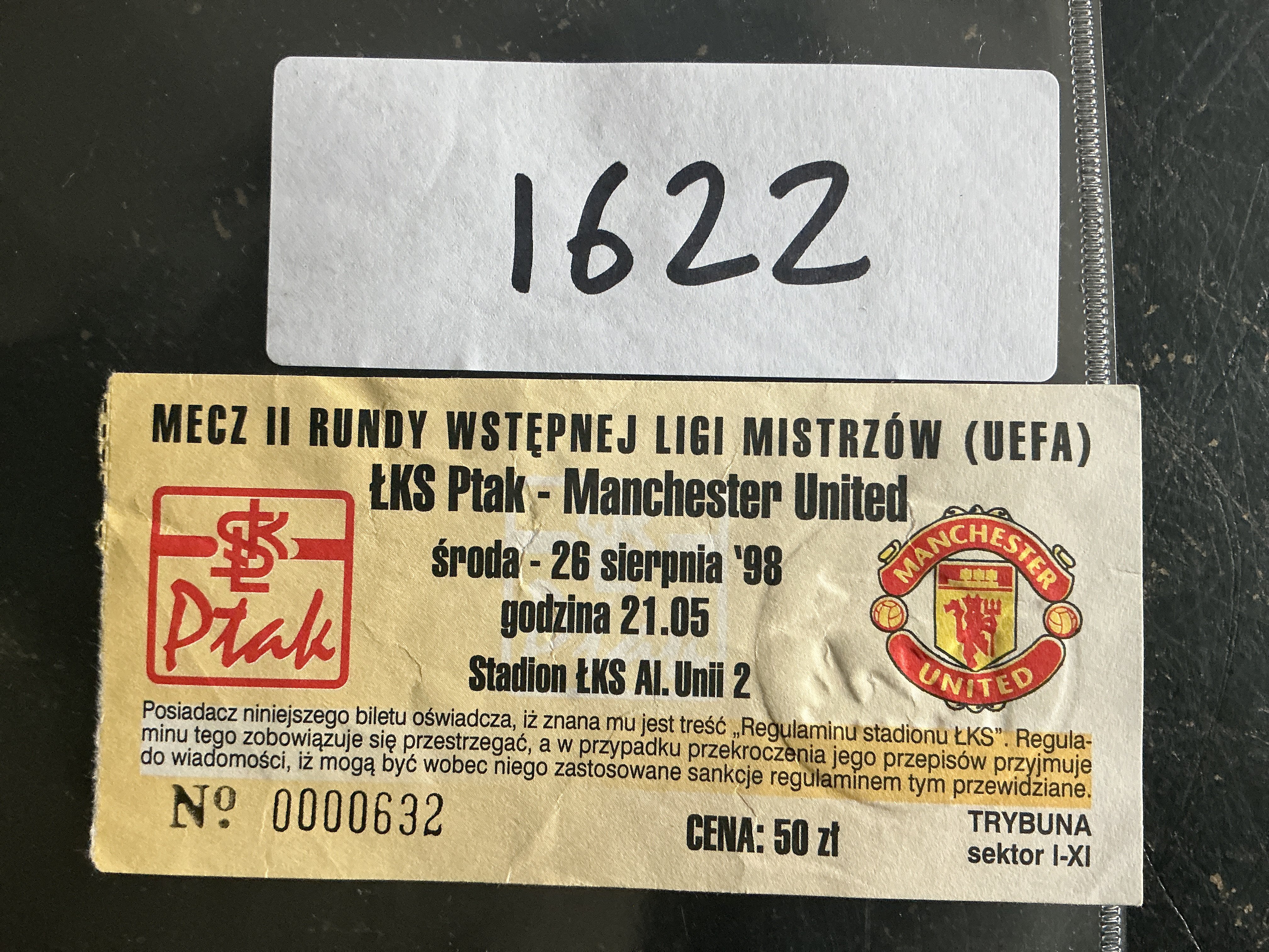 98/99 Plak v Manchester United Football Ticket: Champions League treble season ticket dated 26 9 1998. Writing to rear.