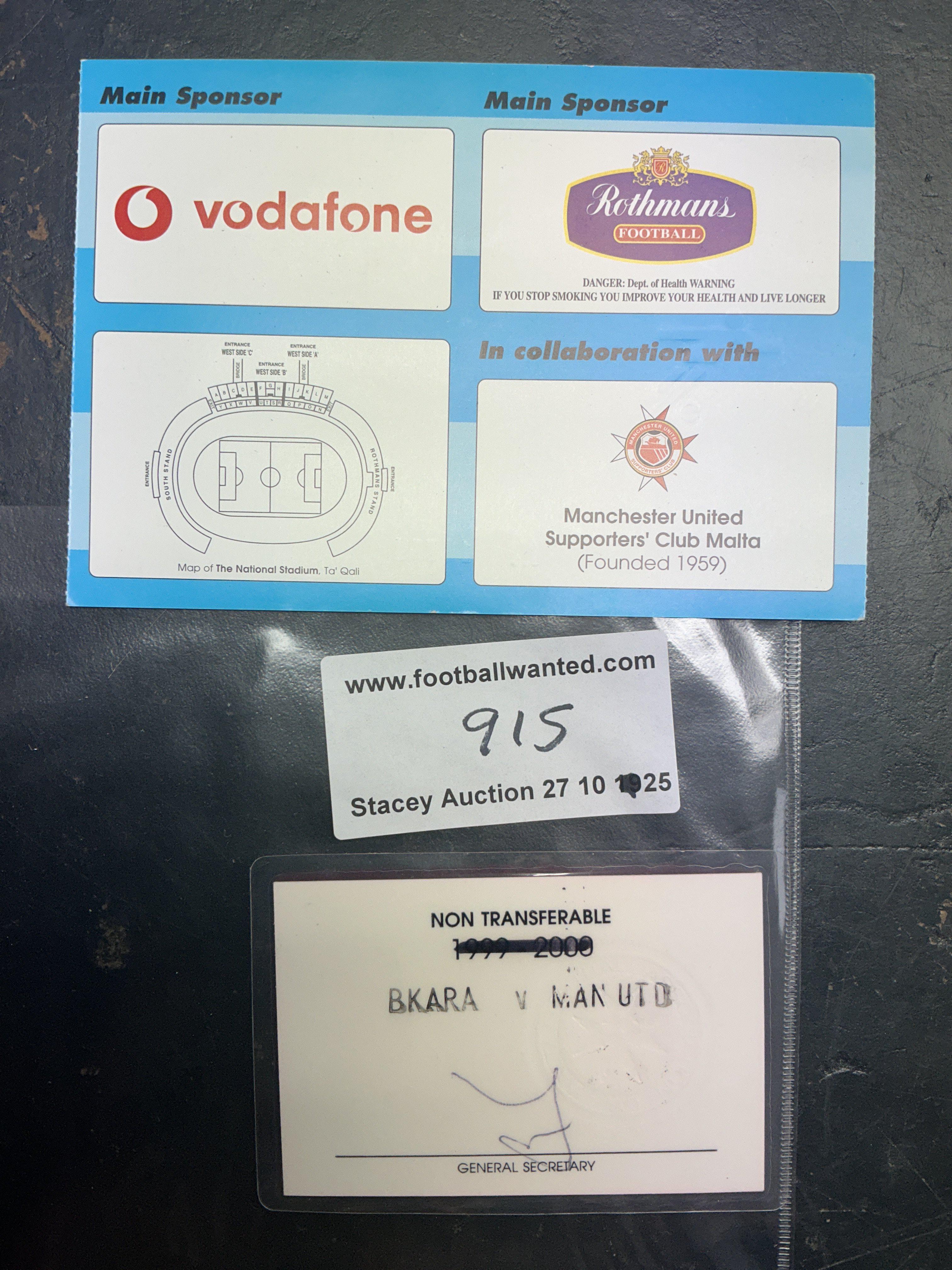 2000 - 2001 Birkirkara v Manchester United Football Ticket: Friendly match dated 9 8 2000 played in Malta. Paddy Crerands own ticket and his press card working for Man Utd TV. (2)
