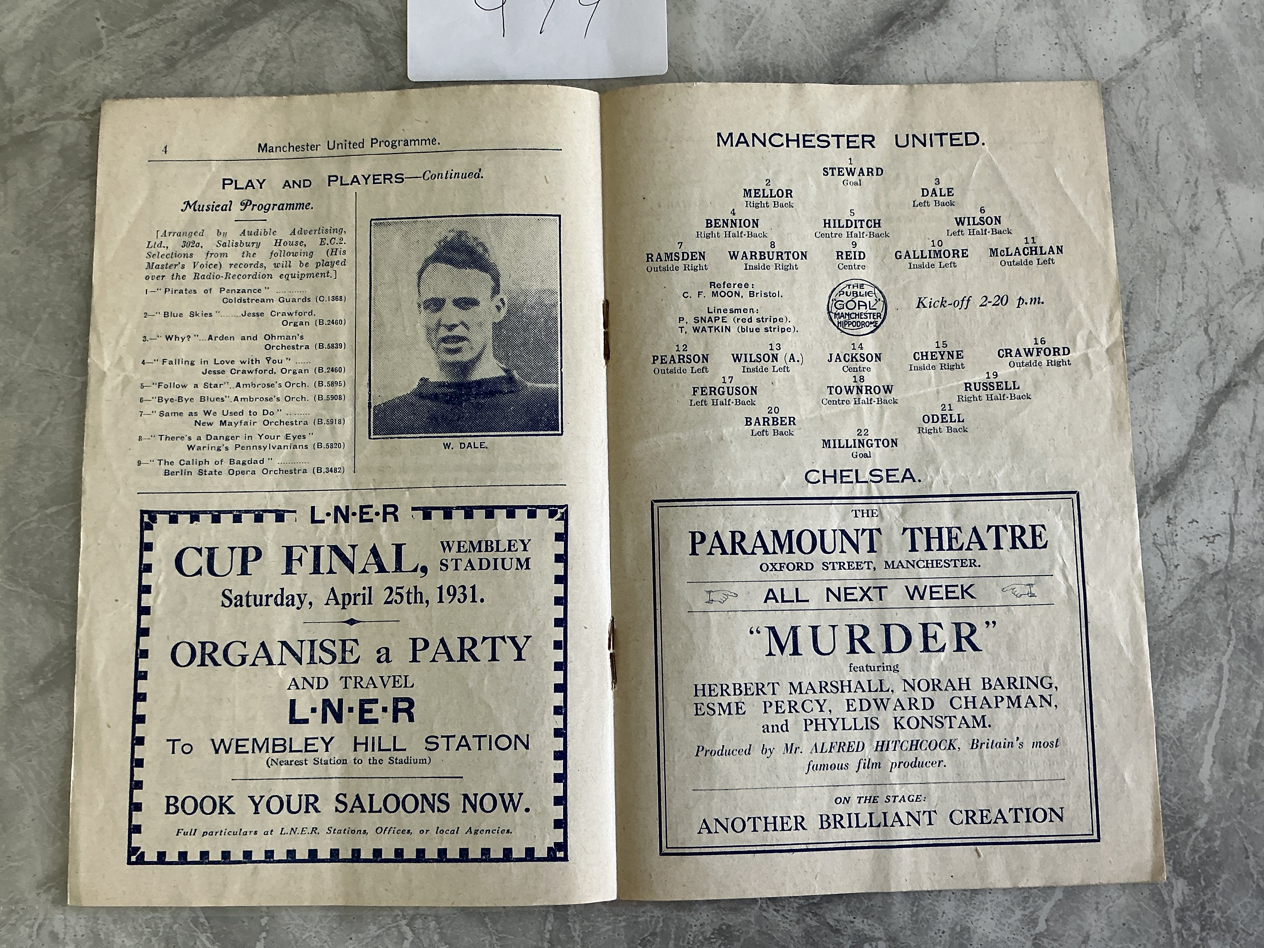 1930 - 1931 Manchester United v Chelsea Football Programme: Very good condition 8 page 1st Division programme with no team changes. Pencilled half times filled out inside.