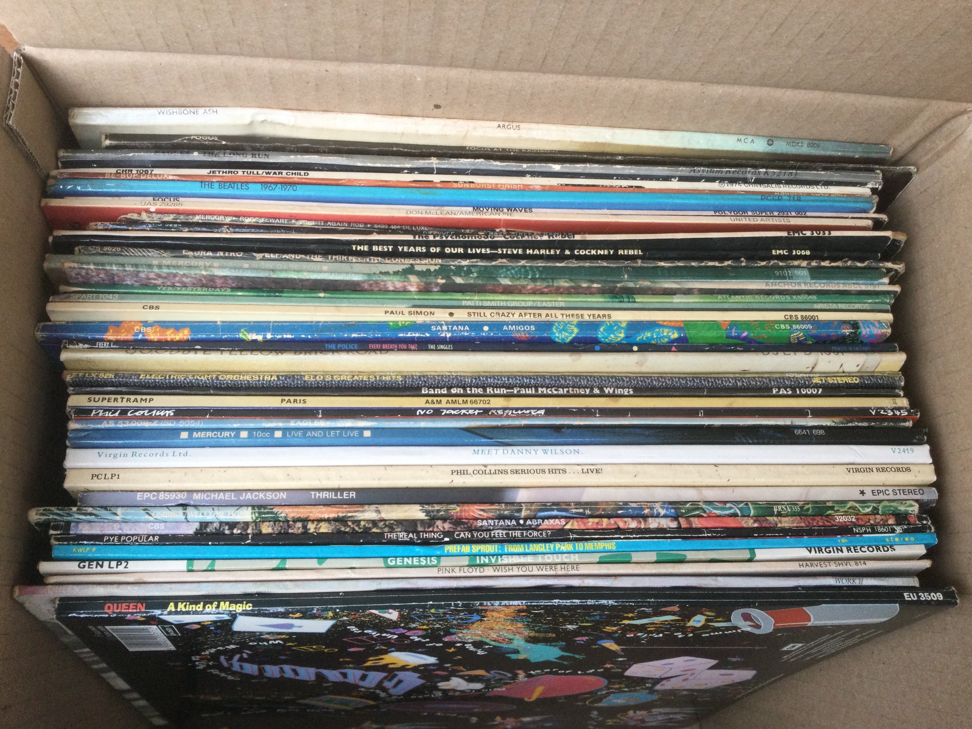 A bag and a record case of LPs, EPs and 7" singles by various artists including Pink Floyd, Patti Smith, Queen and others.
