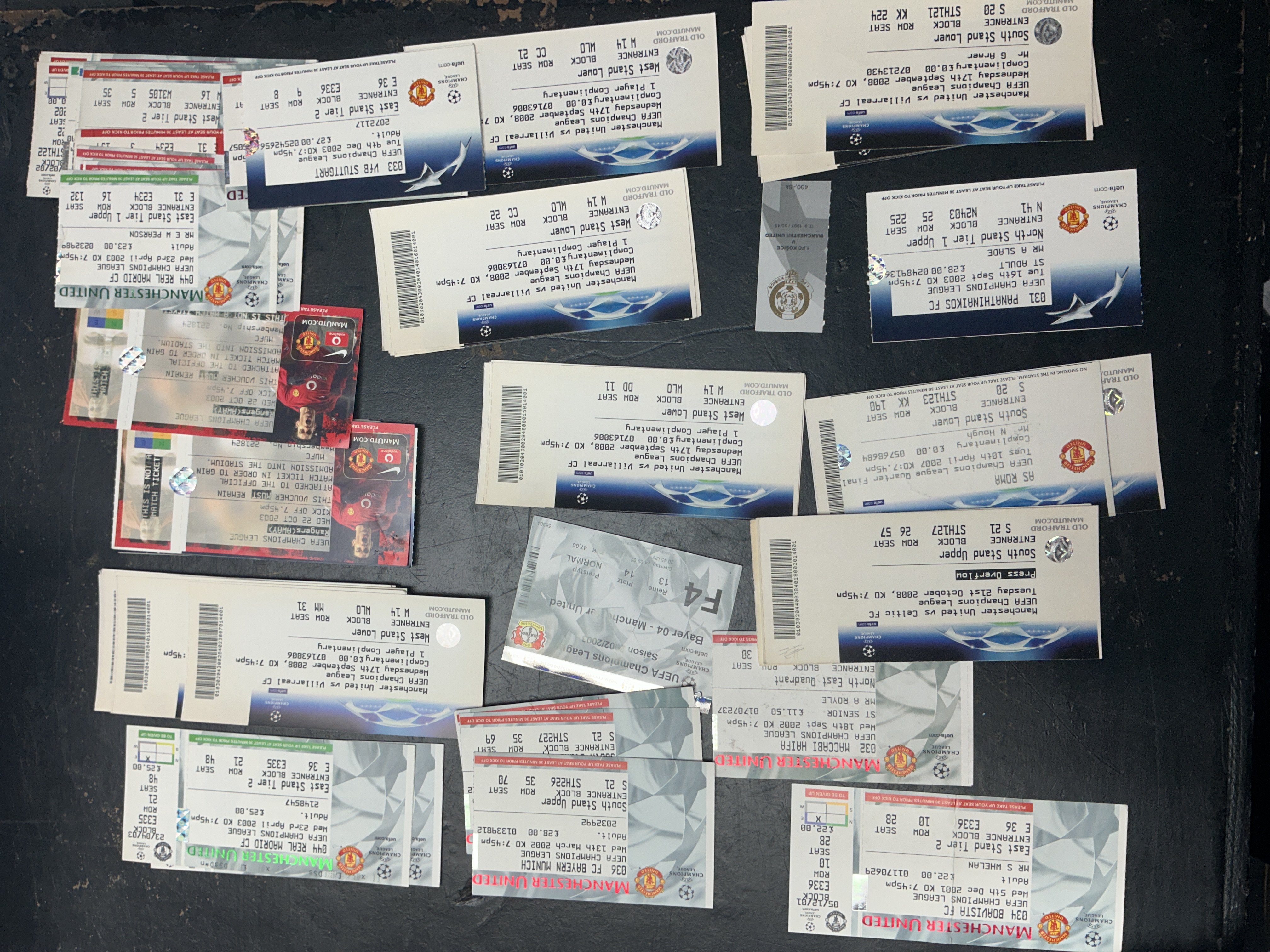 Manchester United European Competition Football Tickets: 1992 - 2009 with 135 home and 73 away. Includes UEFA Cup and ECWC tickets. Press and player tickets/passes included with some signed. Duplication. (200+)