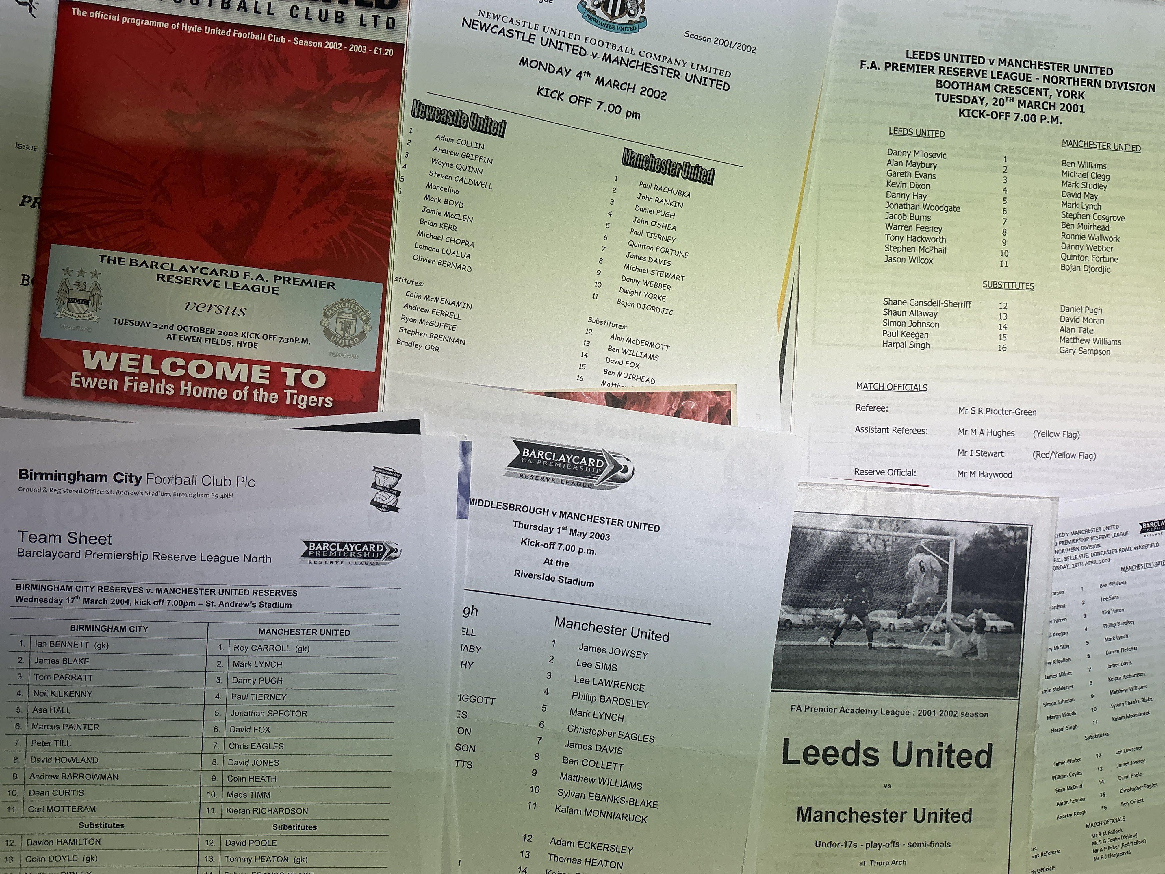 Manchester United Away Reserve Football Programmes: Majority sheets from 98/99 to 2004/2005 with some being team sheets including Far East tour. Slight duplication. (100+)