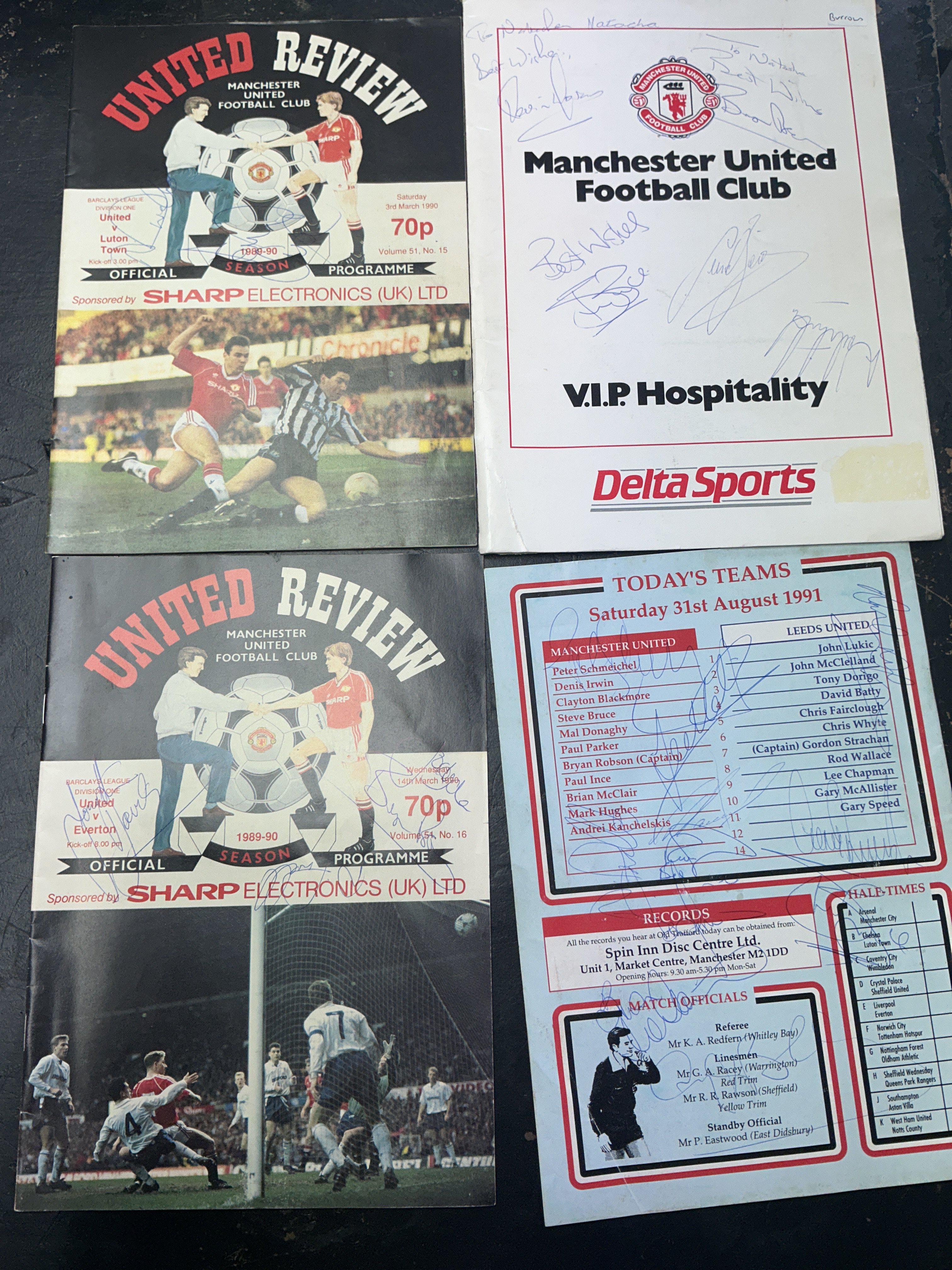 Manchester United Signed Football Menu: 5 autographs to include Bruce and Robson with some dedicated. C/W 4 programmes from around 1990 with many signatures. (5)