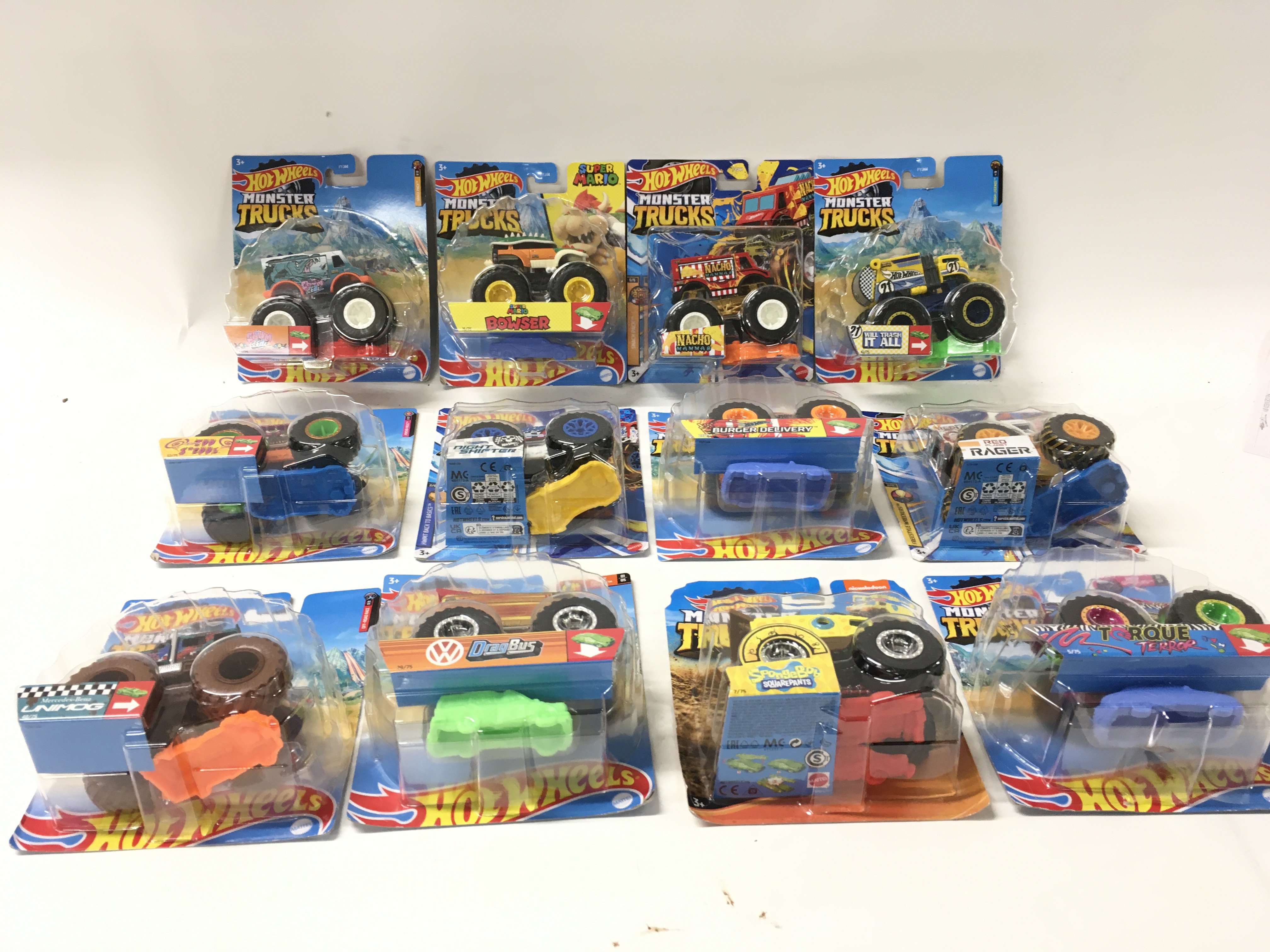 A collection of unopened Hot Wheels Monster Trucks 1:64 scale. Includes SpongeBob SquarePants..Super Mario Bowser plus others.