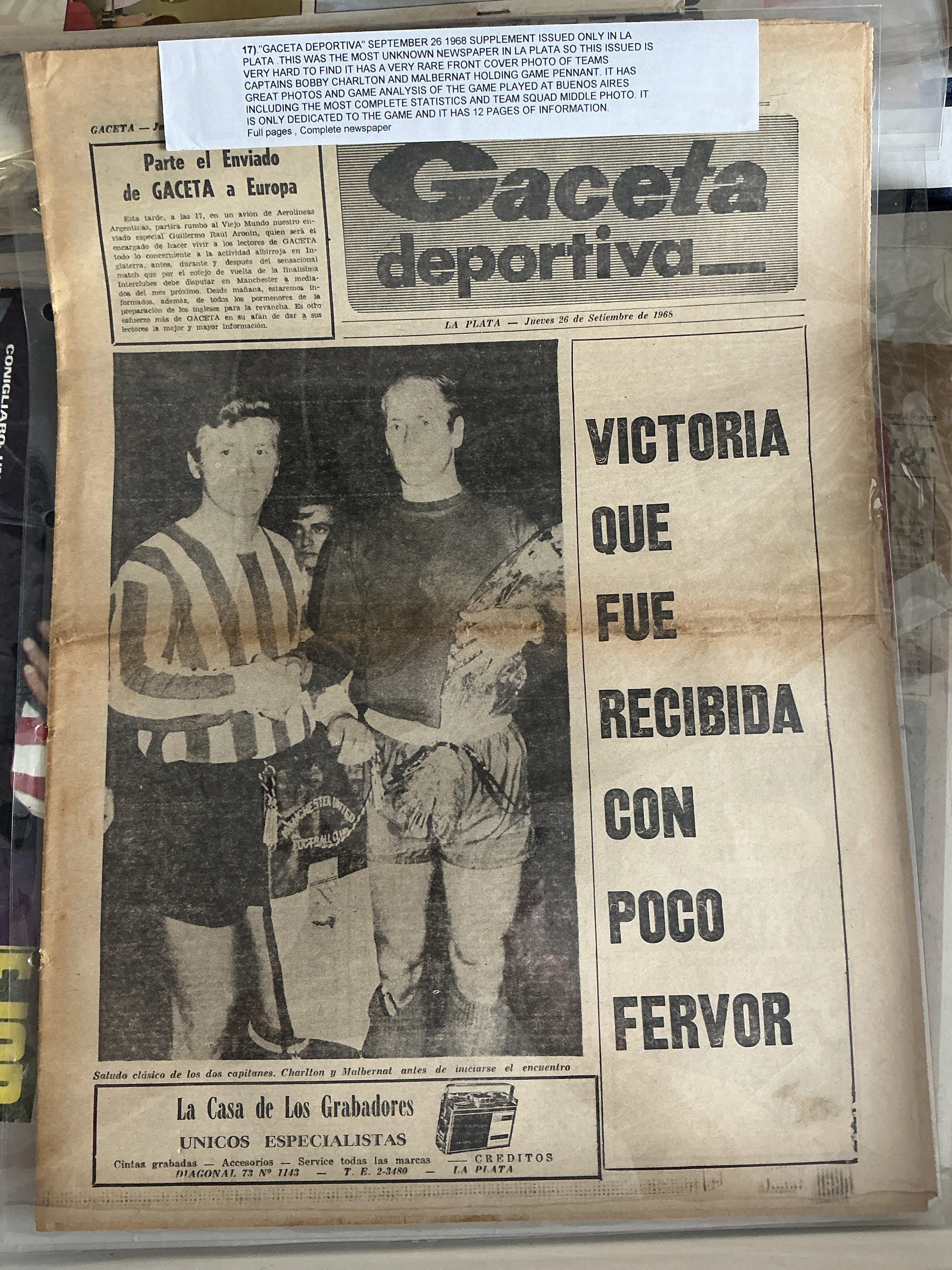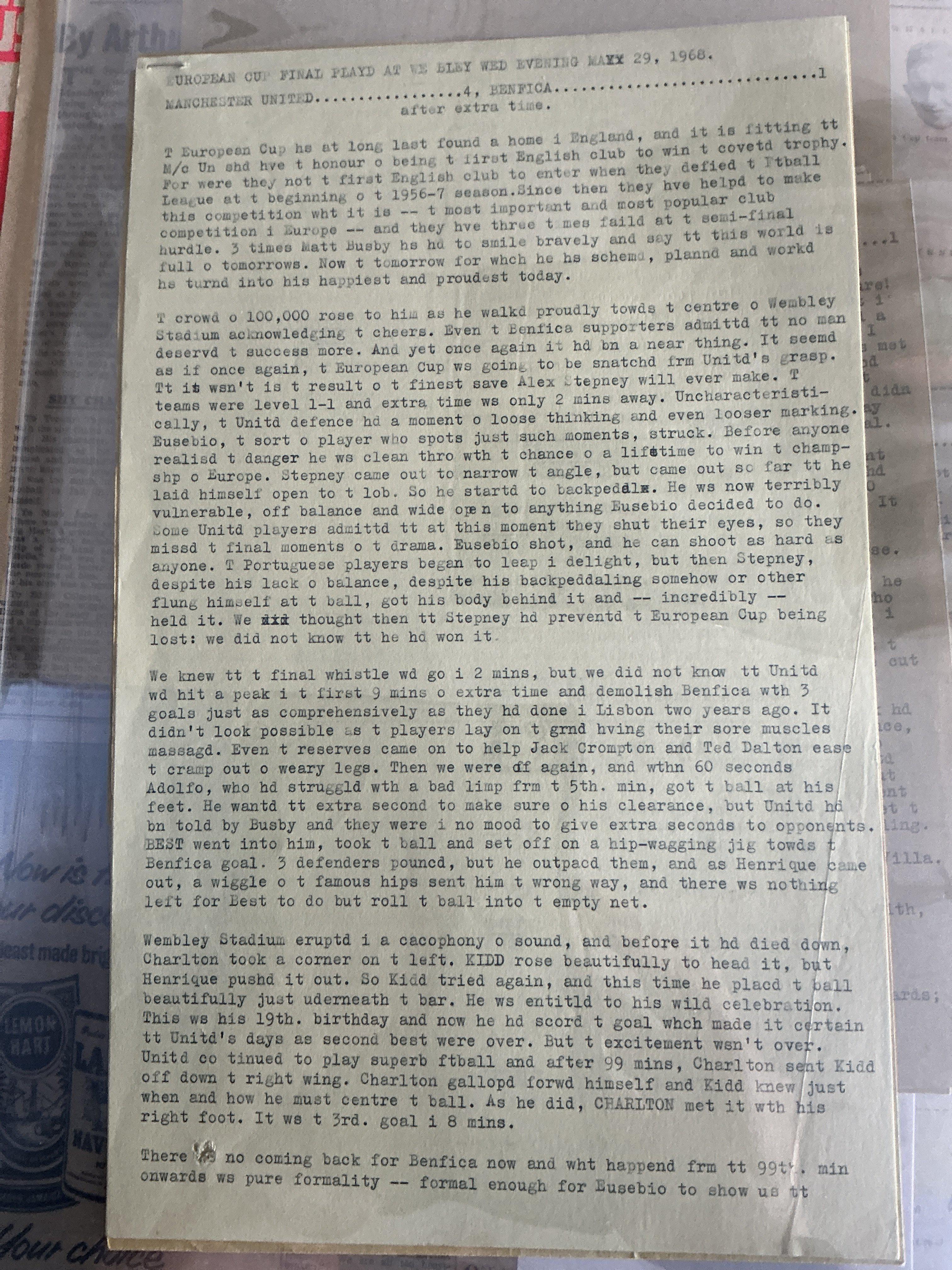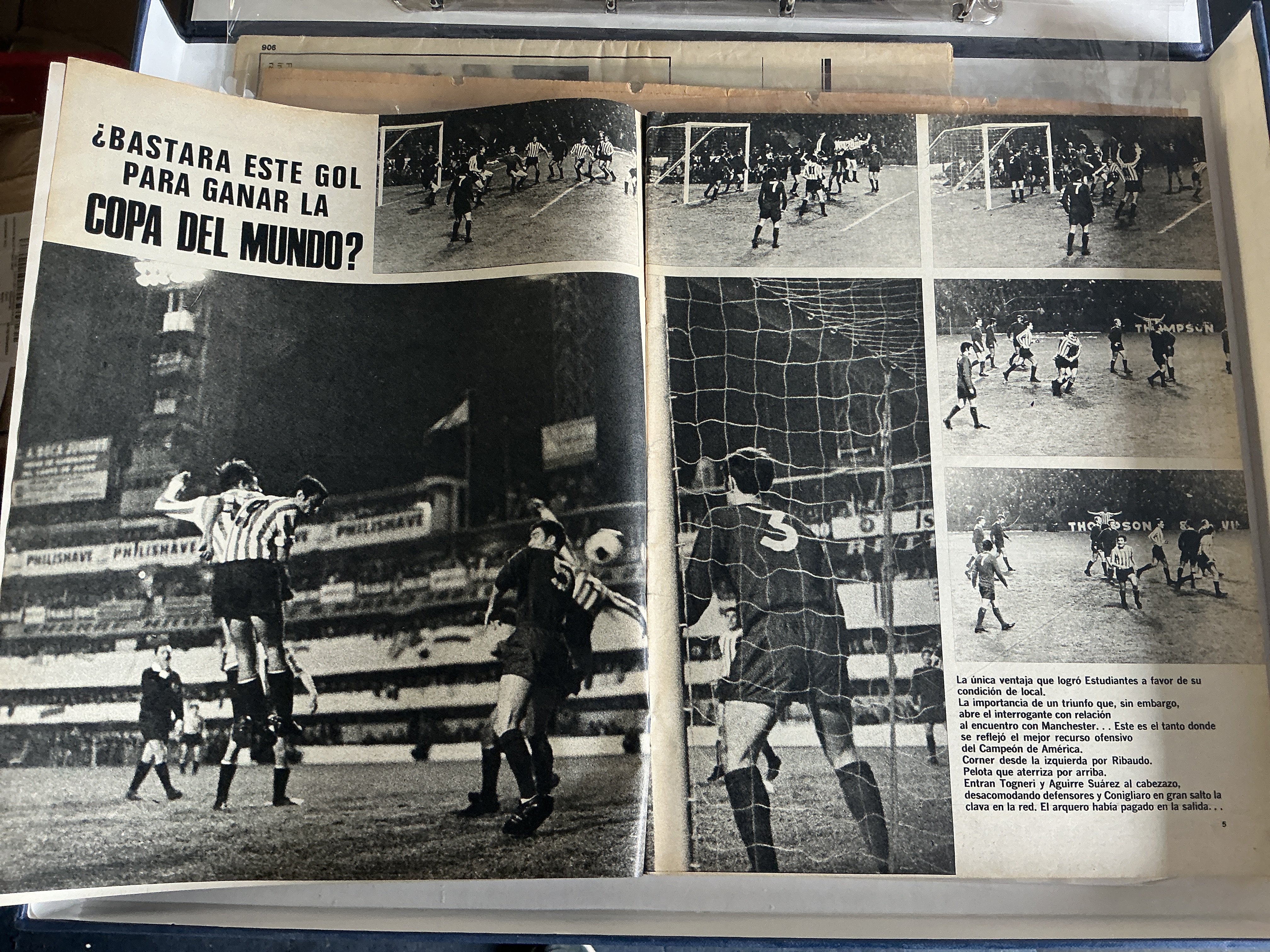 Manchester United Football Newspapers + Publications: Includes 1963 FA Cup Final, 2008 Moscow Times Champions League Final, 1968 El Grafico, Ken Wolstenholme typed match reports for Man Utd matches 1966 v Benfica, 1963 Coventry FA Cup, 1967 Charity Shield, 1958 FA Cup Final, 1968 European final and semi. Club World Championship v Estudiantes in 1968. (Est 50).