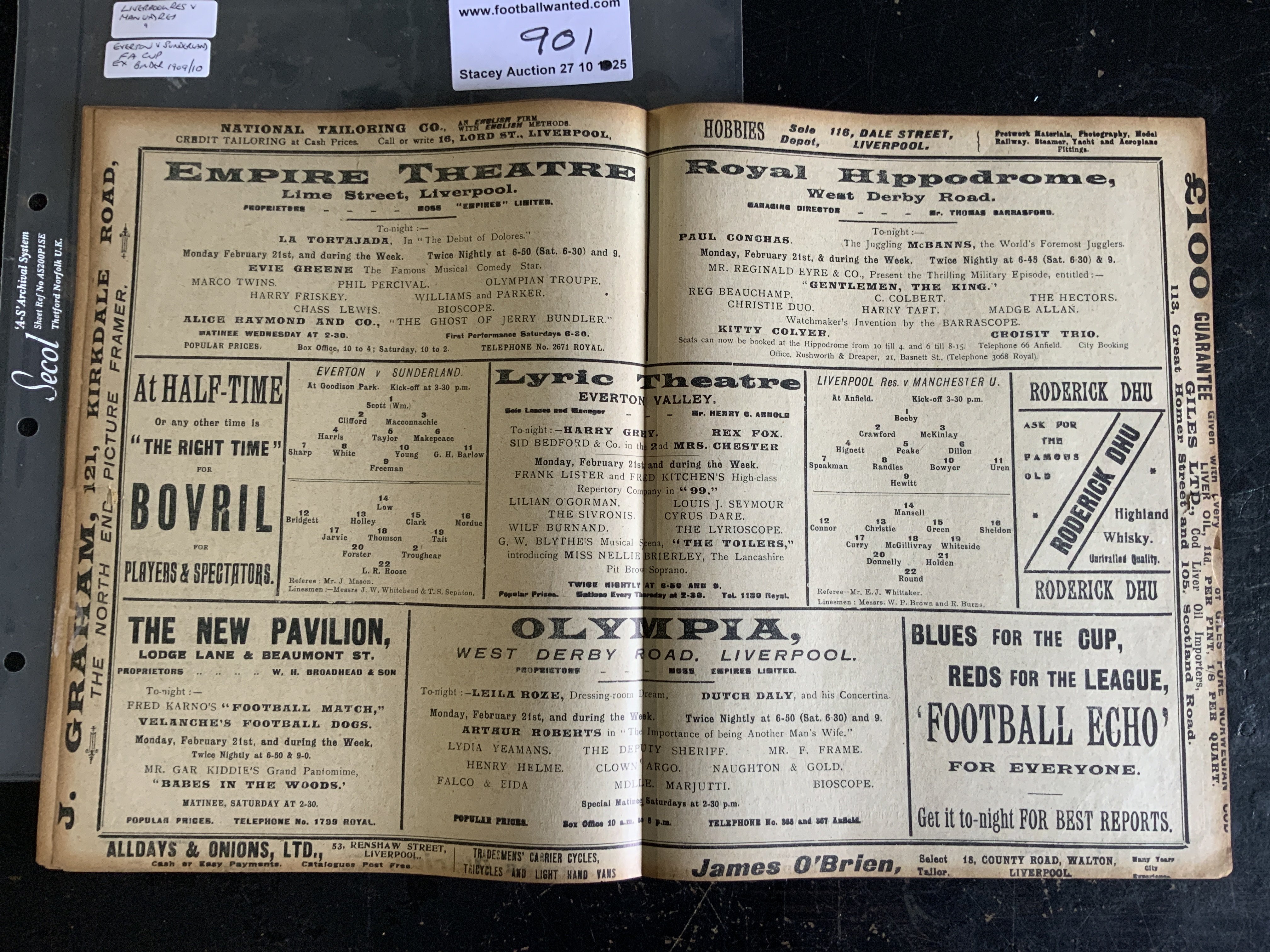 1909 - 1910 Liverpool v Manchester United Reserves Football Programme: Doubles up as Everton v Sunderland FA Cup. Rare item which is ex bound with covers. Like all these they are slightly brittle and there is a tiny piece missing from border.