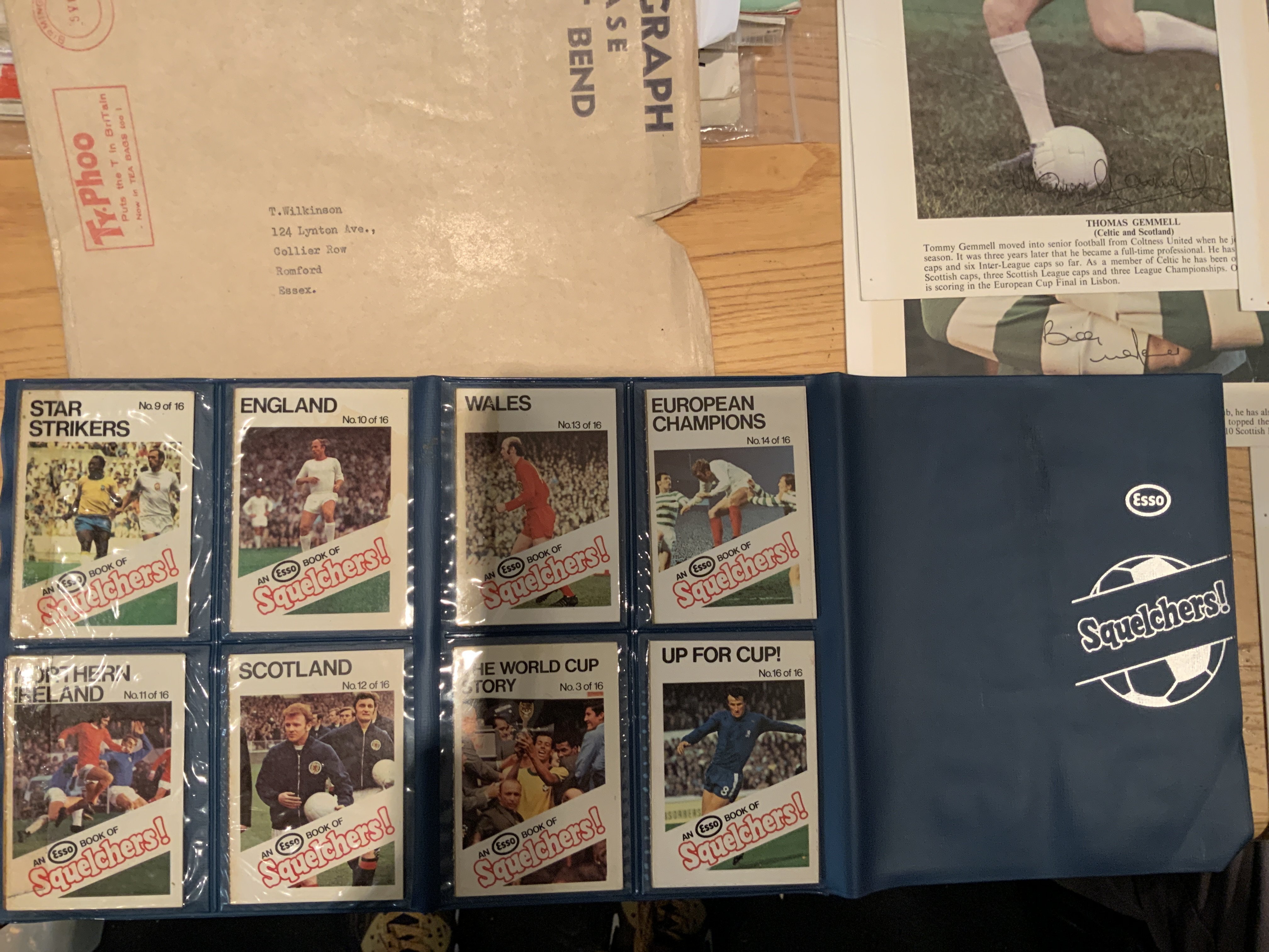 Typhoo Large Football Tea Cards: Whilst in good condition these 47 cards have pin holes in corners where previously displayed. Includes 2 different Bobby Moores and George Bests. C/W full set of Squelchers in original album.