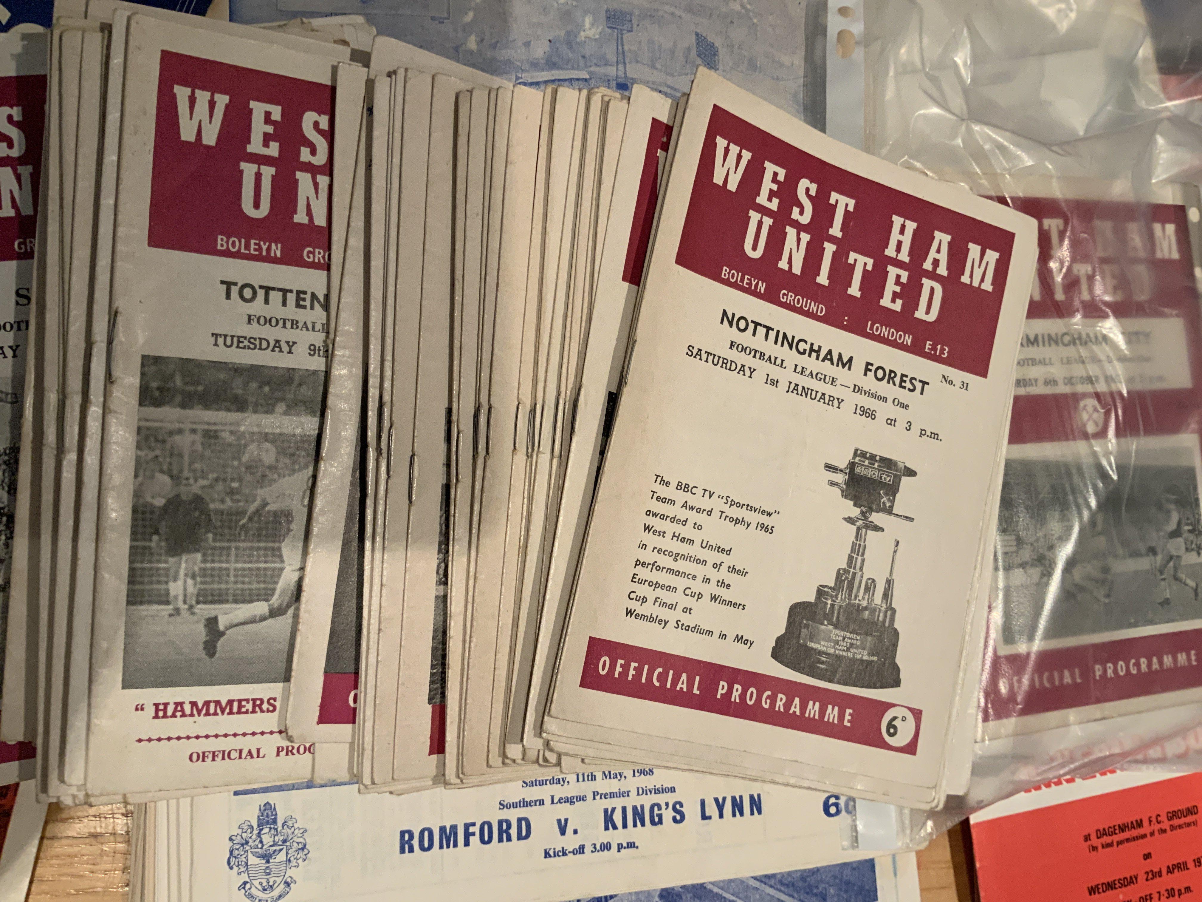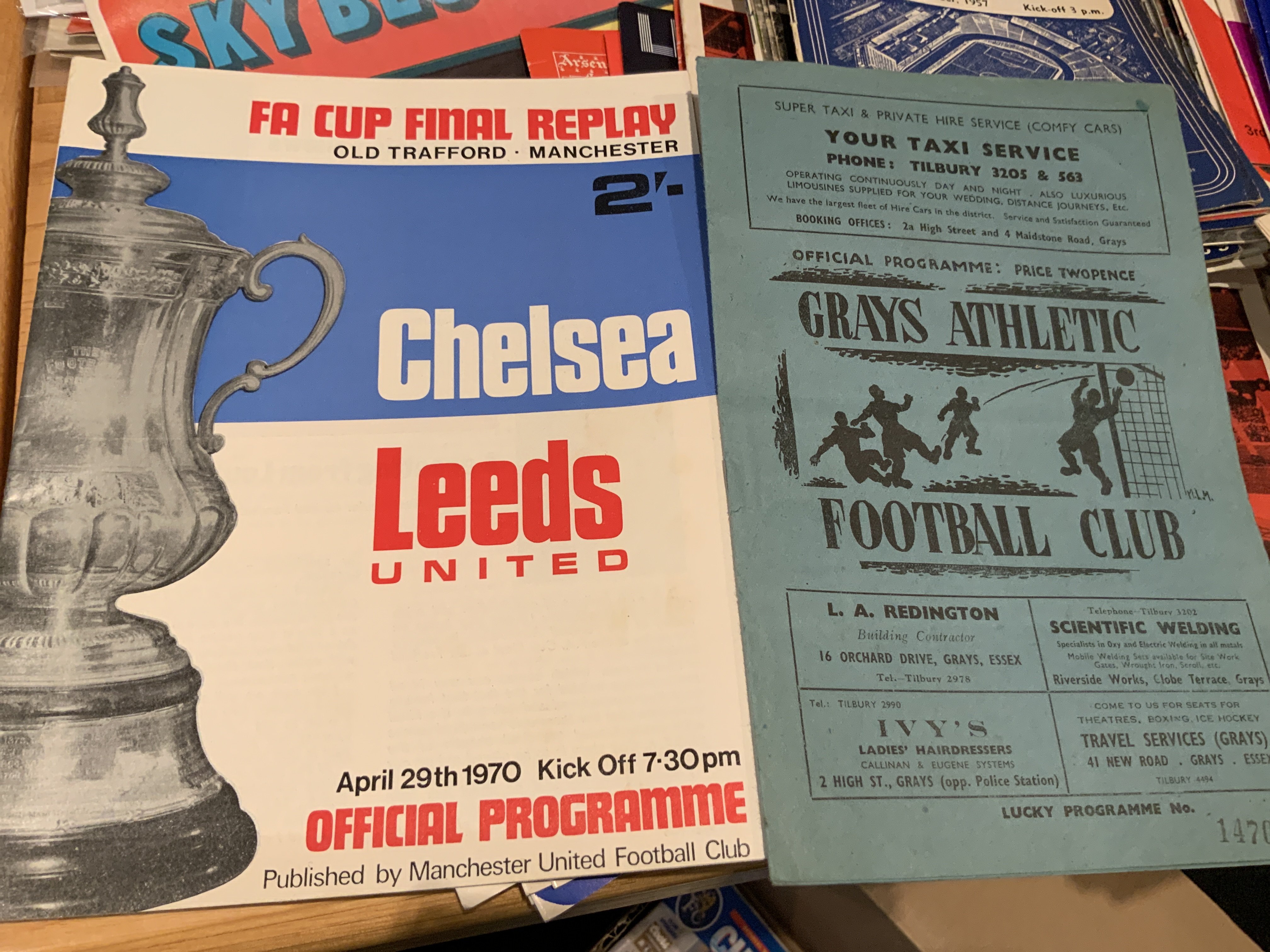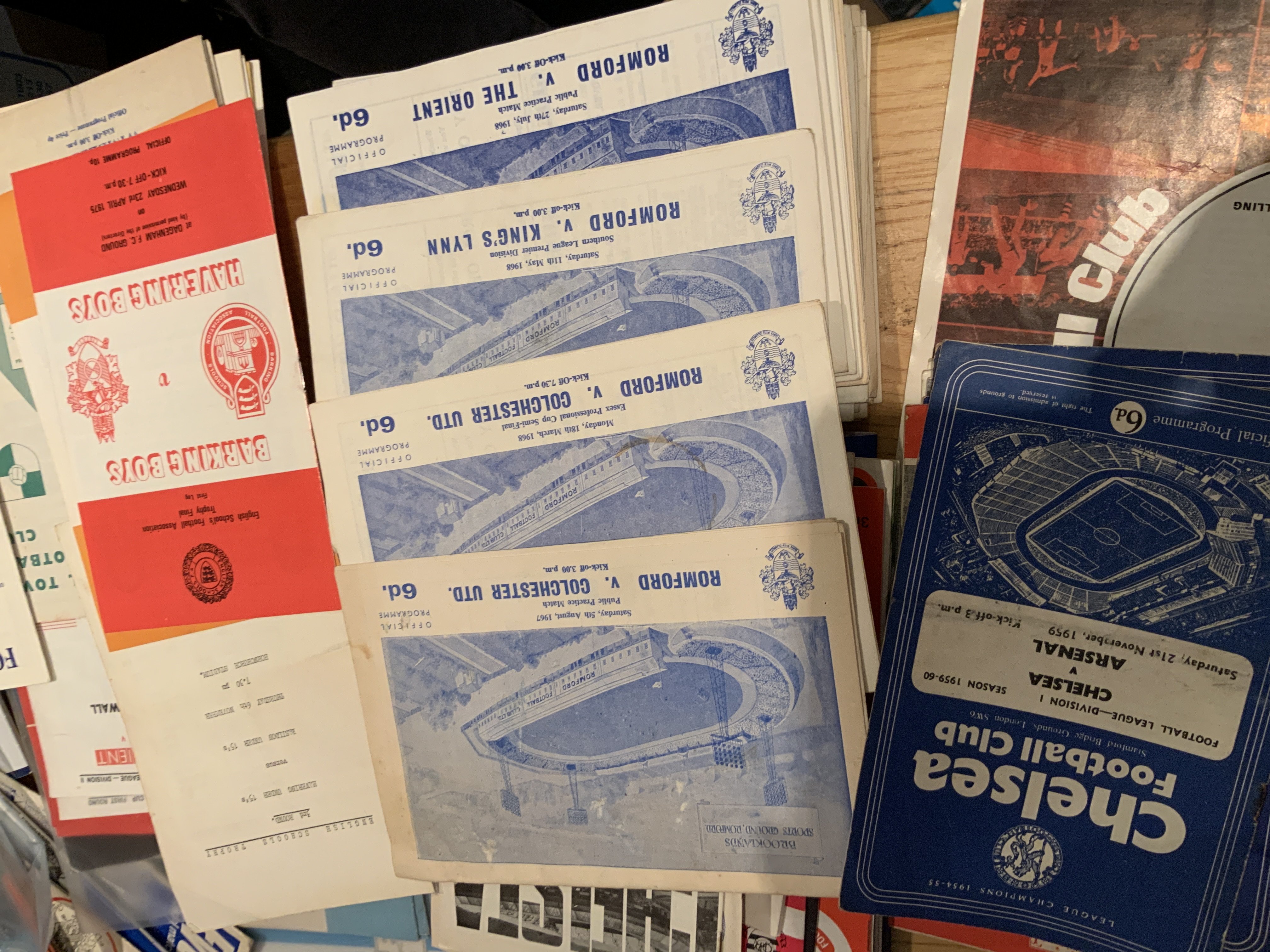 London Club + Big Match Football Programmes: Many 1960s to include homes of Orient West Ham Tottenham Romford Chelsea and some more modern. FA Cup final programmes and magazines to include 1970 replay. There are some Chelsea related magazines and newspapers also. Spotted an Essex Senior Cup 1951 semi final at Grays amongst the non league which was between Briggs Sports and Tilbury. (Box)