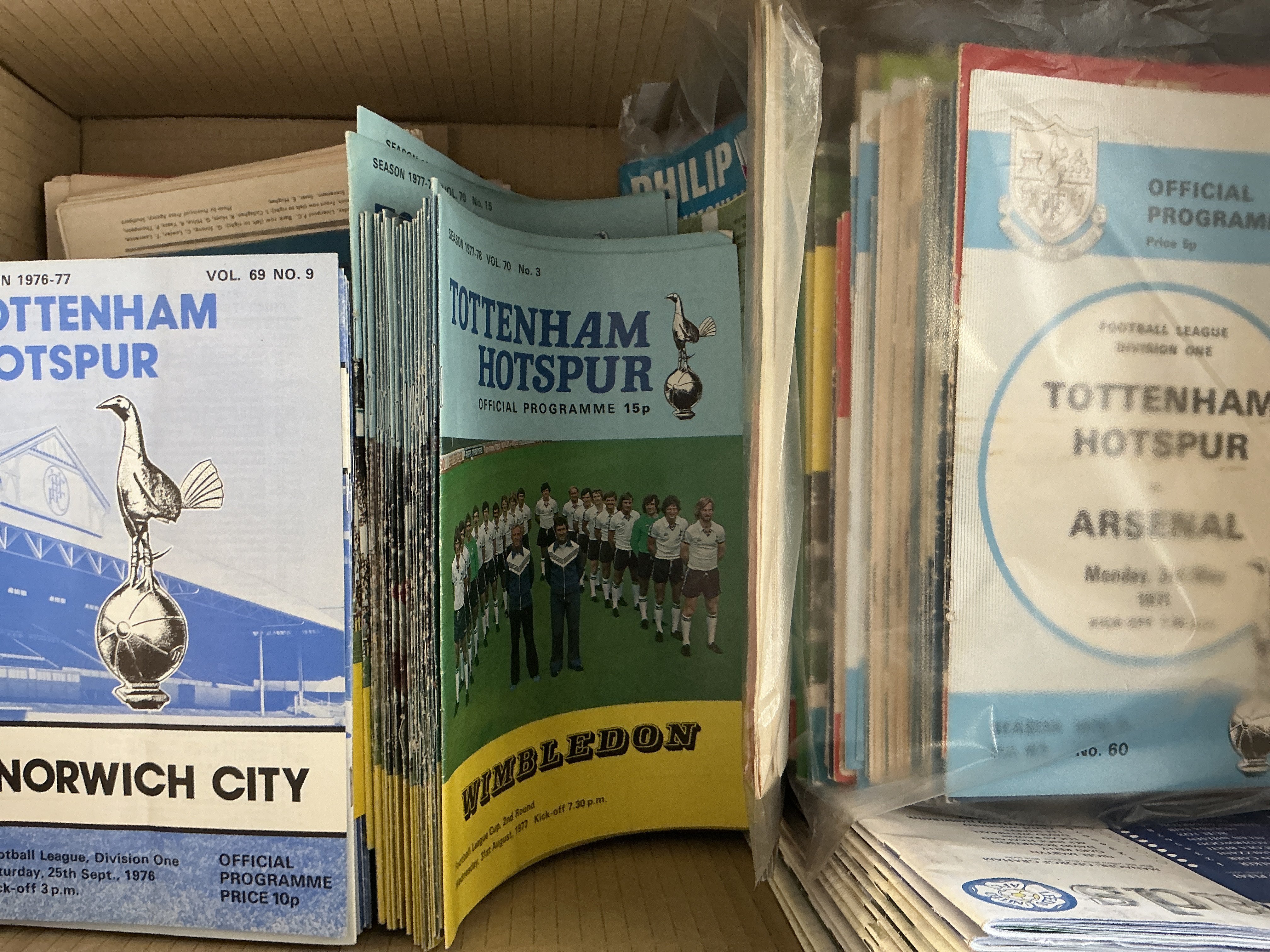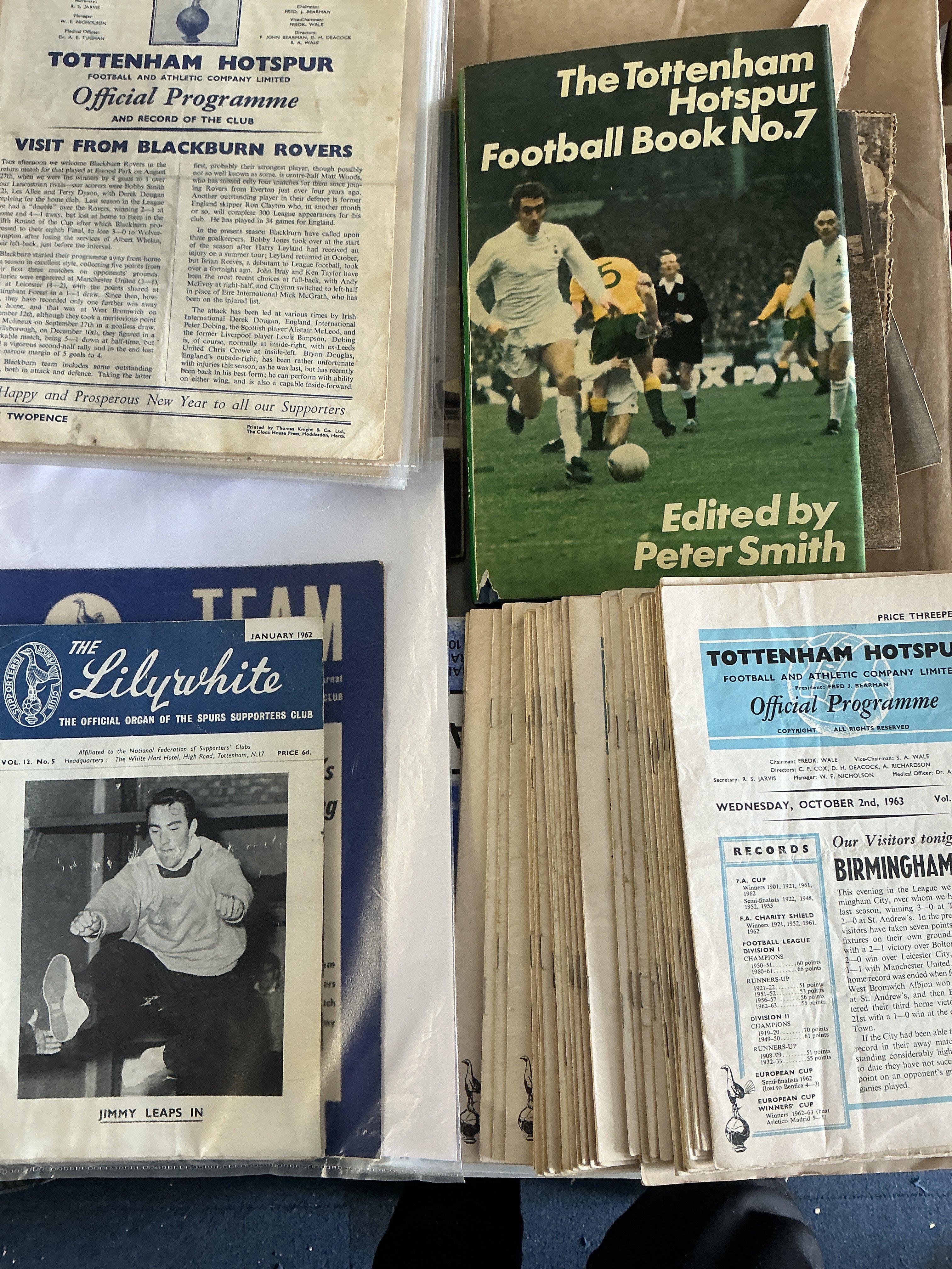 Tottenham Football Programme + Memorabilia Box: 12 homes from 60/61 and quantities of 60s and 70s homes. C/W some Lillywhite magazines from volume 12. (Box)