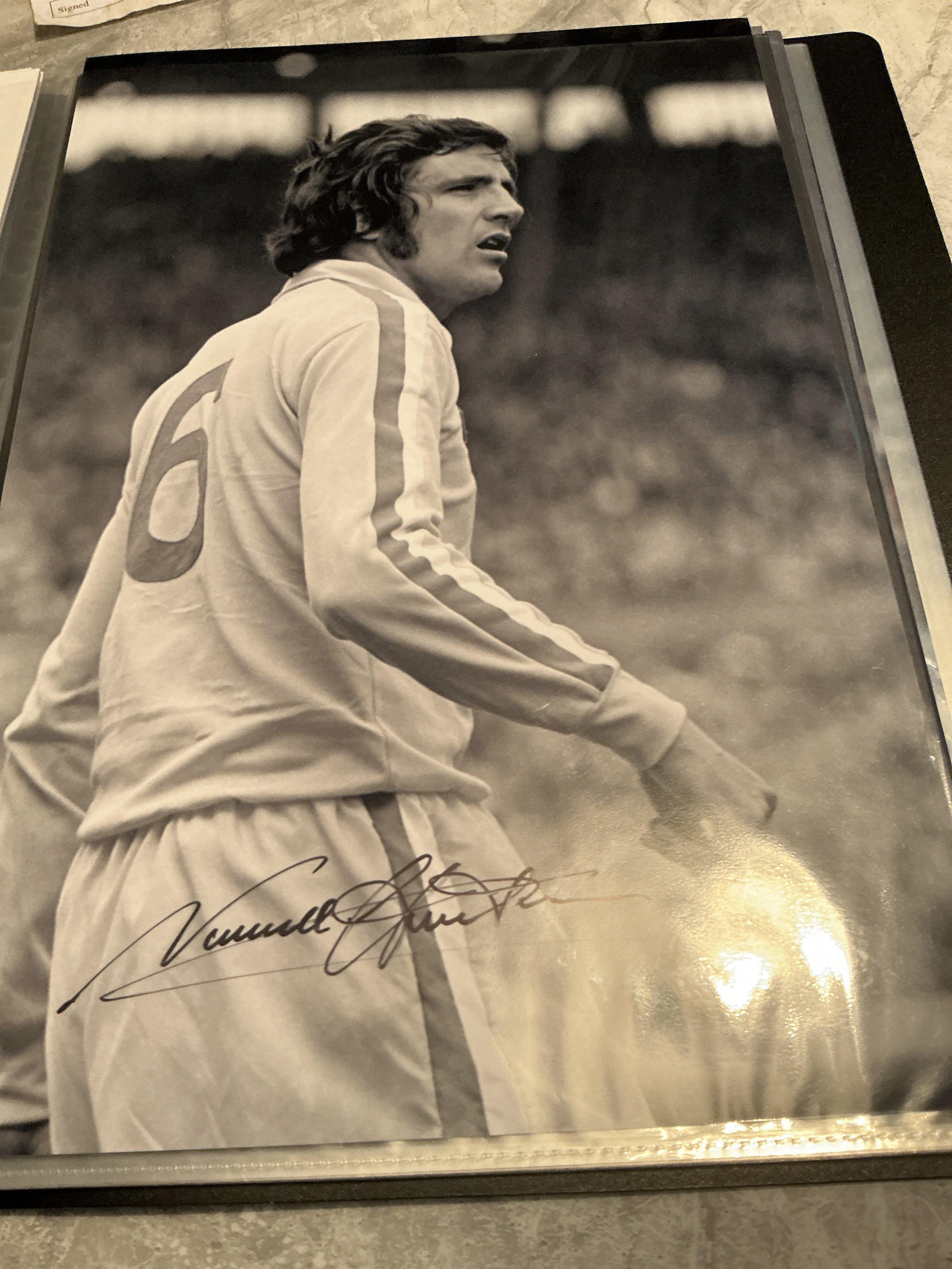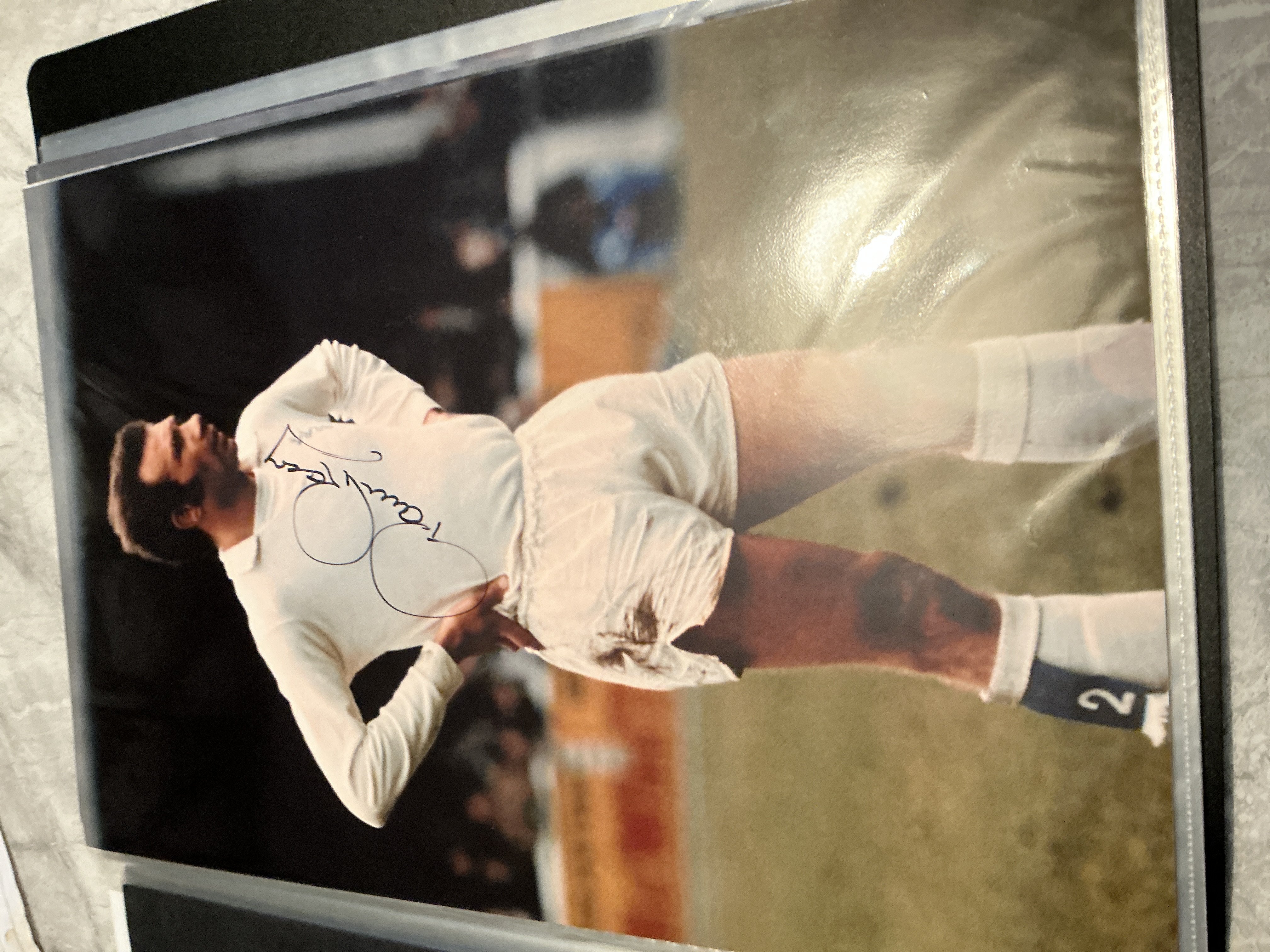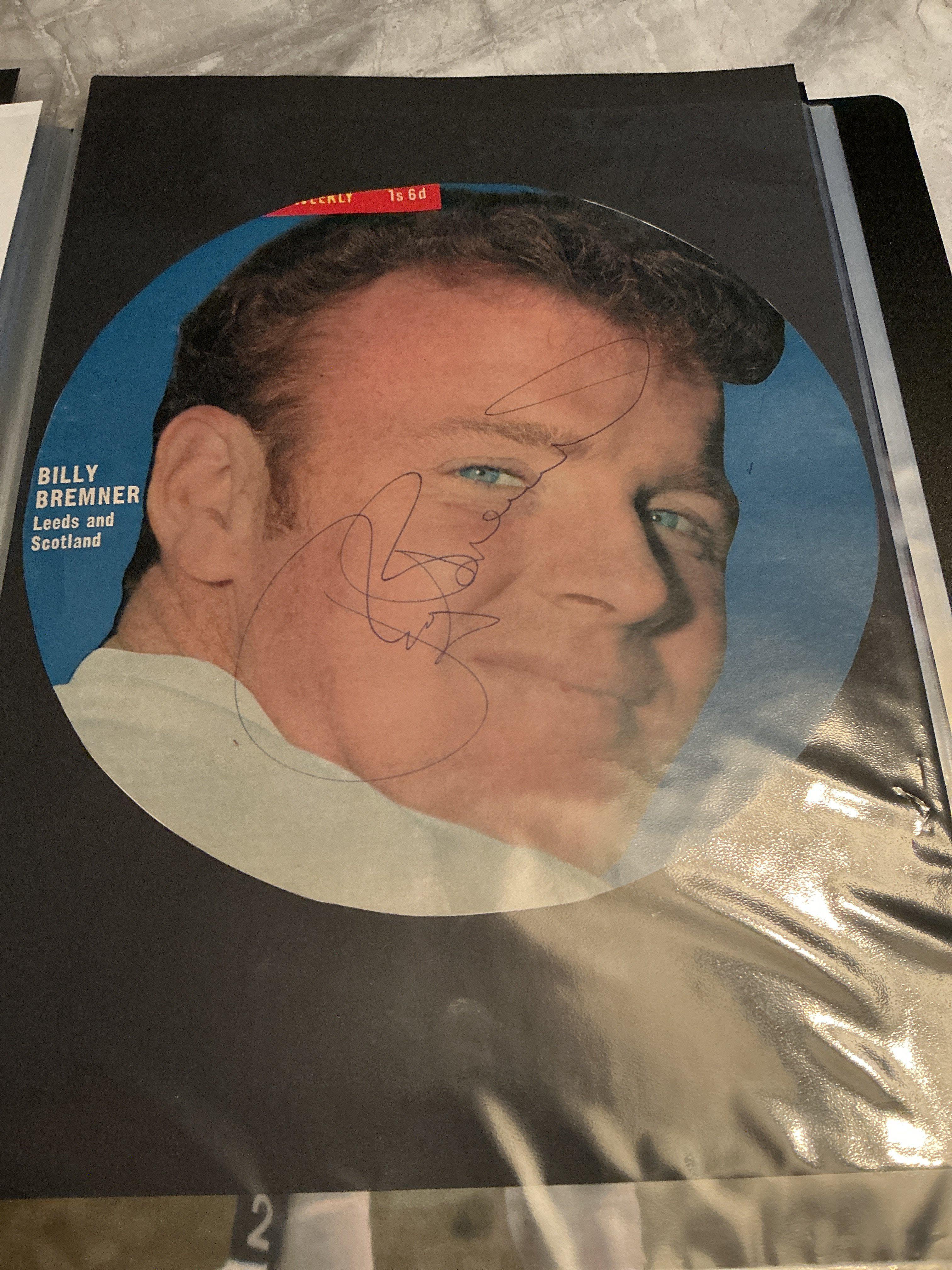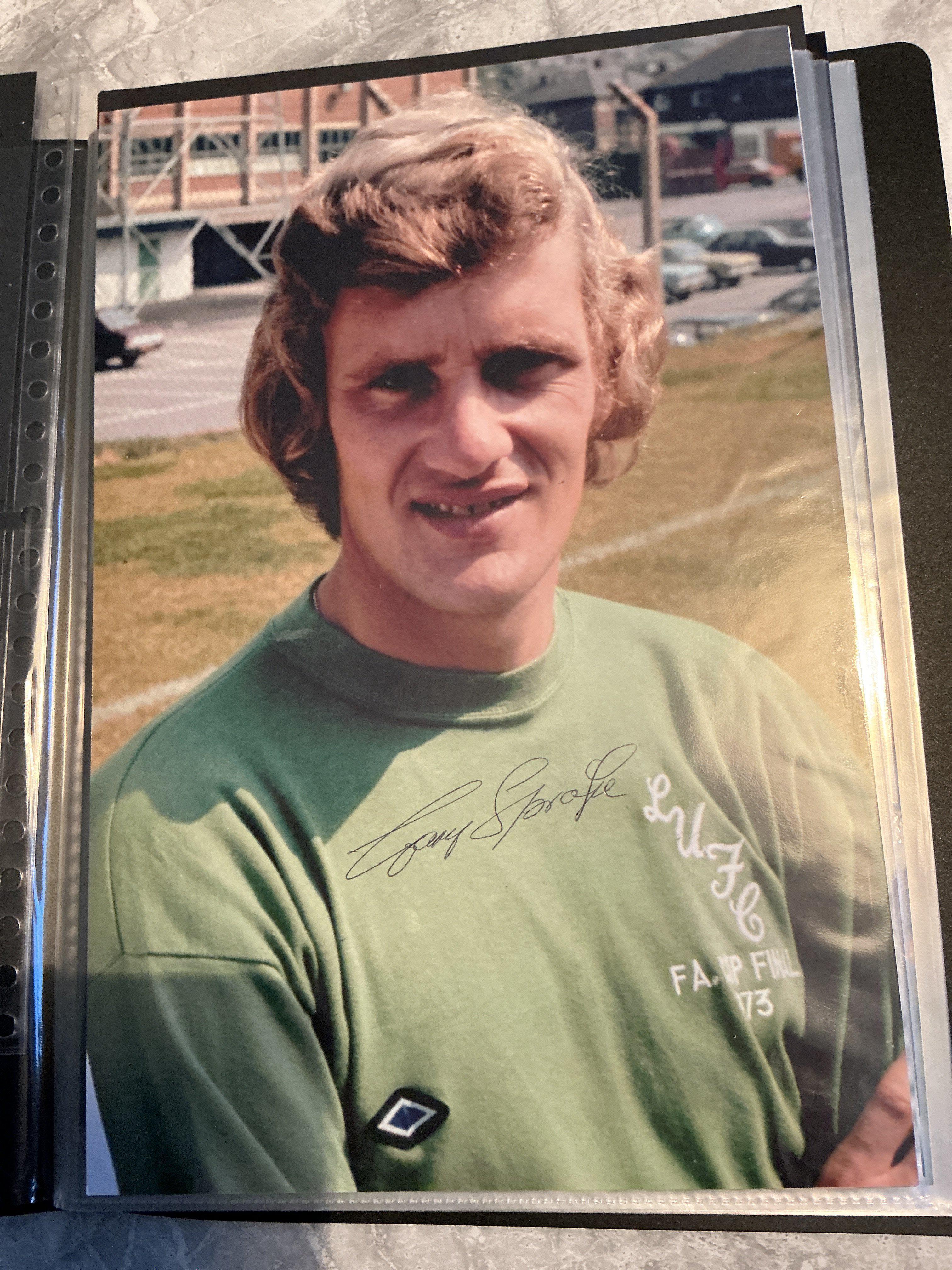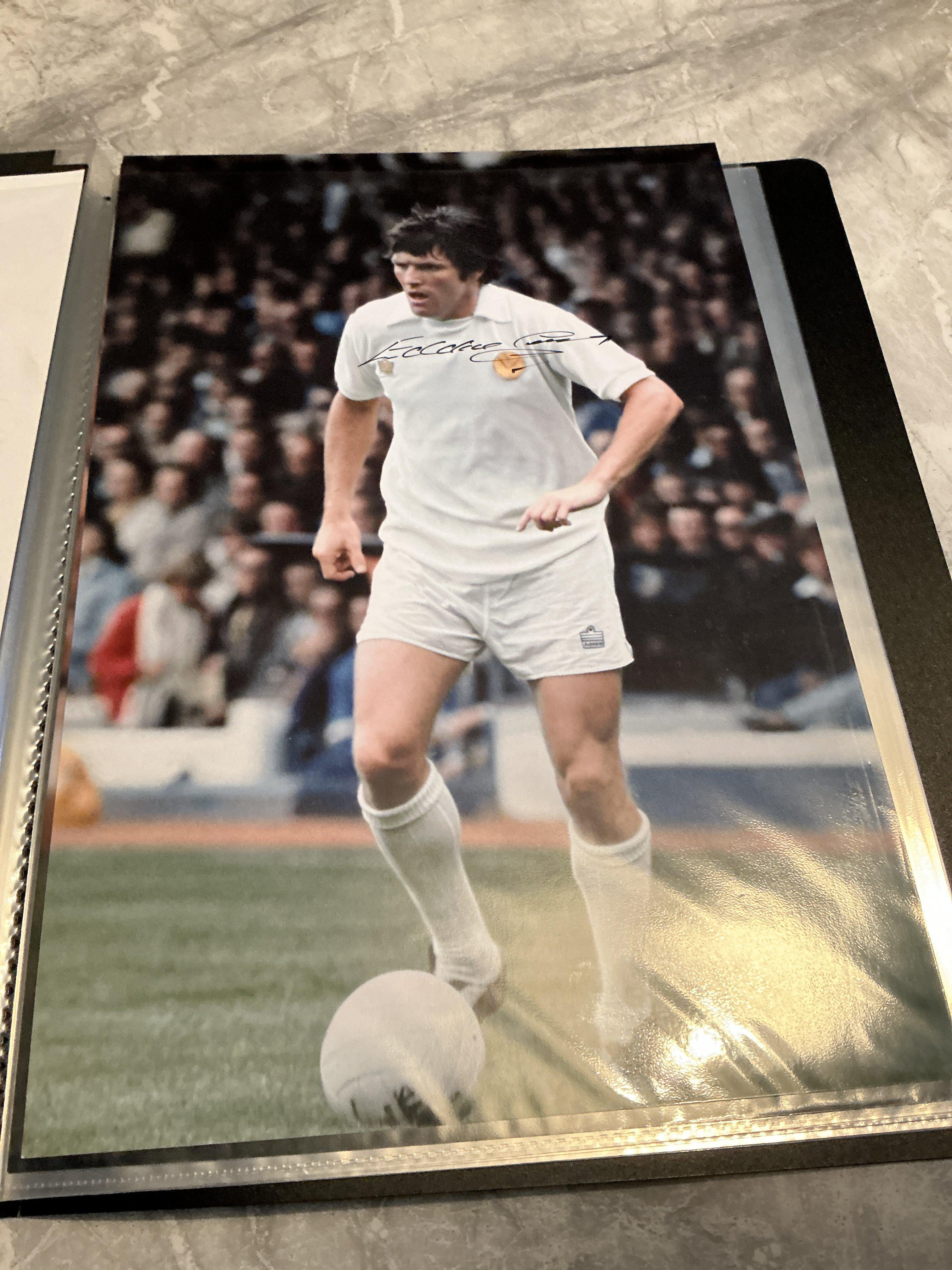 Leeds United Early 1970s Signed Football Photos: 12 x 8 inch photos hand signed by Sprake Harvey Bates Charlton Hunter Reaney Lorimer Giles Gray and Jones. Signed at organised event when the Revie statue got unveiled. C/W Bremner magazine picture and Revie yellow card and a Leeds FA Cup rosette. Neatly kept in collectors folder.