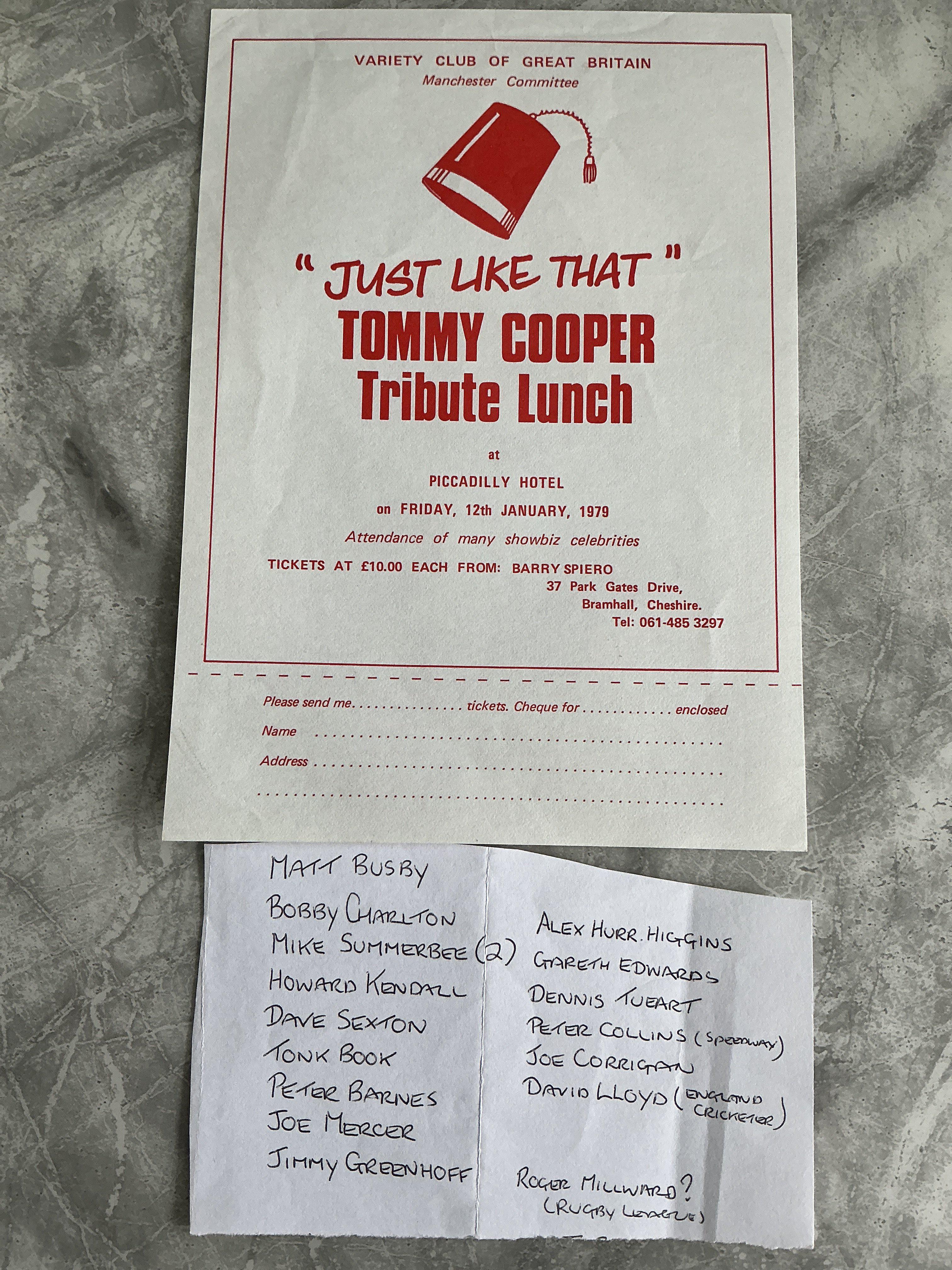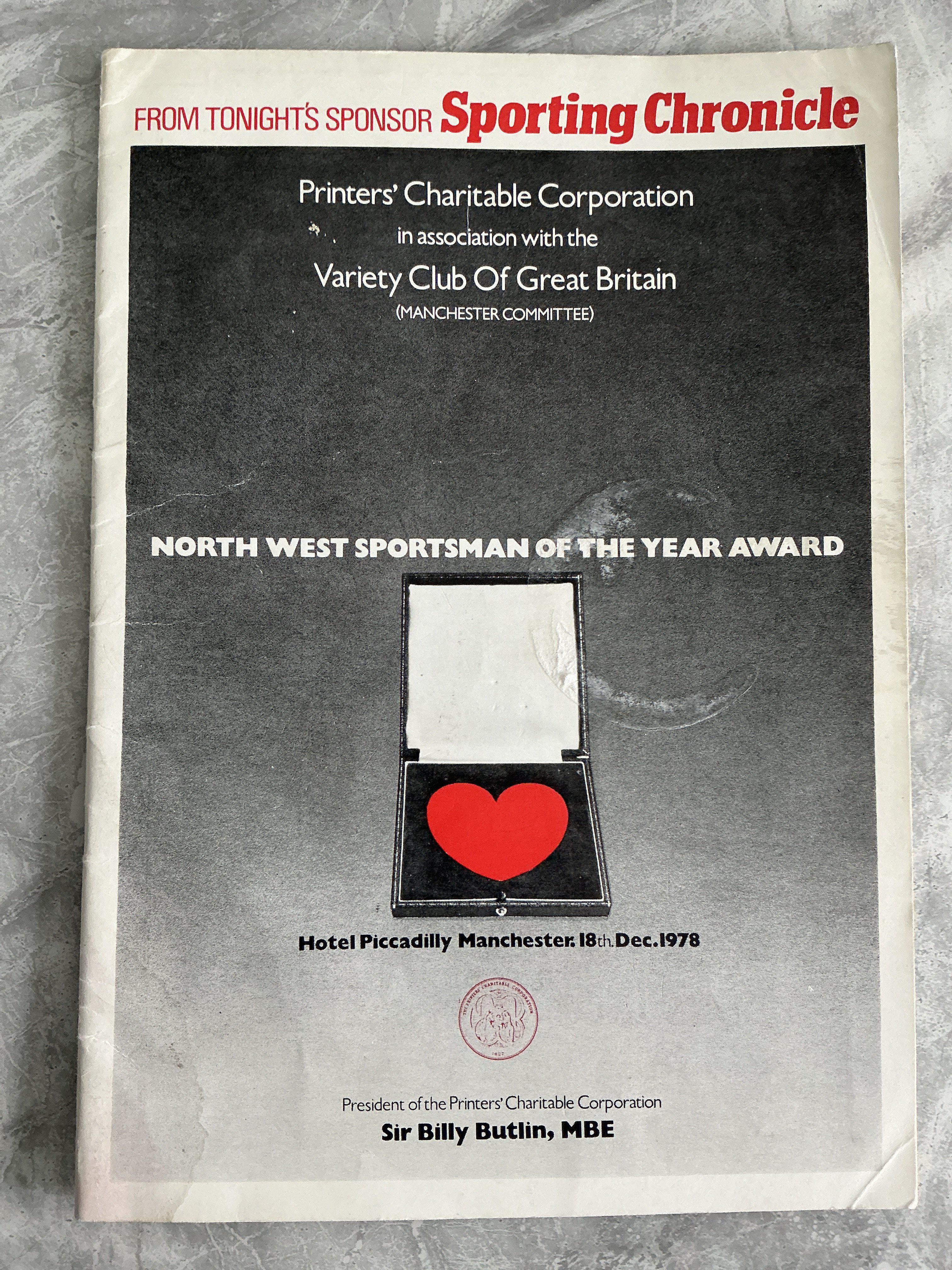 1978 Manchester United + City Signed Sportsmans Menu: Large menu for the 1978 North West Sportsman Of The Year at the Piccadilly Hotel. Inside back page is to collect autographs and we have identified 15 of the 16. Includes Matt Busby Bobby Charlton Dave Sexton Jimmy Greenhoff Mike Summerbee Howard Kendall Tony Book Peter Barnes Joe Mercer Dennis Tueart Joe Corrigan David Lloyd Alex Higgins and Gareth Edwards.