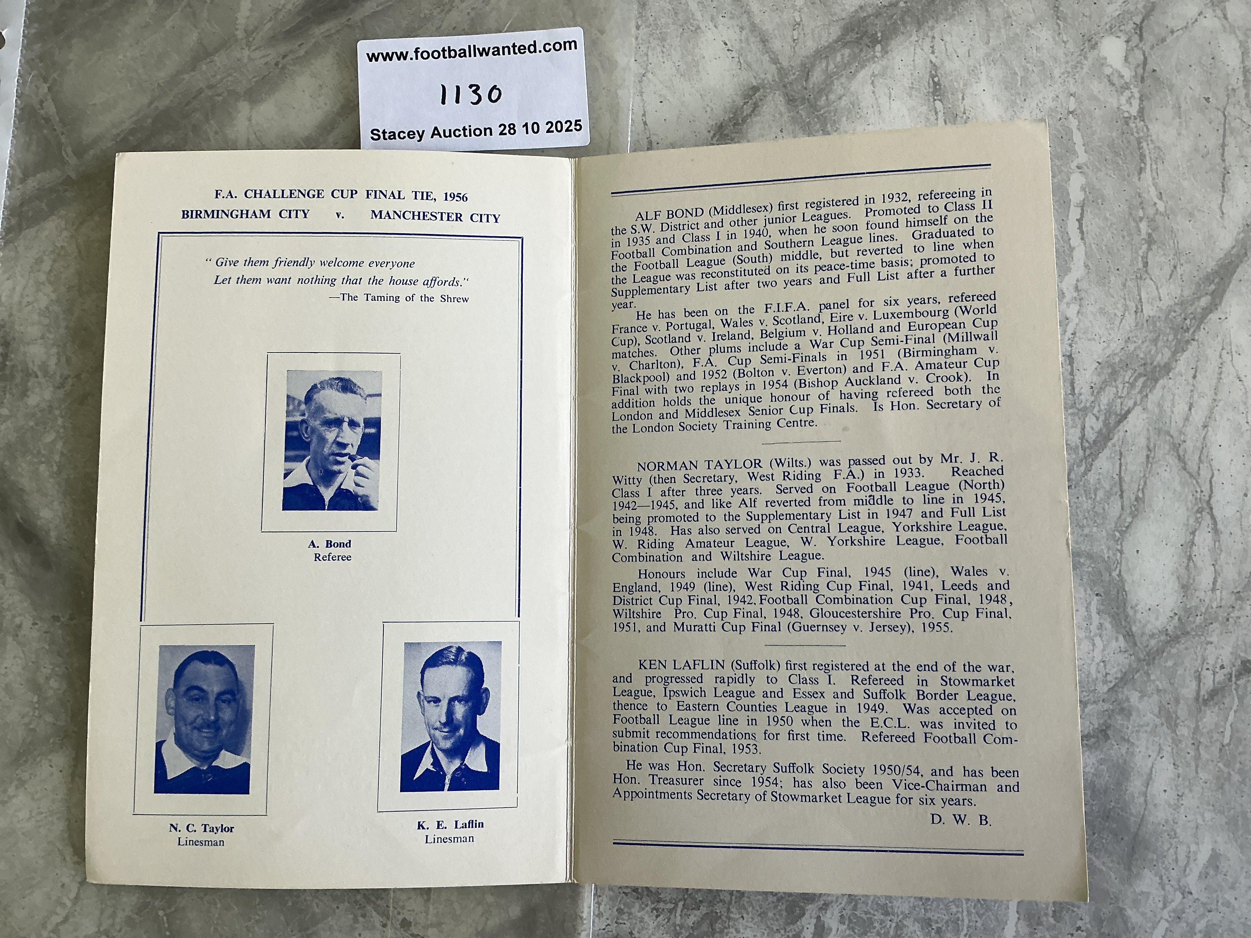 1956 FA Cup Final Eve Of Rally Football Programme: 4 page card for the Birmingham City v Manchester City final. Eve of the final rally is an annual event attended by the referee and linesmen in London the night before the final. Excellent.