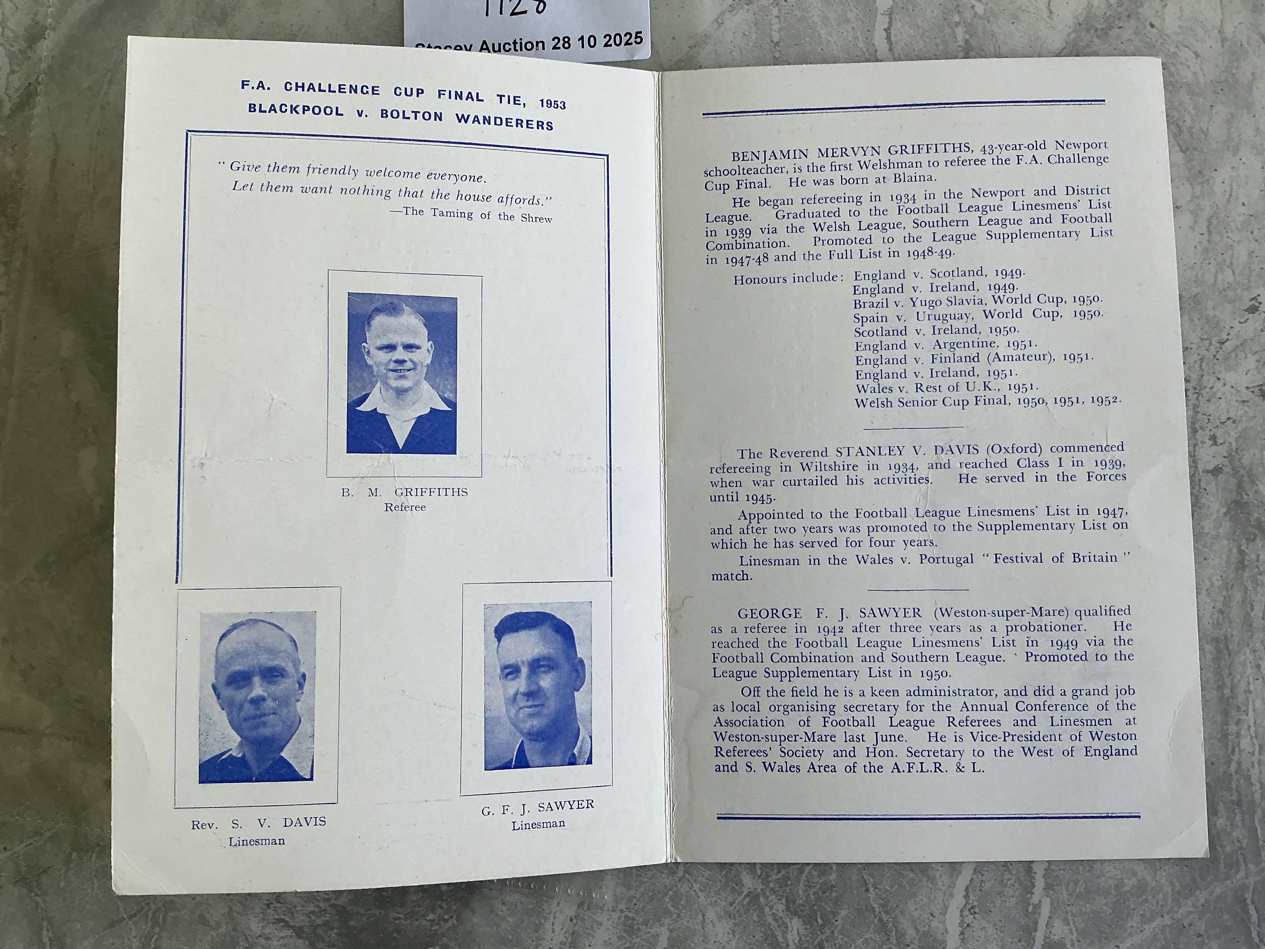 1953 FA Cup Final Eve Of Rally Football Programme: 4 page card for the famous Bolton v Blackpool Great Stans final. Eve of the final rally is an annual event attended by the referee and linesmen in London the night before the final. Excellent.