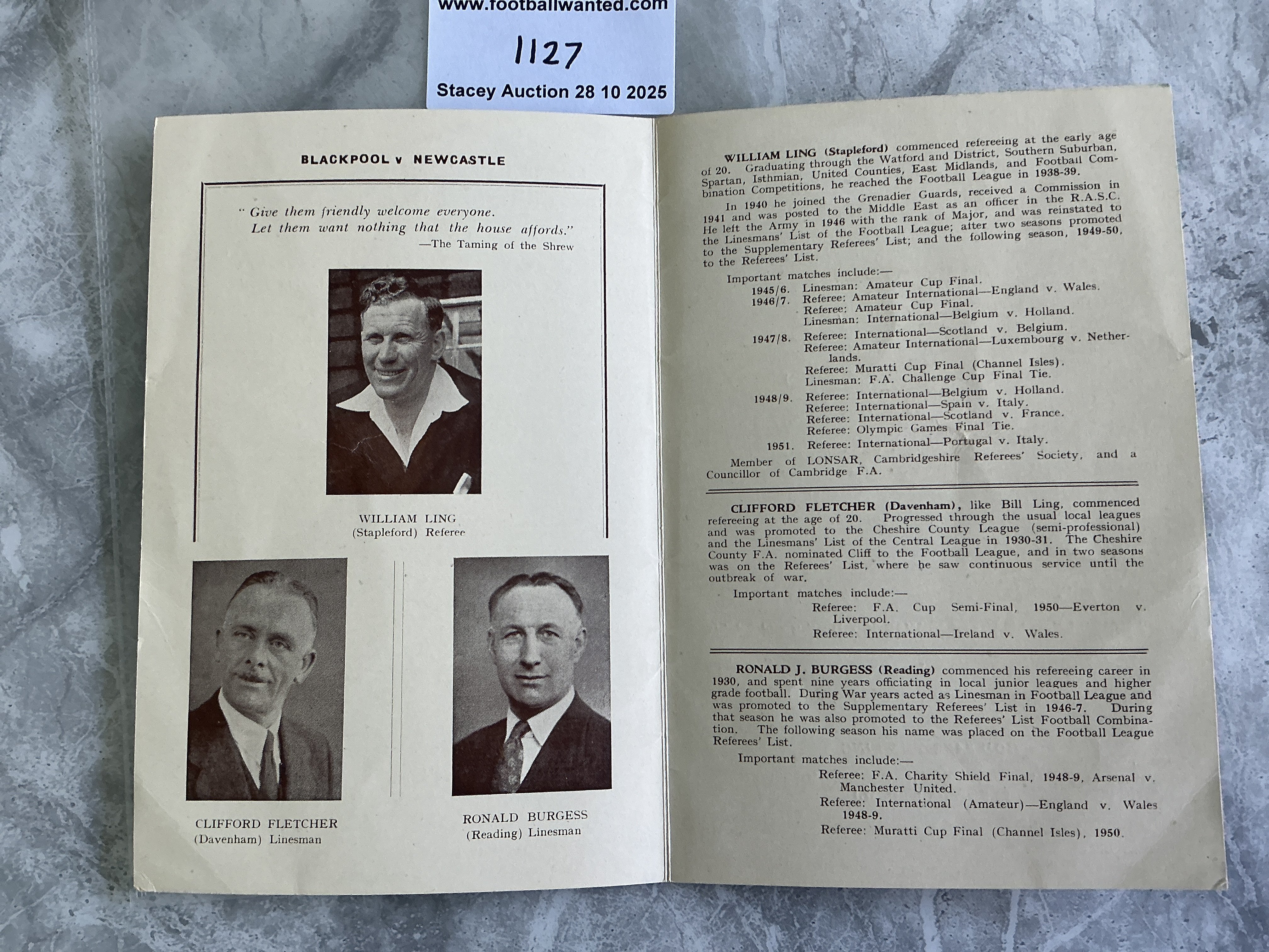 1951 FA Cup Final Eve Of Rally Football Programme: 4 page card for the Blackpool v Newcastle United final. Eve of the final rally is an annual event attended by the referee and linesmen in London the night before the final. Excellent.