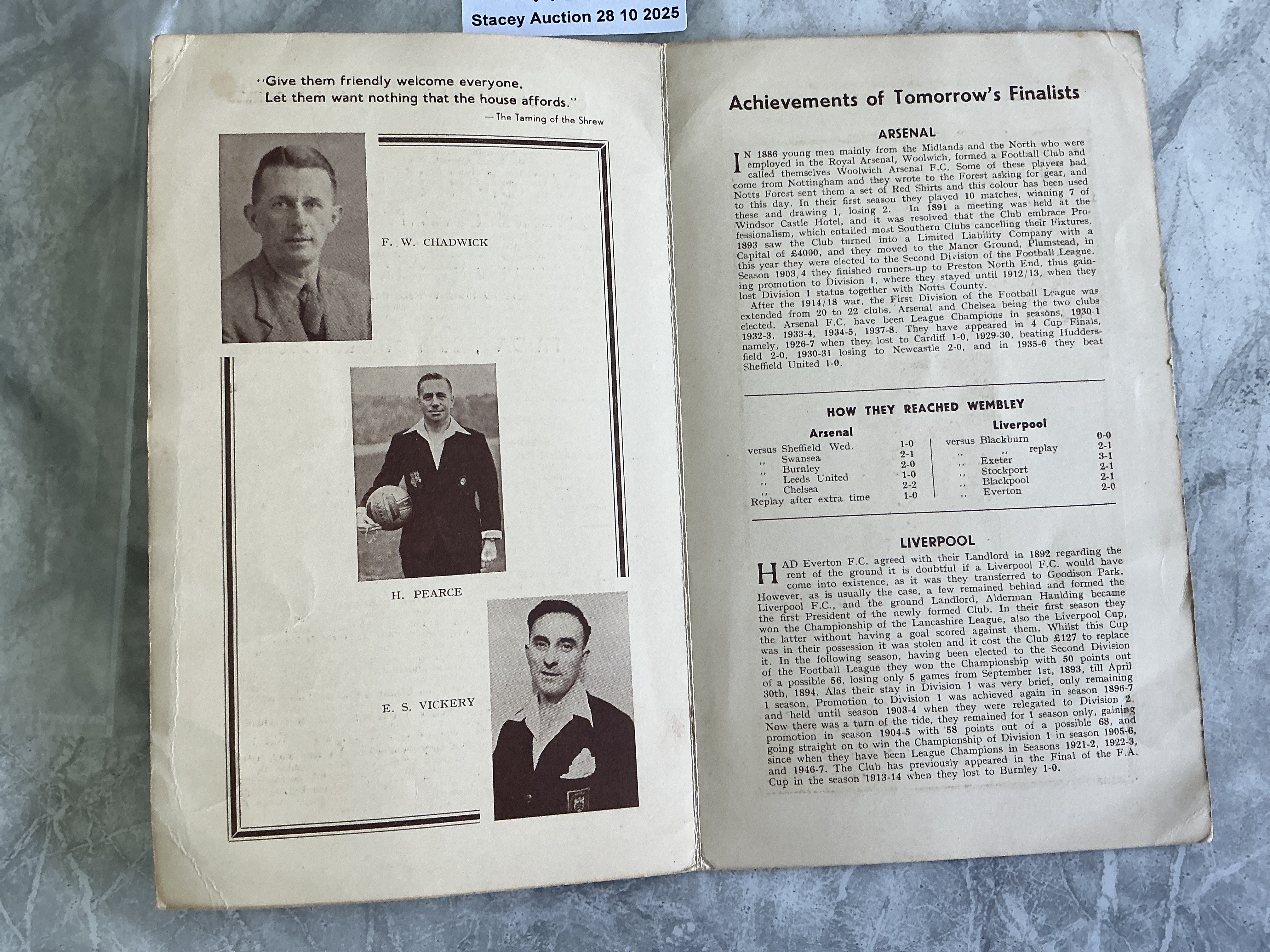 1950 FA Cup Final Eve Of Rally Football Programme: 4 page card for the Arsenal v Liverpool final. Eve of the final rally is an annual event attended by the referee and linesmen in London the night before the final. Excellent.