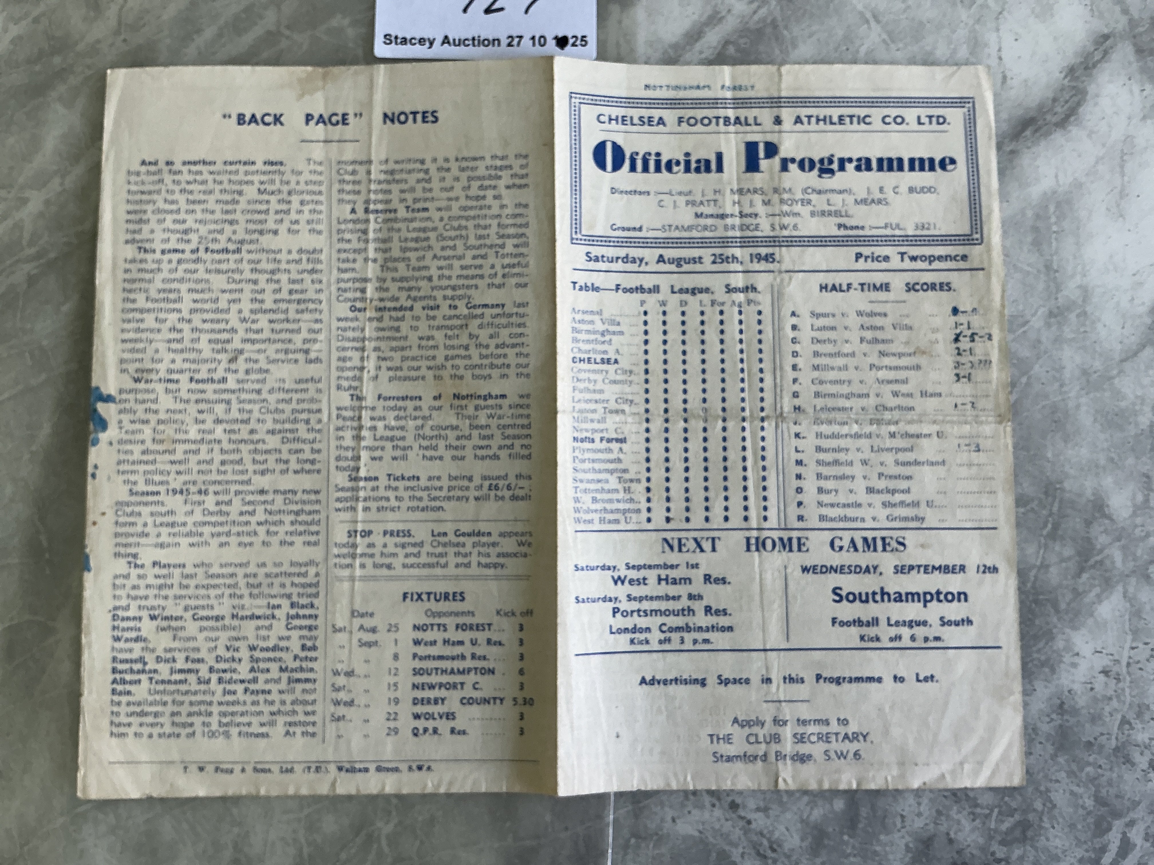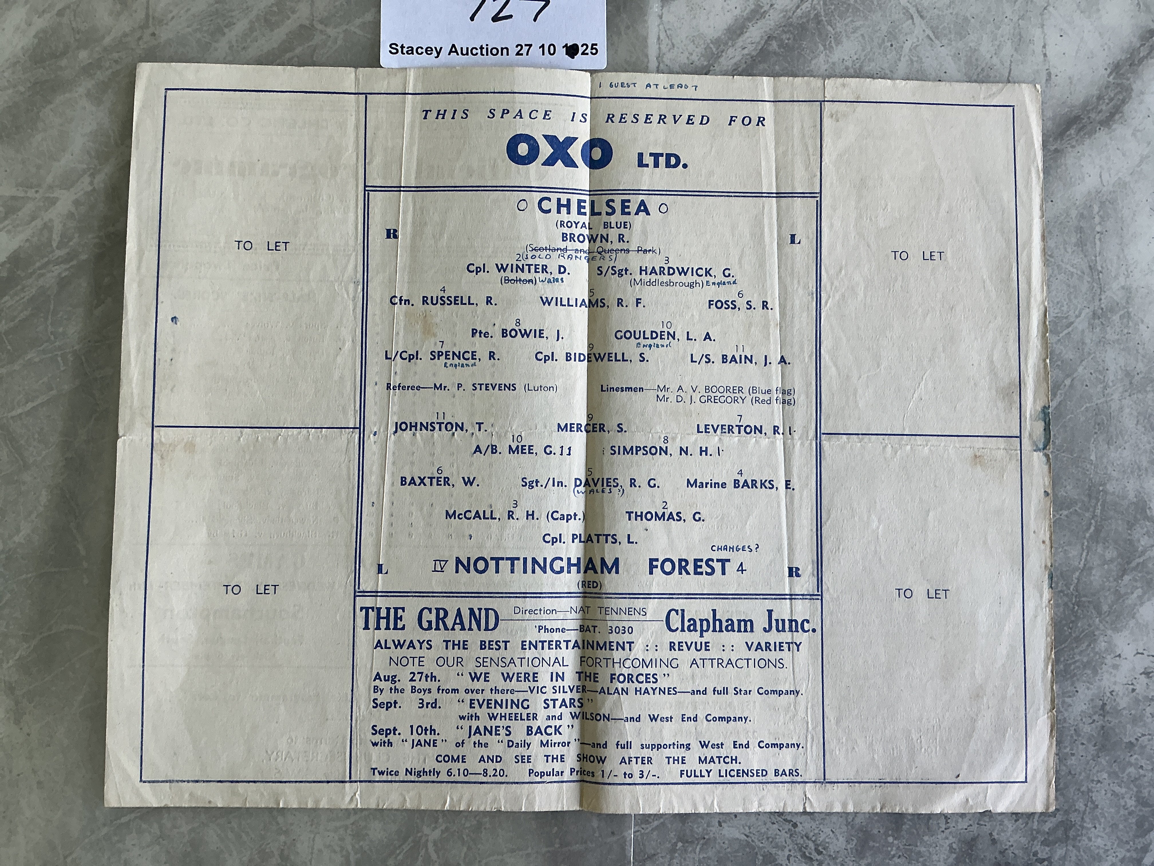 45/46 Chelsea v Nottingham Forest Football Programme: First match after the war dated 25 8 1945. 4 pager is fair with writing to cover and team changes.