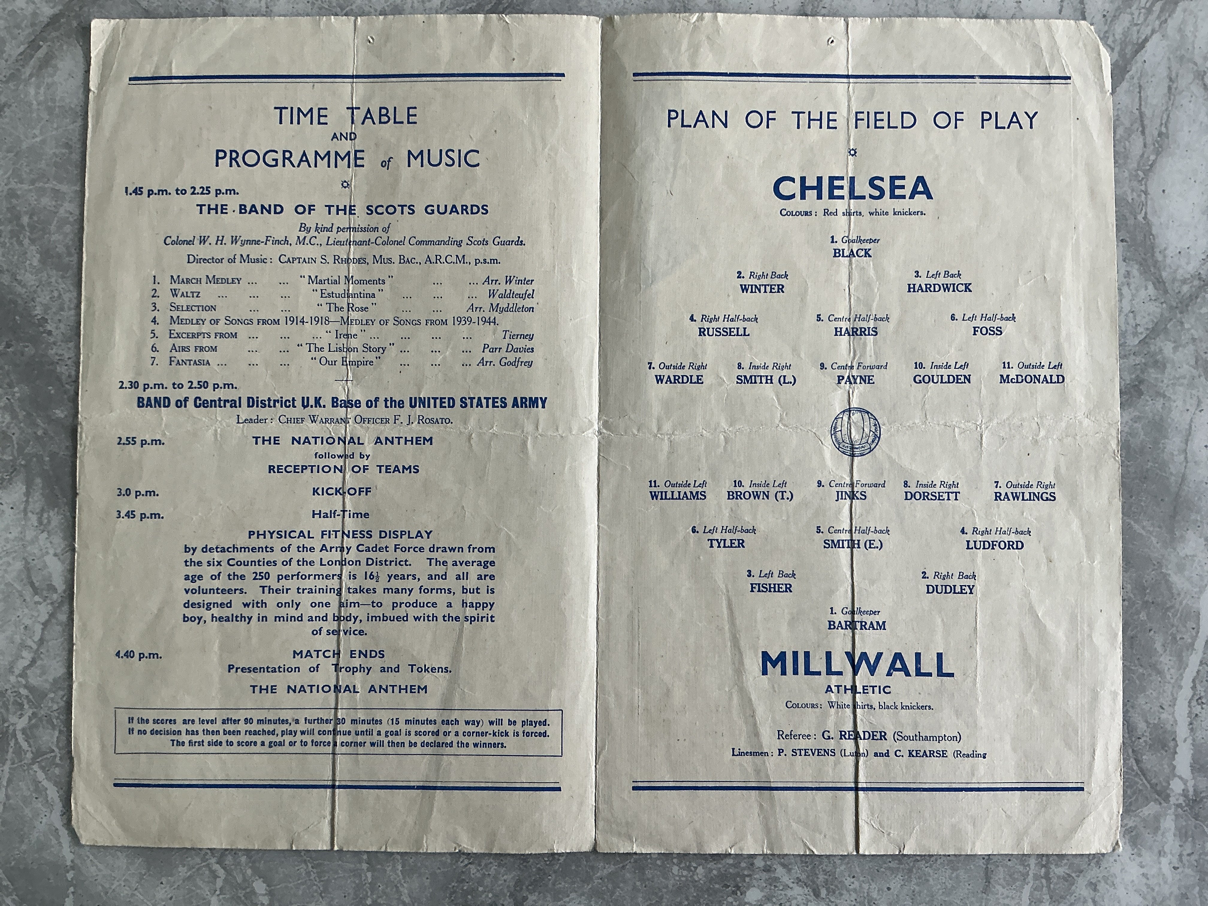 1945 Cup Final Chelsea v Millwall Football Programme: Played at Wembley for the League South final. 4 pager is fair with no team changes. Heavy fold.
