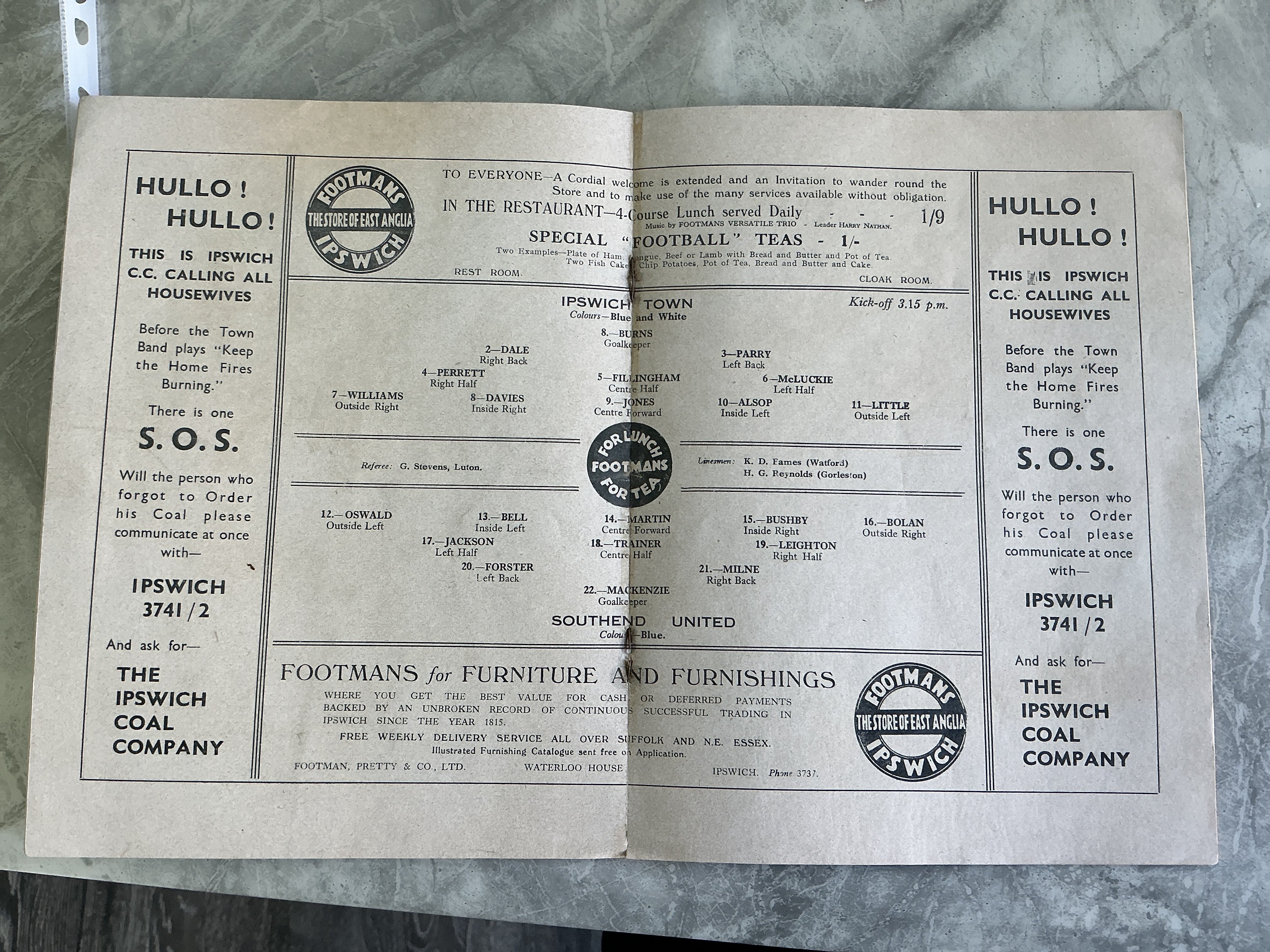 38/39 Ipswich Town v Southend United Football Programme: First home match in the football league for Ipswich. Good condition with no team changes. Some small stains to cover and professional repair.