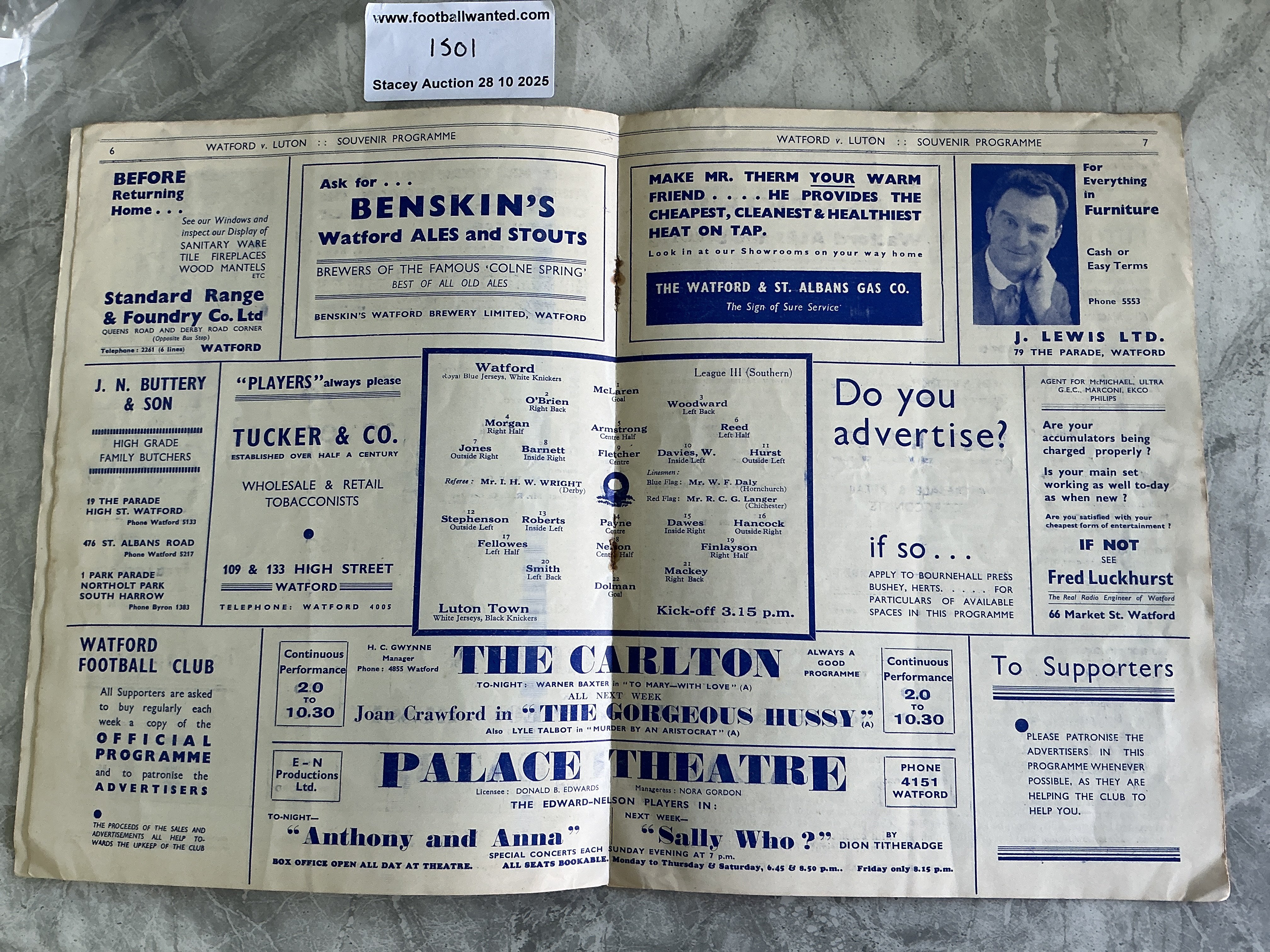 36/37 Watford v Luton Town Football Programme: 3rd Division South with 75 per cent split spine. Otherwise good with no team changes.