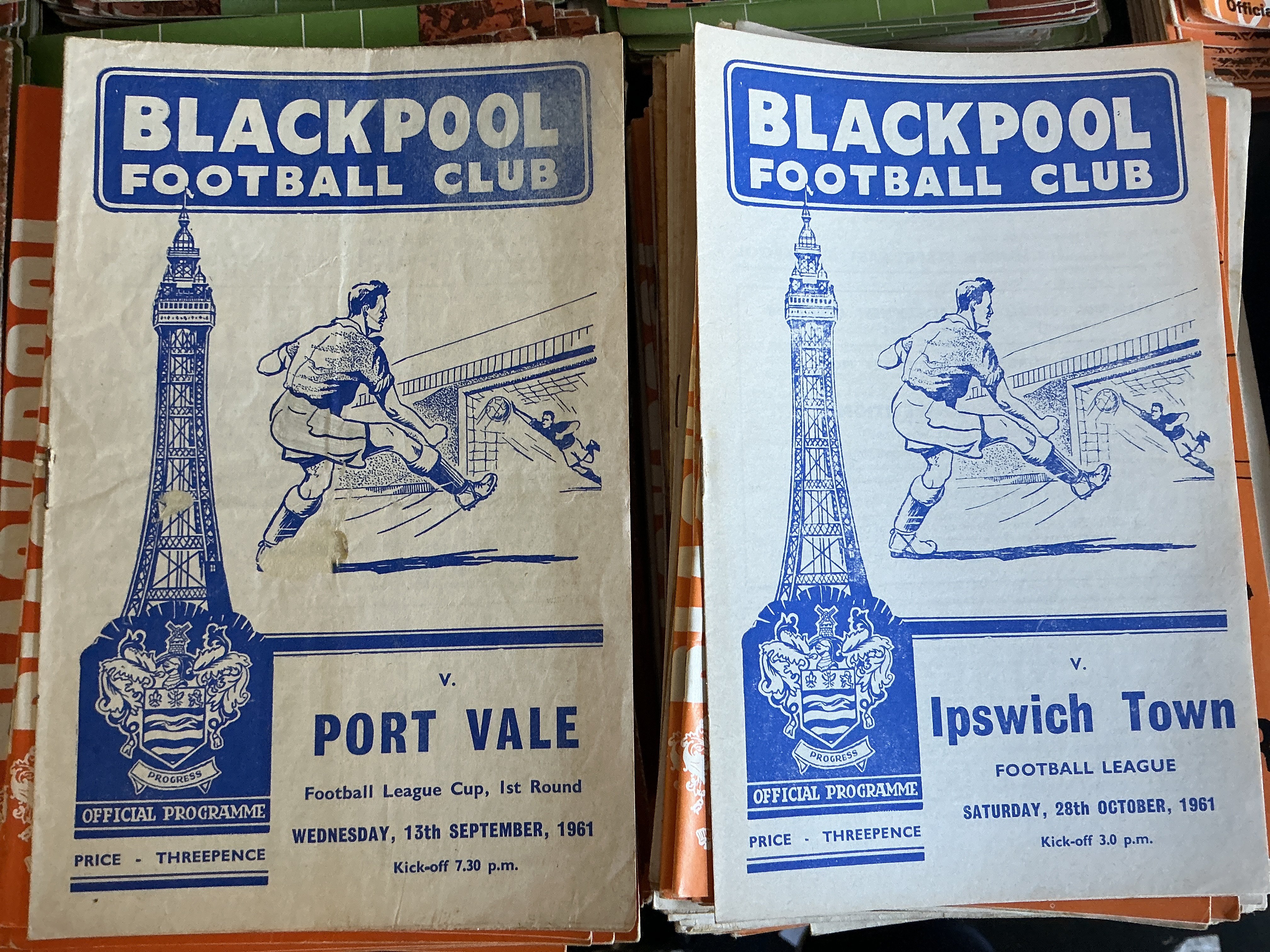 Blackpool 1960s Football Programmes: Almost 400 spanning the whole 60s decade. Includes 61/62 Ipswich Port Vale League Cup, Additionally there are some early 70s. Very good with duplication. (est 420+)