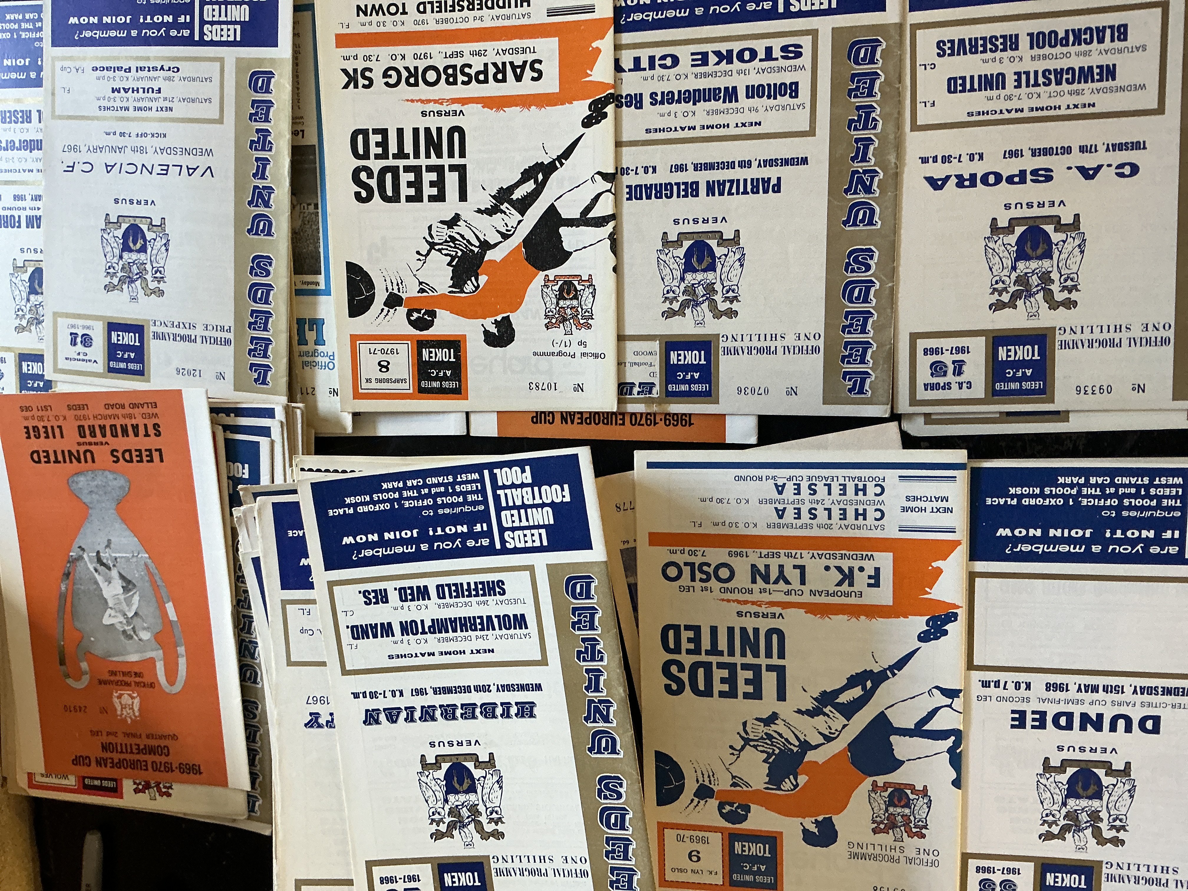 Leeds United 1960s Football Programmes: Around 250 mid to late 60s. Includes many different European matches. Additionally there are some early 70s. Very good with duplication. Tokens intact. (est 280)