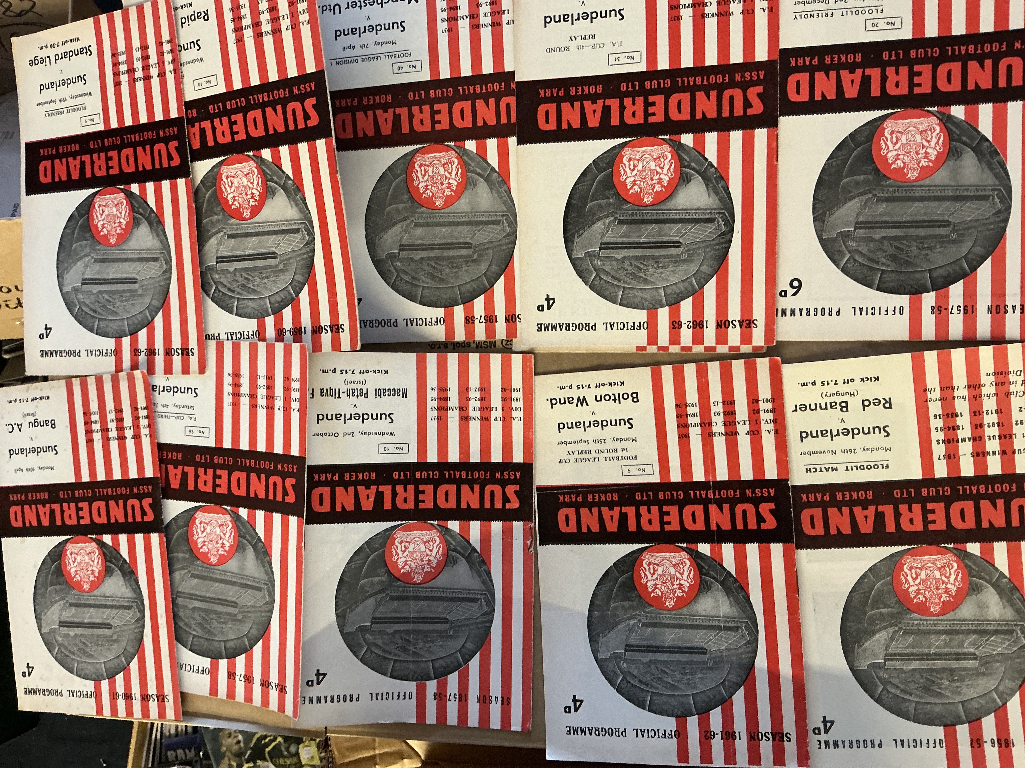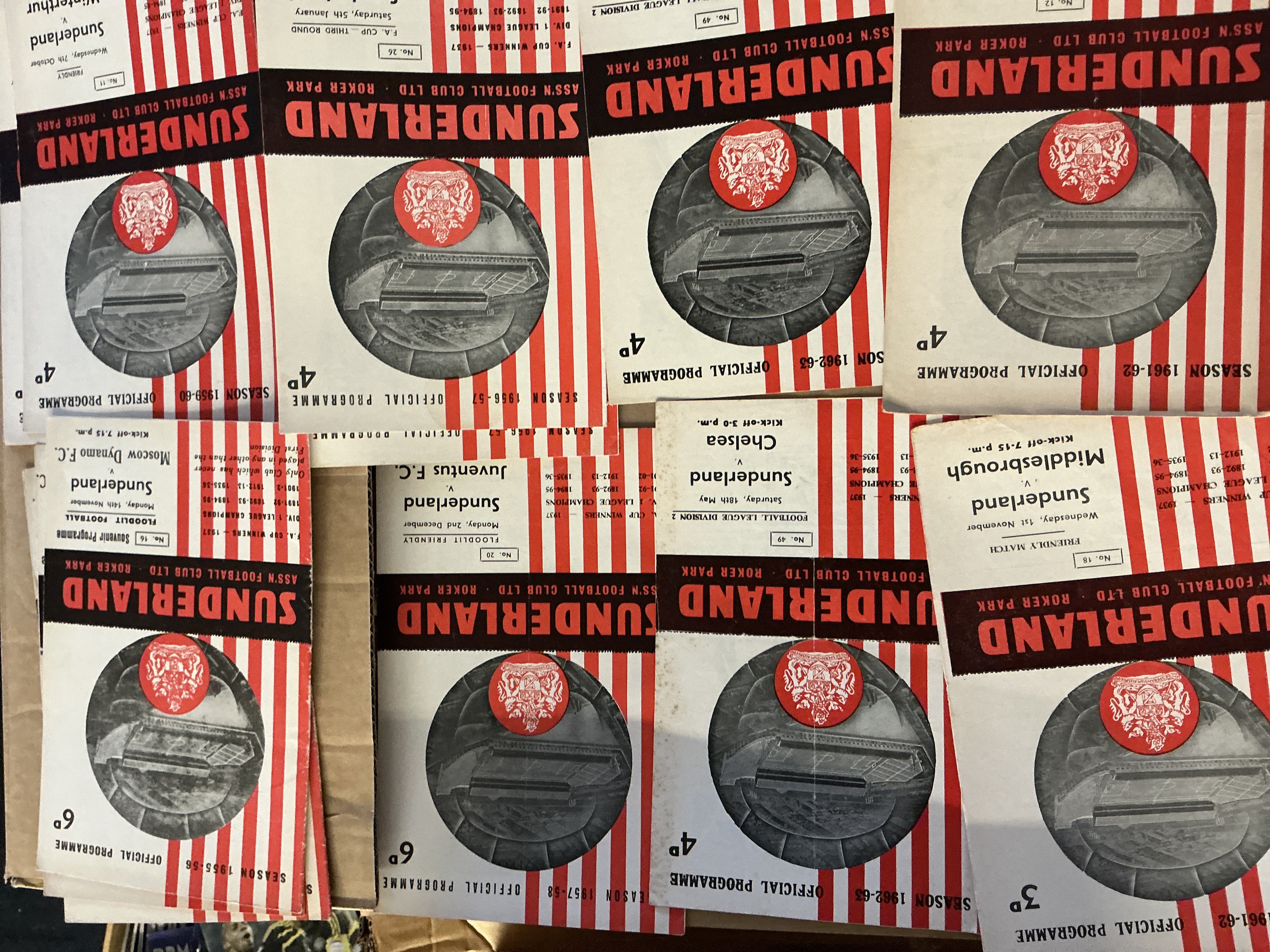 Sunderland 1960s Football Programmes: Nearly 400 from 57/58 to the late 60s. Includes 2 x 62/63 Chelsea, 61/62 Walsall + Bolton League Cup, 62/63 Gravesend FA Cup, friendlies v Winterthur Red Banner Middlesbrough Moscow Dynamo Juventus and more. Very good with duplication. (est 400)
