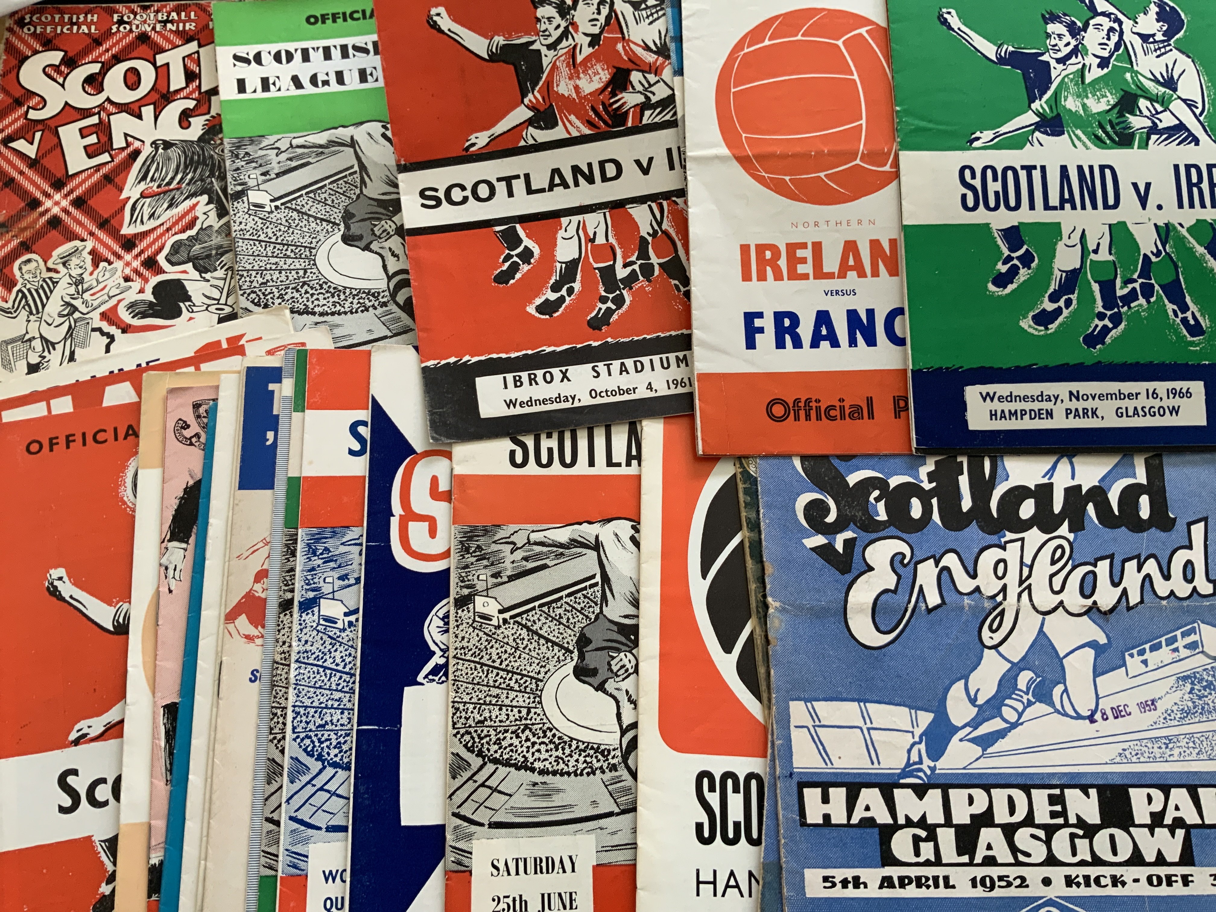 International Football Programmes. Large duplication to include 8 x 1951 England v Scotland, 1952 England v Belgium x 3. Includes Irish Inter League matches, U23, Schools and much more with good England and Scotland content. Fair/good. Large quantity in 2 boxes.