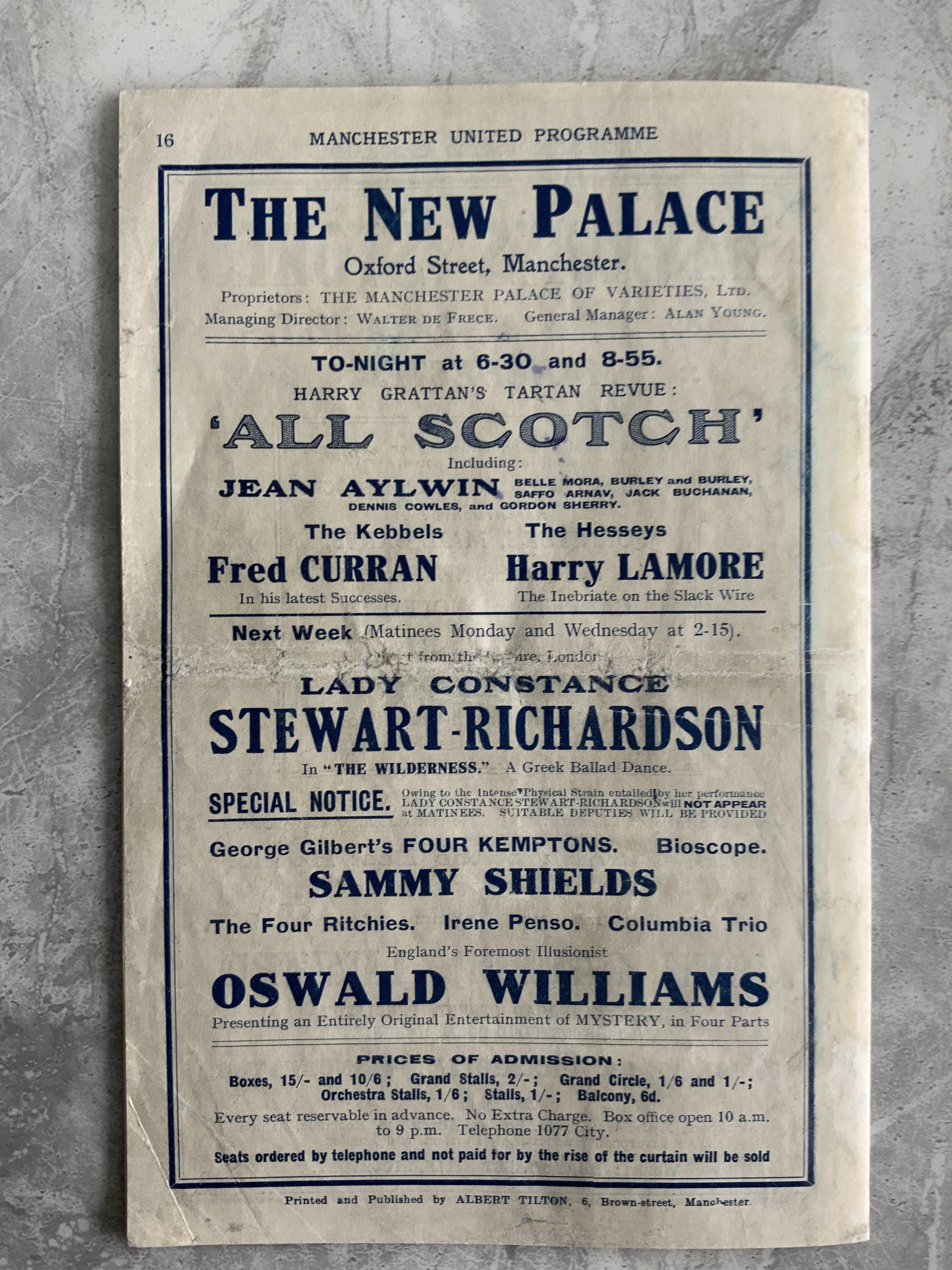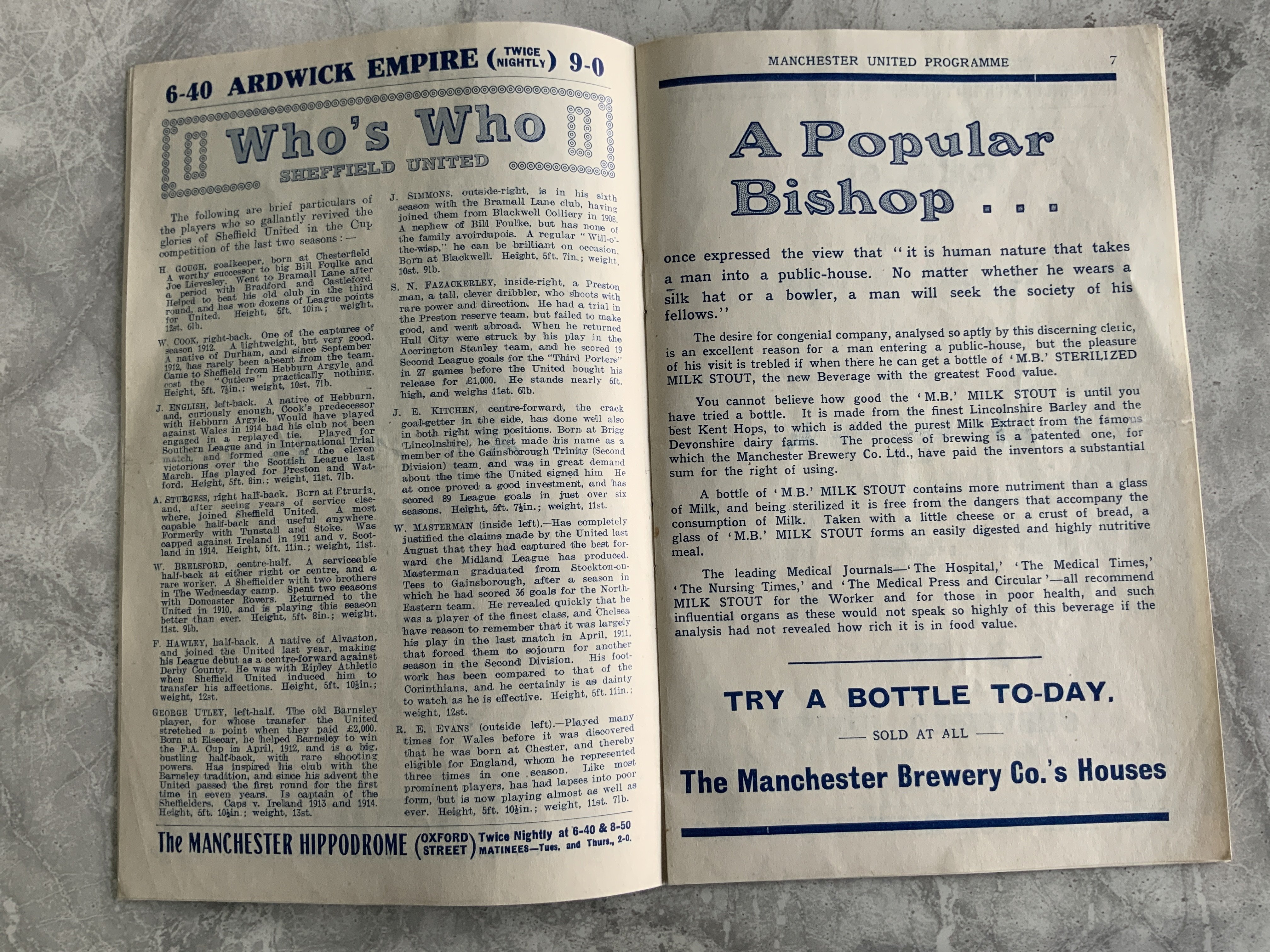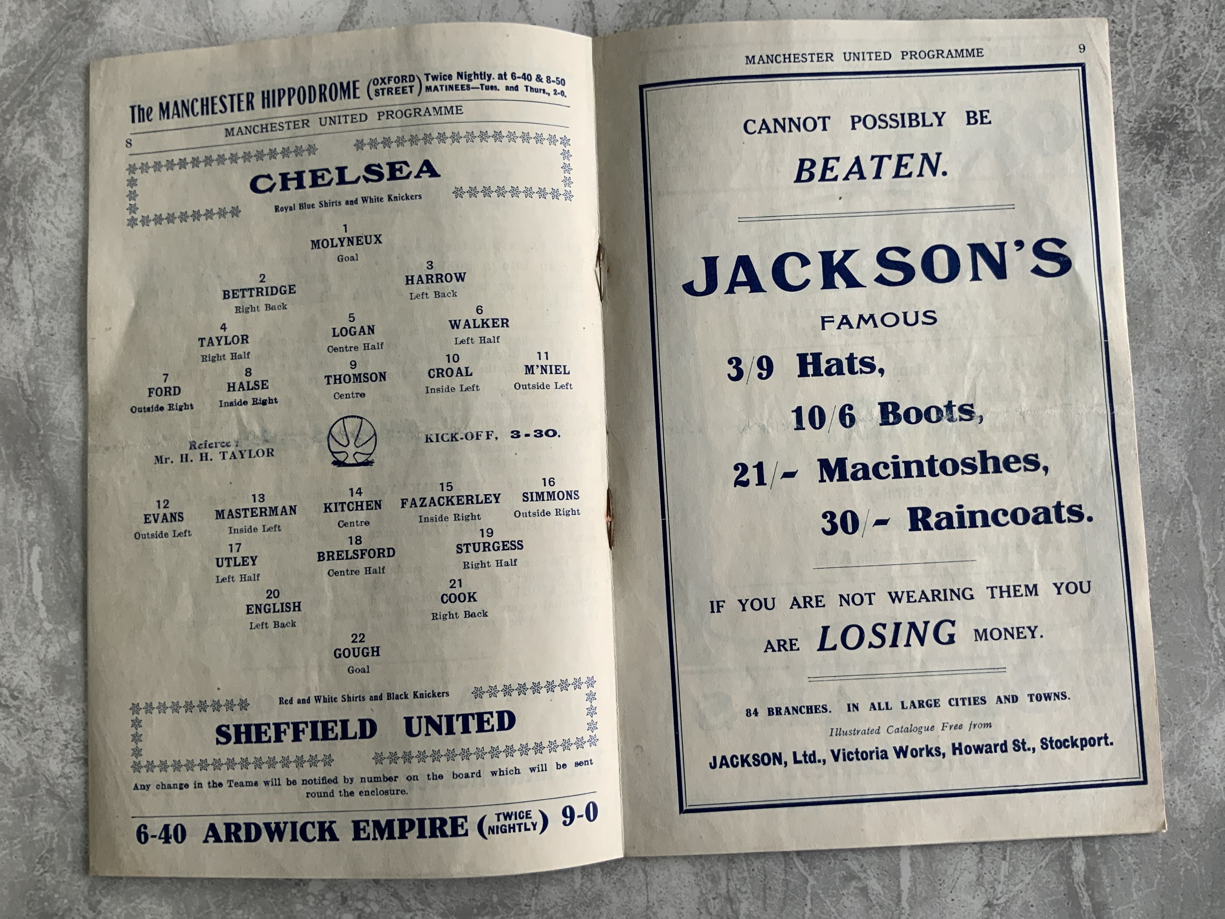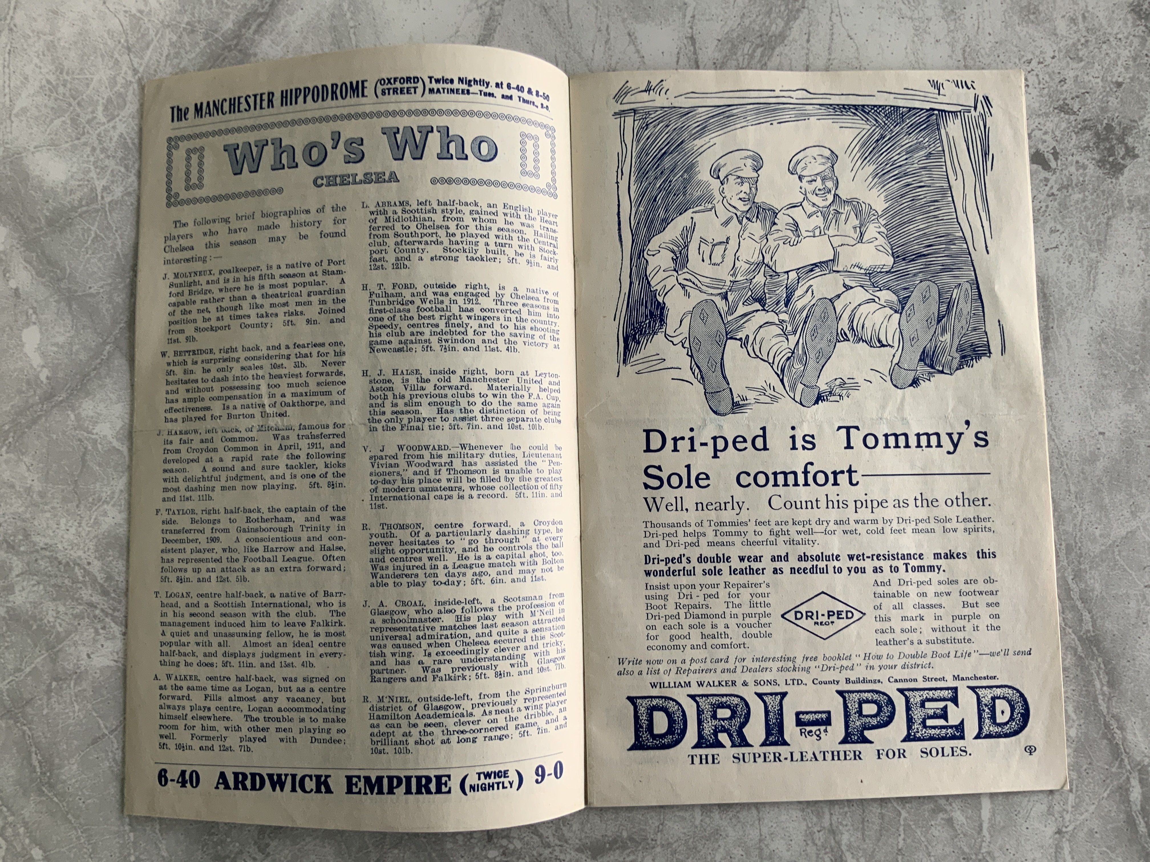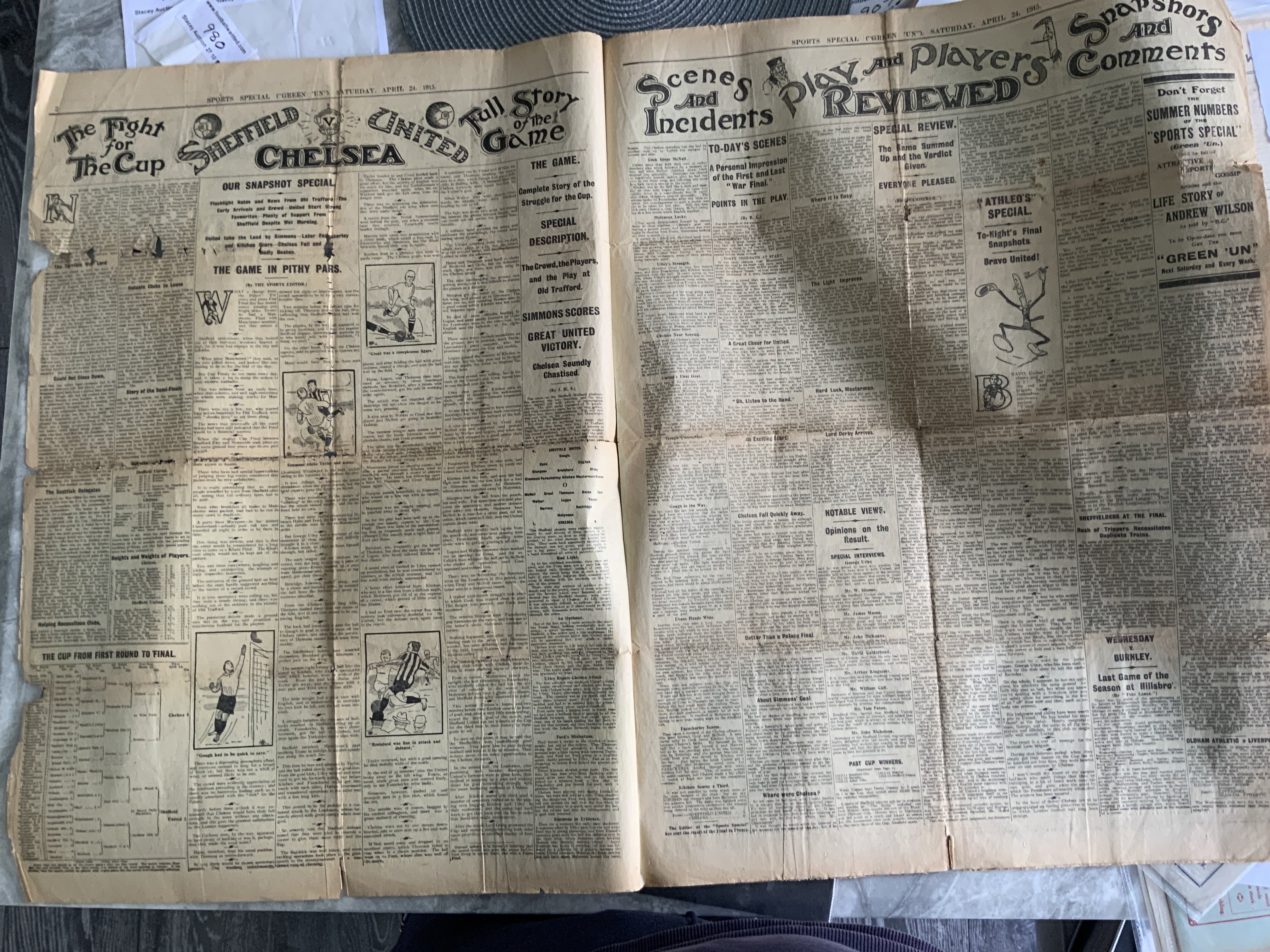 1915 FA Cup Final Football Programme At Manchester United: Incredibly rare Chelsea v Sheffield United final programme played at Old Trafford. Famously called the Khaki Cup Final as 1 year into World War One where the crowd was mainly dressed in military uniform. C/W Sheffield Sports Newspaper The Green Un from the day of the match and The Picture World newspaper from the Monday after with a match report inside. Programme very good with no team changes and papers fair. (3)