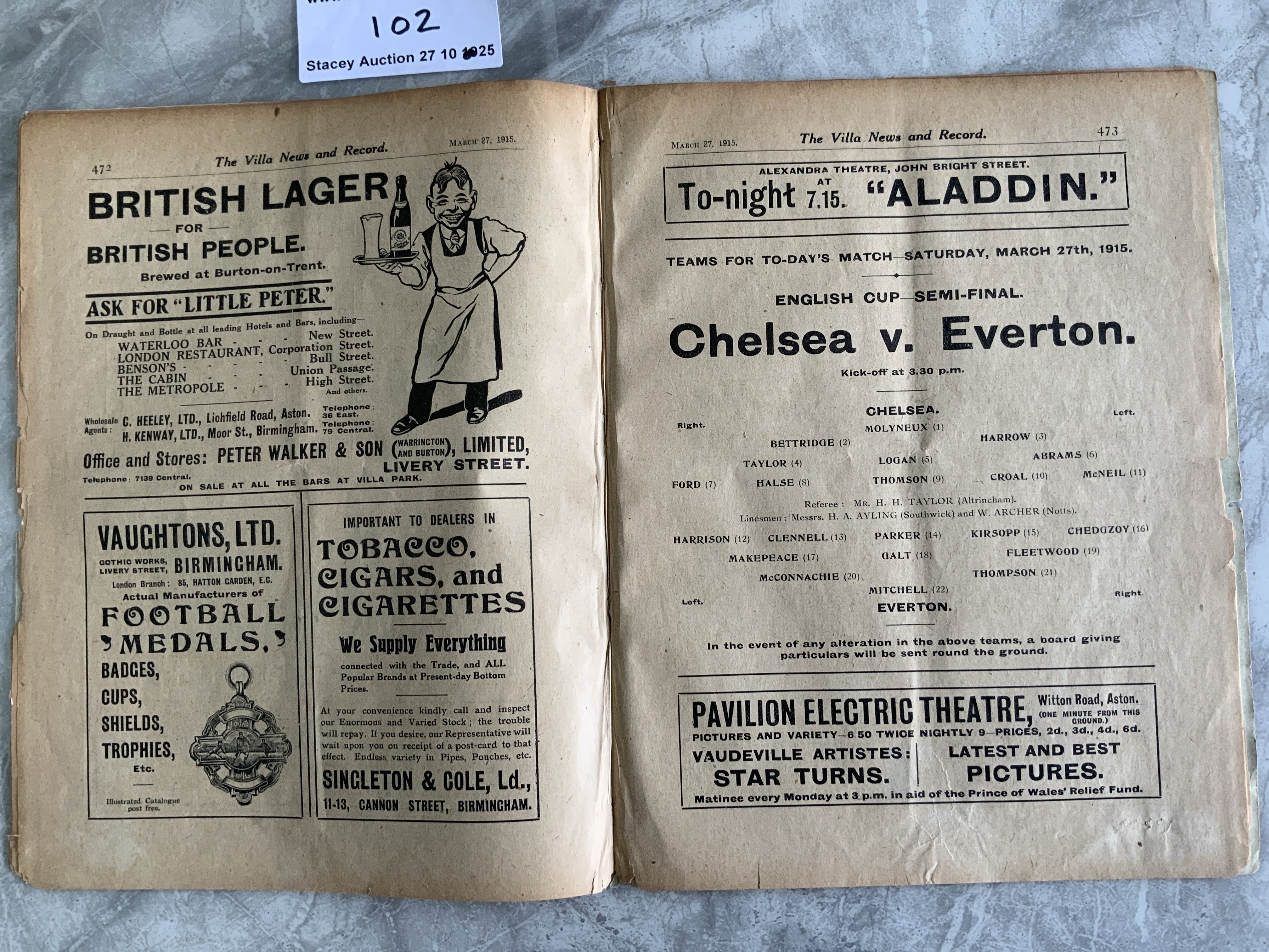 1915 FA Cup Semi Final Football Programme At Aston Villa: Chelsea v Everton ex bound with covers. Evidence of ex bound along spine. Fair/good with no team changes.