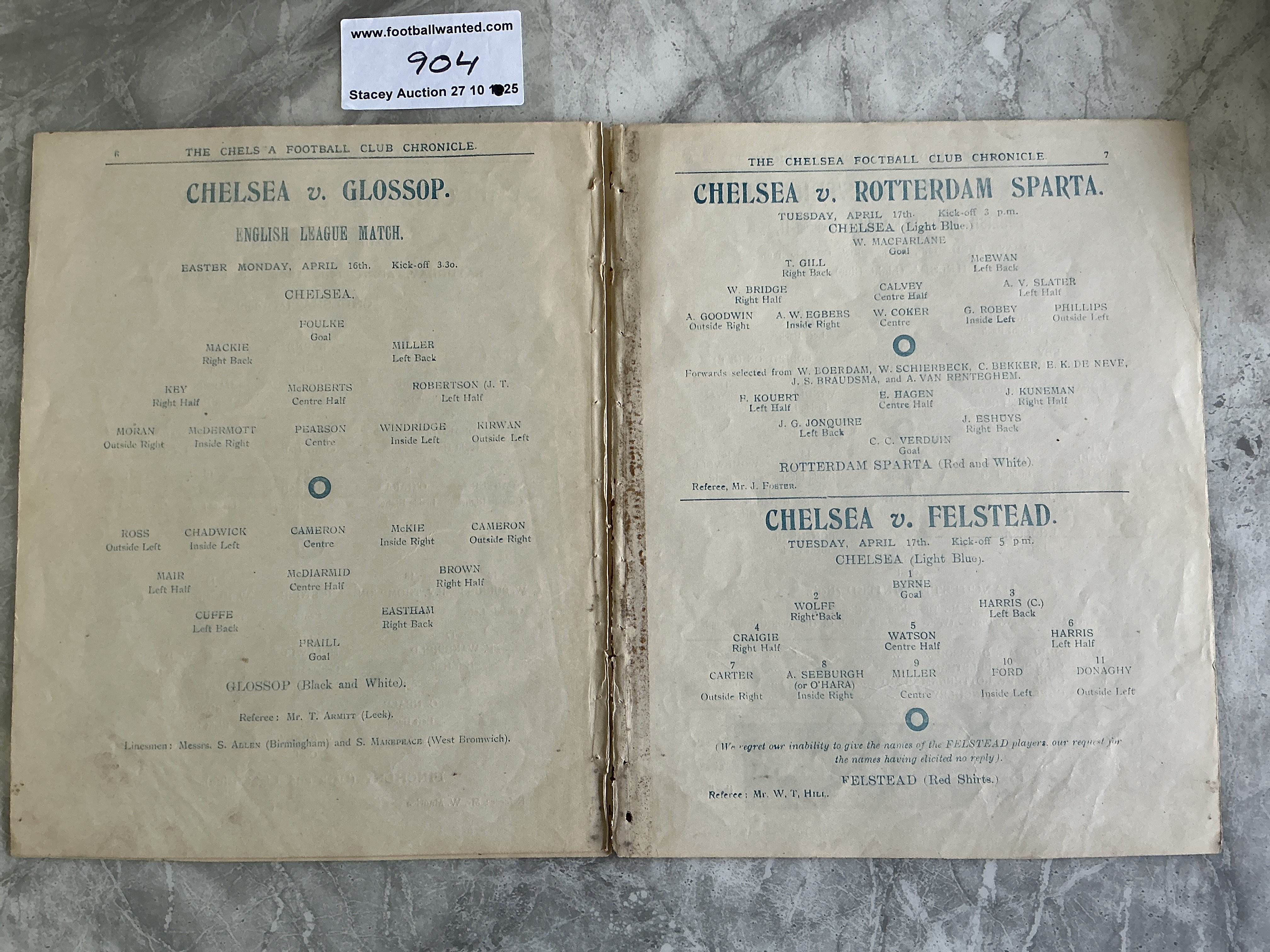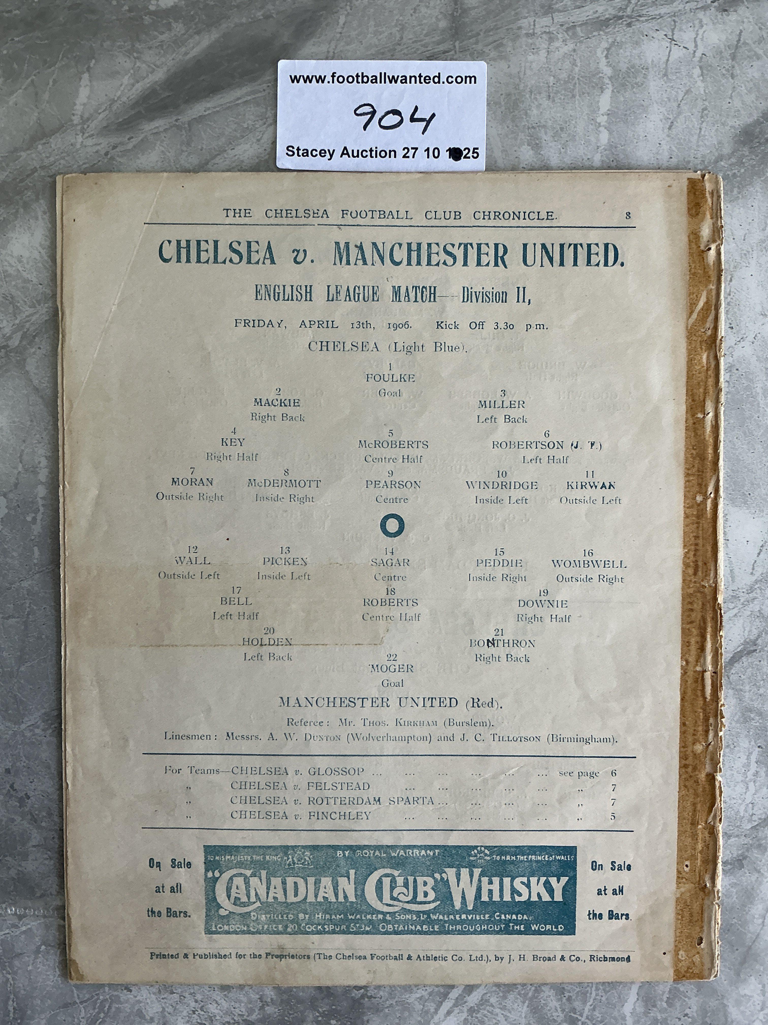 1905 - 1906 Chelsea v Manchester United Football Programme: Played at Chelsea in their first season. 8 page ex bound programme includes Chelseas other matches over Easter. Good condition programme with evidence of ex bound at spine area and no staple. No writing. Chelsea were only formed in 1905. Rare item indeed.