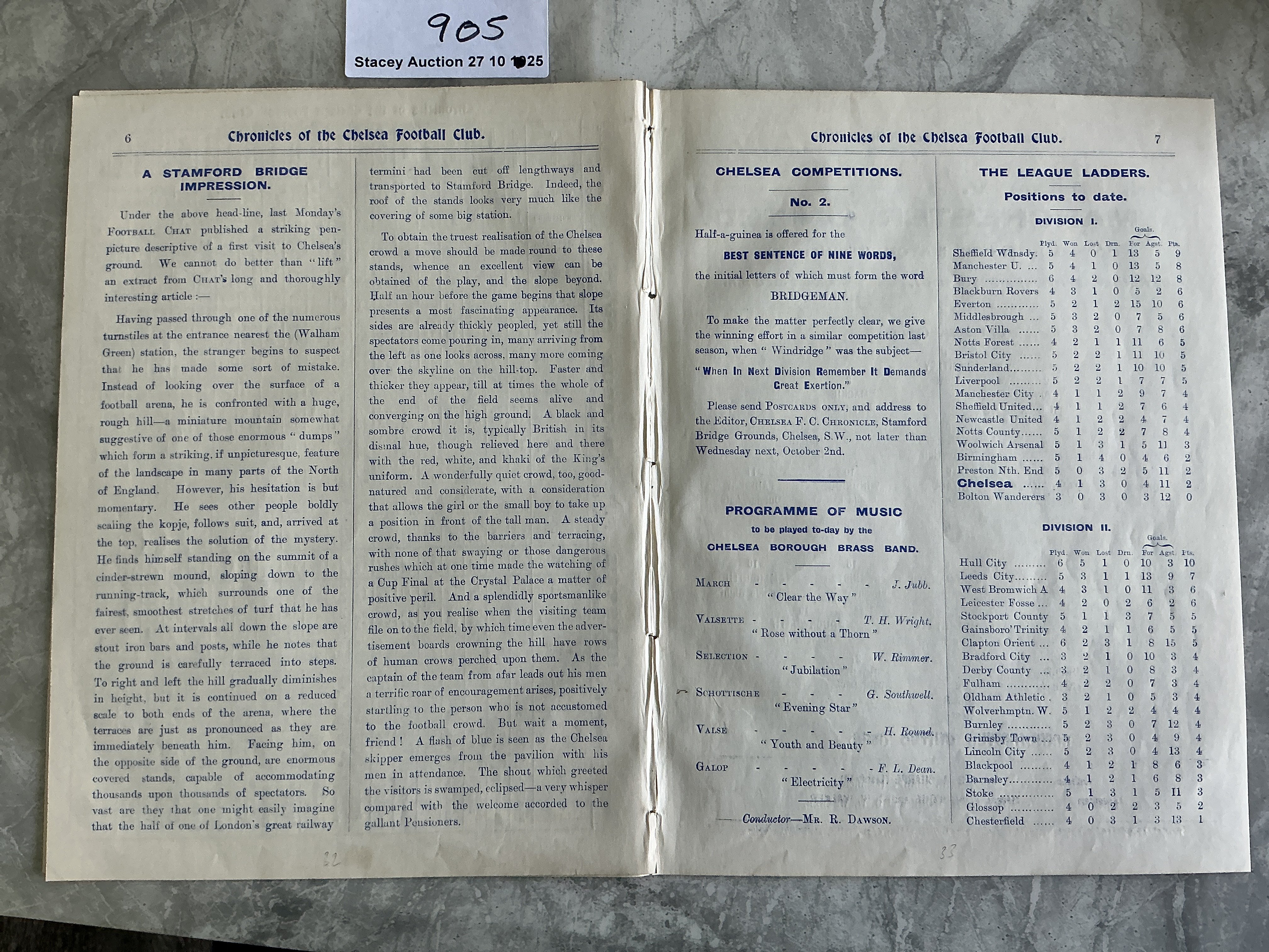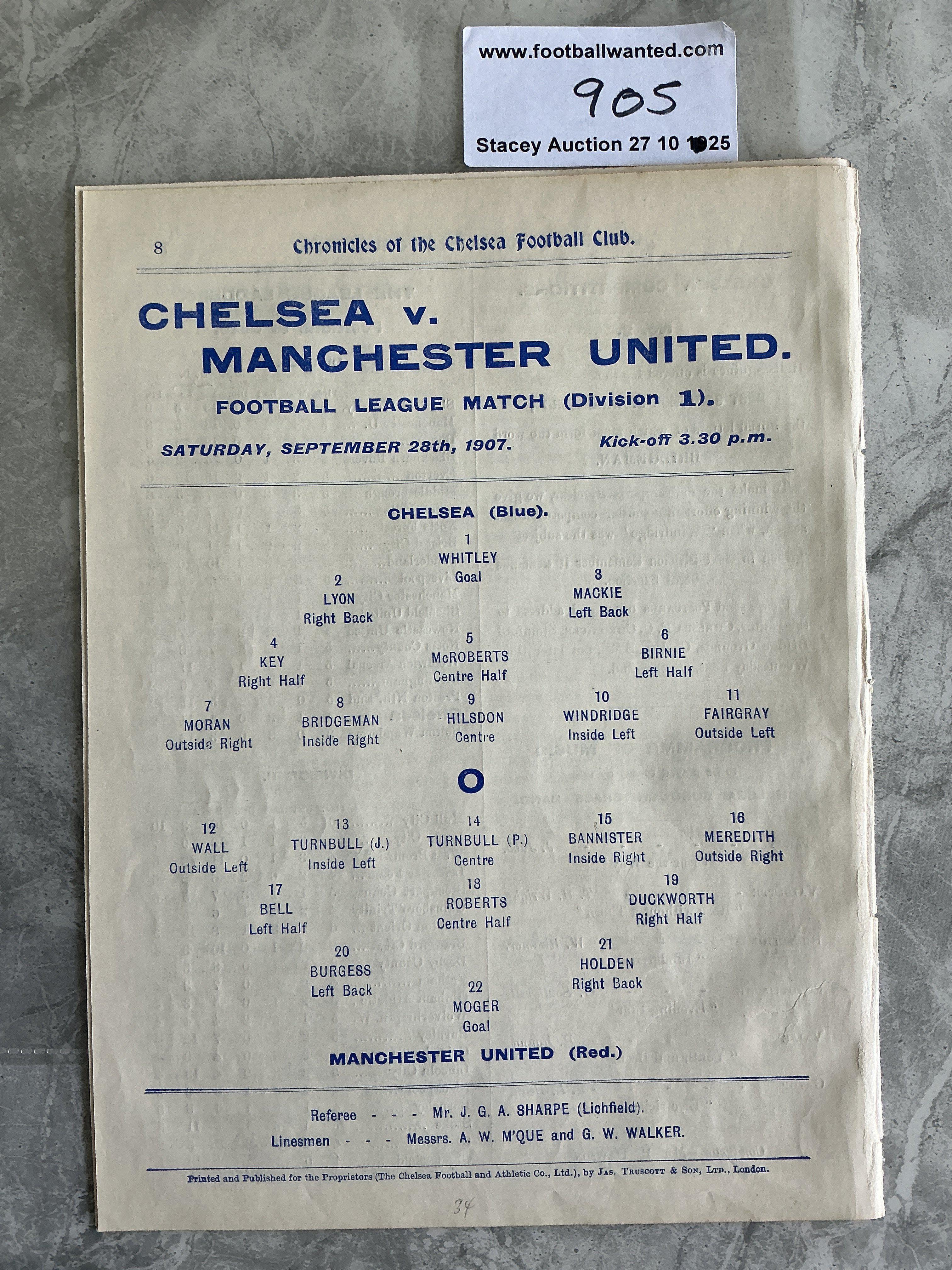 1907 - 1908 Chelsea v Manchester United Football Programme: Excellent condition ex bound 8 pager with no team changes. Man Utd won their first ever 1st division title this season. Rare item.