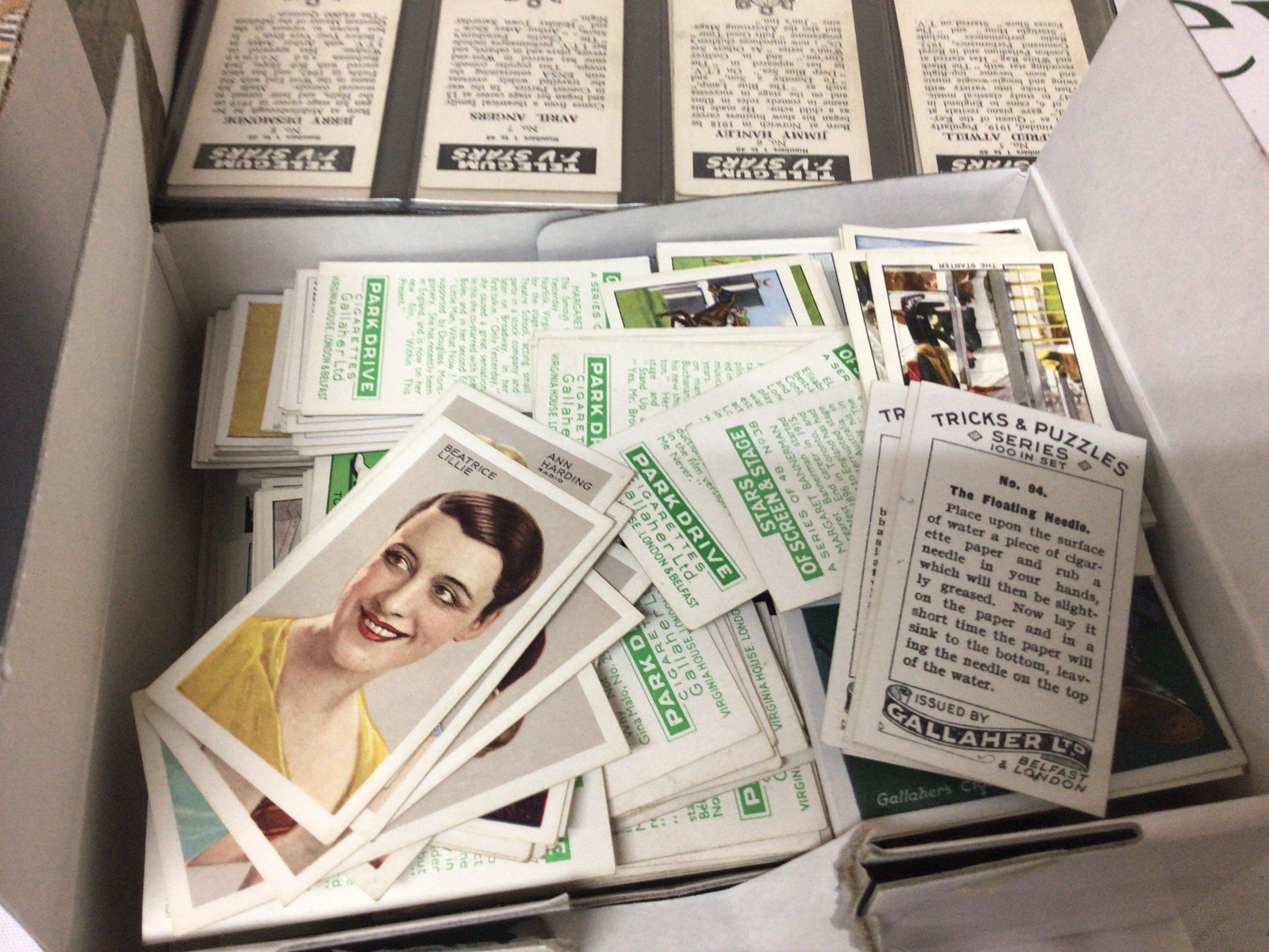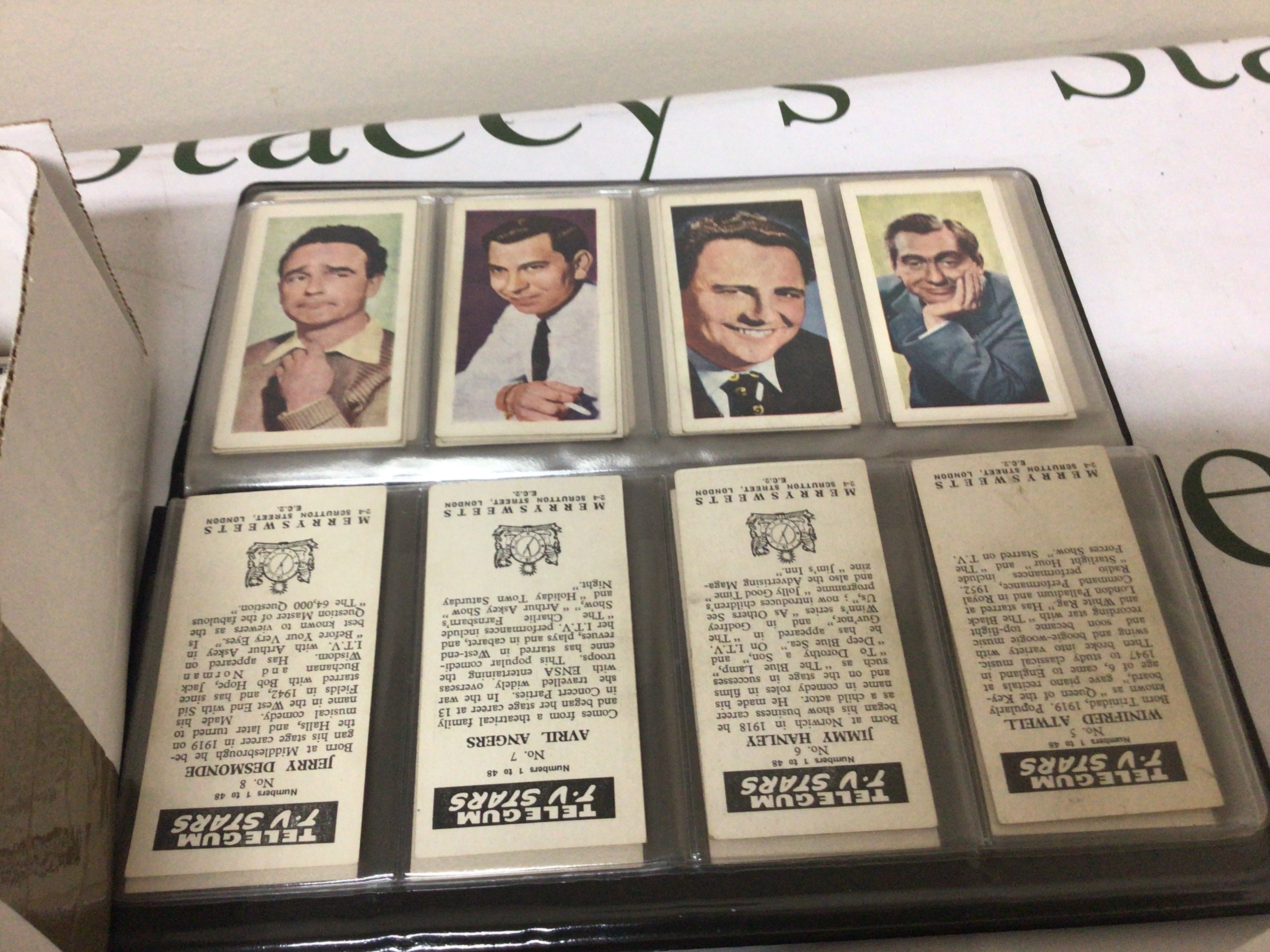 A box containing sets of vintage cigarette cards including a Gallaher Ltd cards Turf cards Mitchells Angling Vintage football cards from the boys Magazine Ogden a set of well presented Telegum TV stars and others.