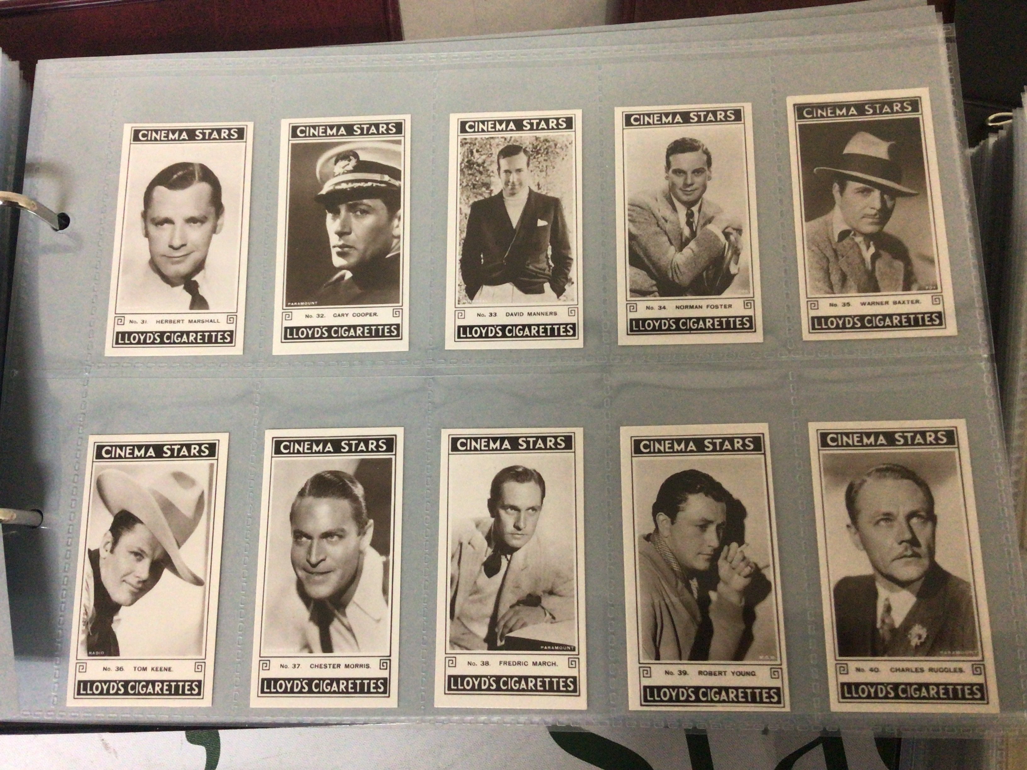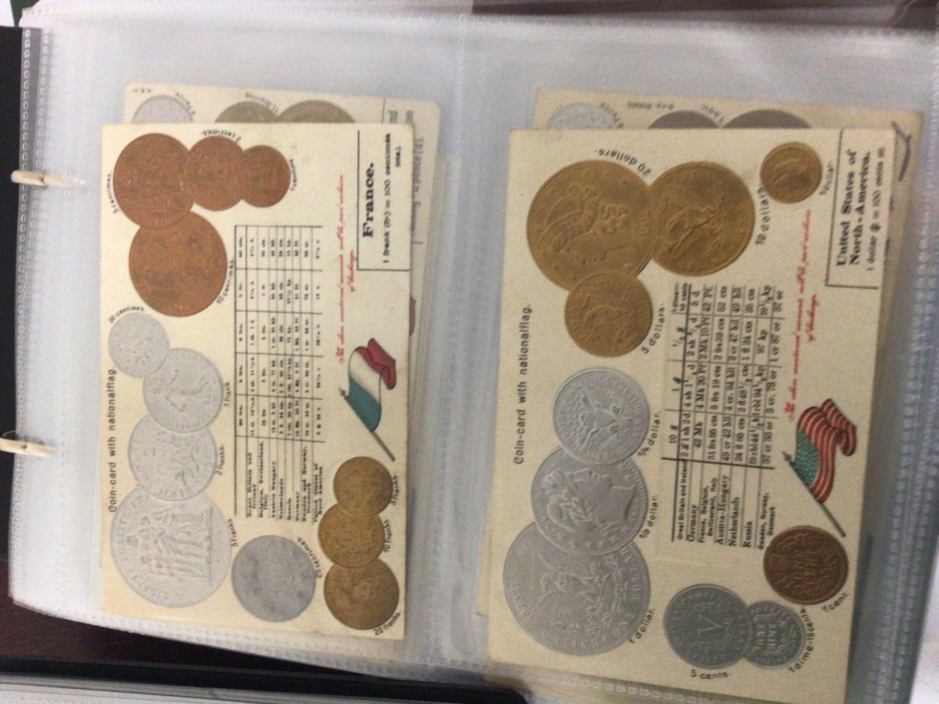Five albums containing well presented cigarette cards postcards including coin cards with National flags Turf cigarettes cards playing cards vintage cigarette packets pop stars cards Lloyds cigarettes cards Tucks postcards and numerous others in five albums. (5)