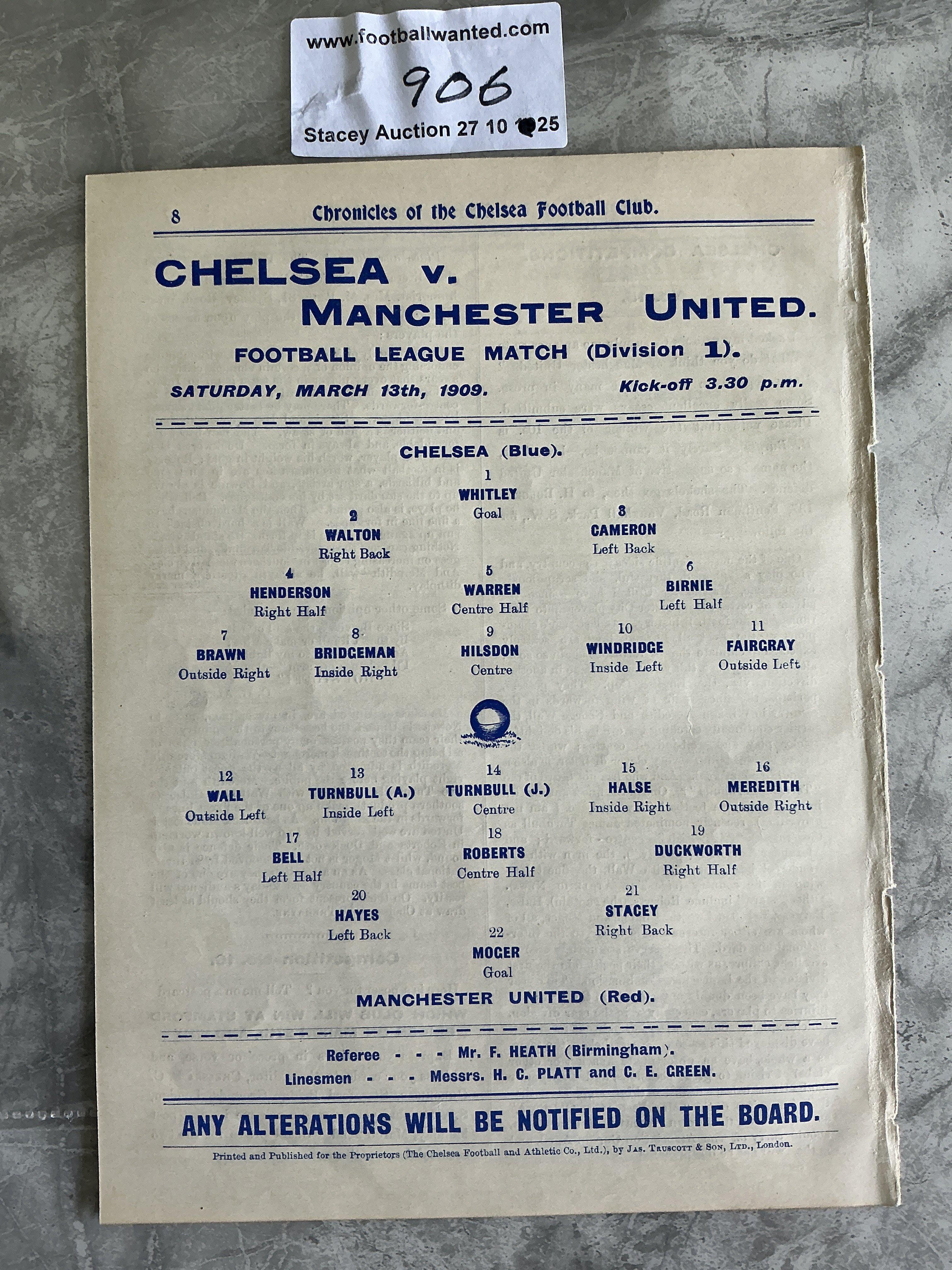 1908 - 1909 Chelsea v Manchester United Football Programme: Excellent condition 1st Division ex bound 8 pager with no team changes.