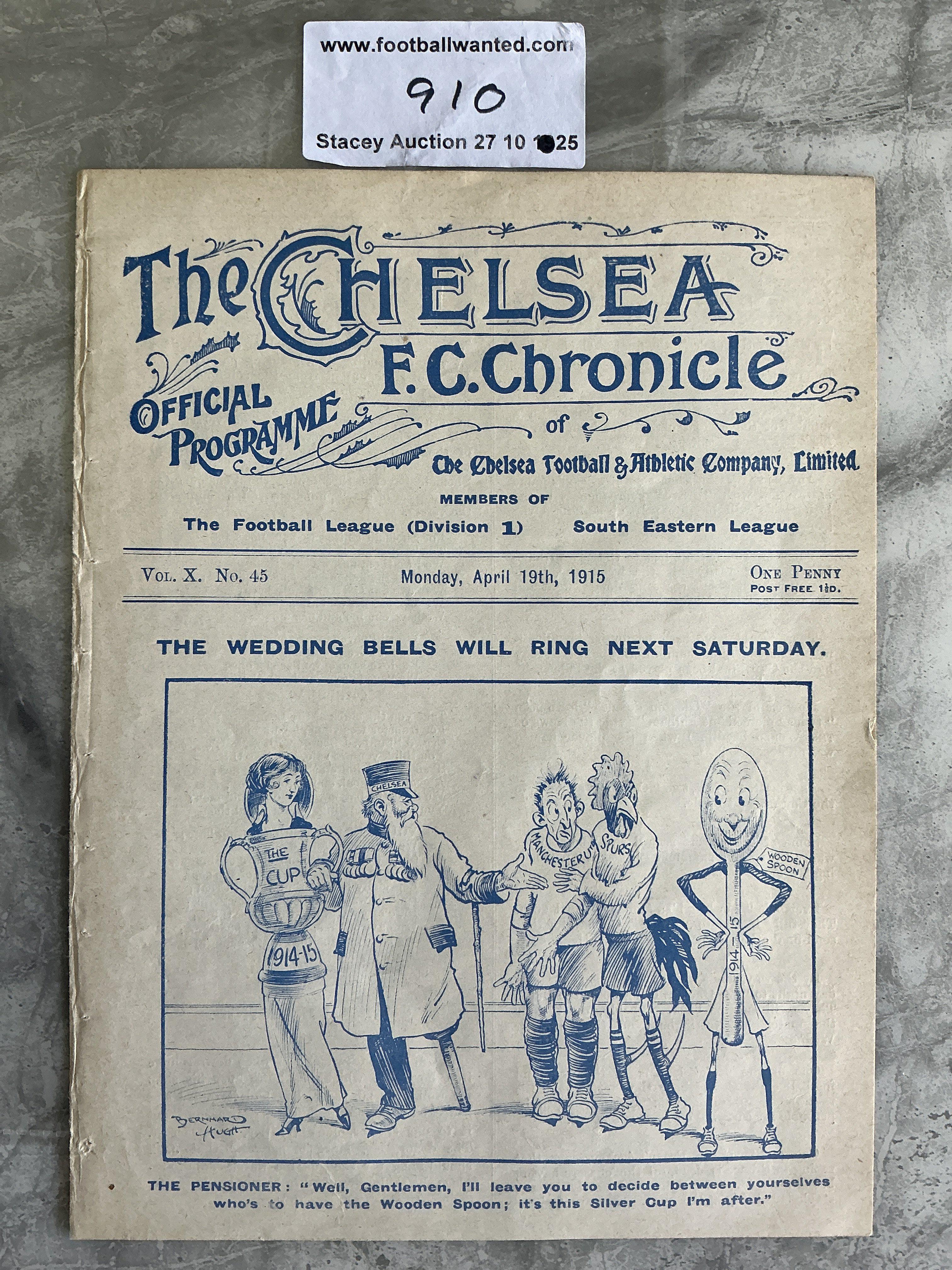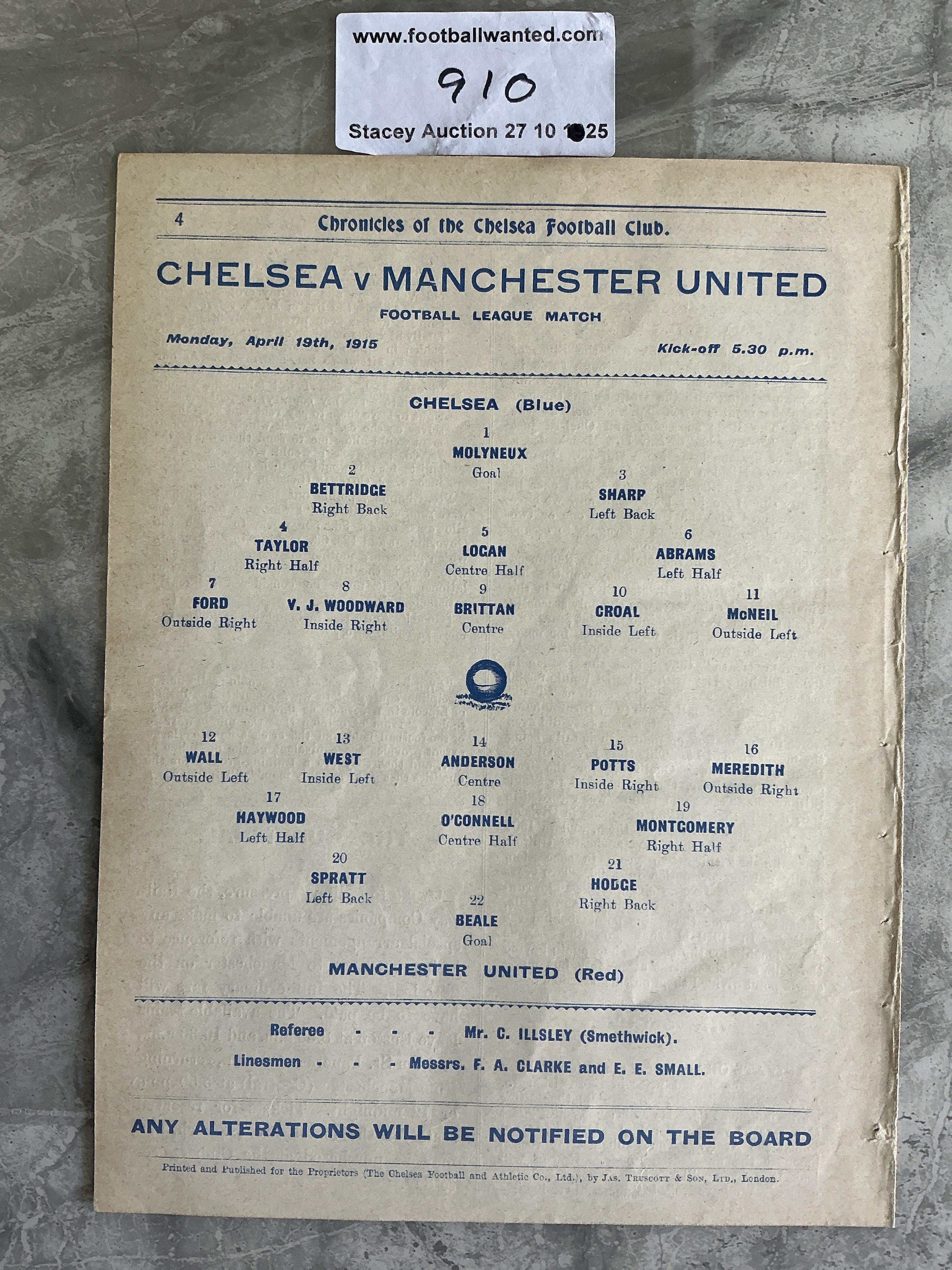 1914 - 1915 Chelsea v Manchester United Football Programme: Excellent condition 4 page ex bound 1st Division programme with no team changes. Incredibly rare chance to see a Chelsea programme from this season as World War One had been almost a year old.