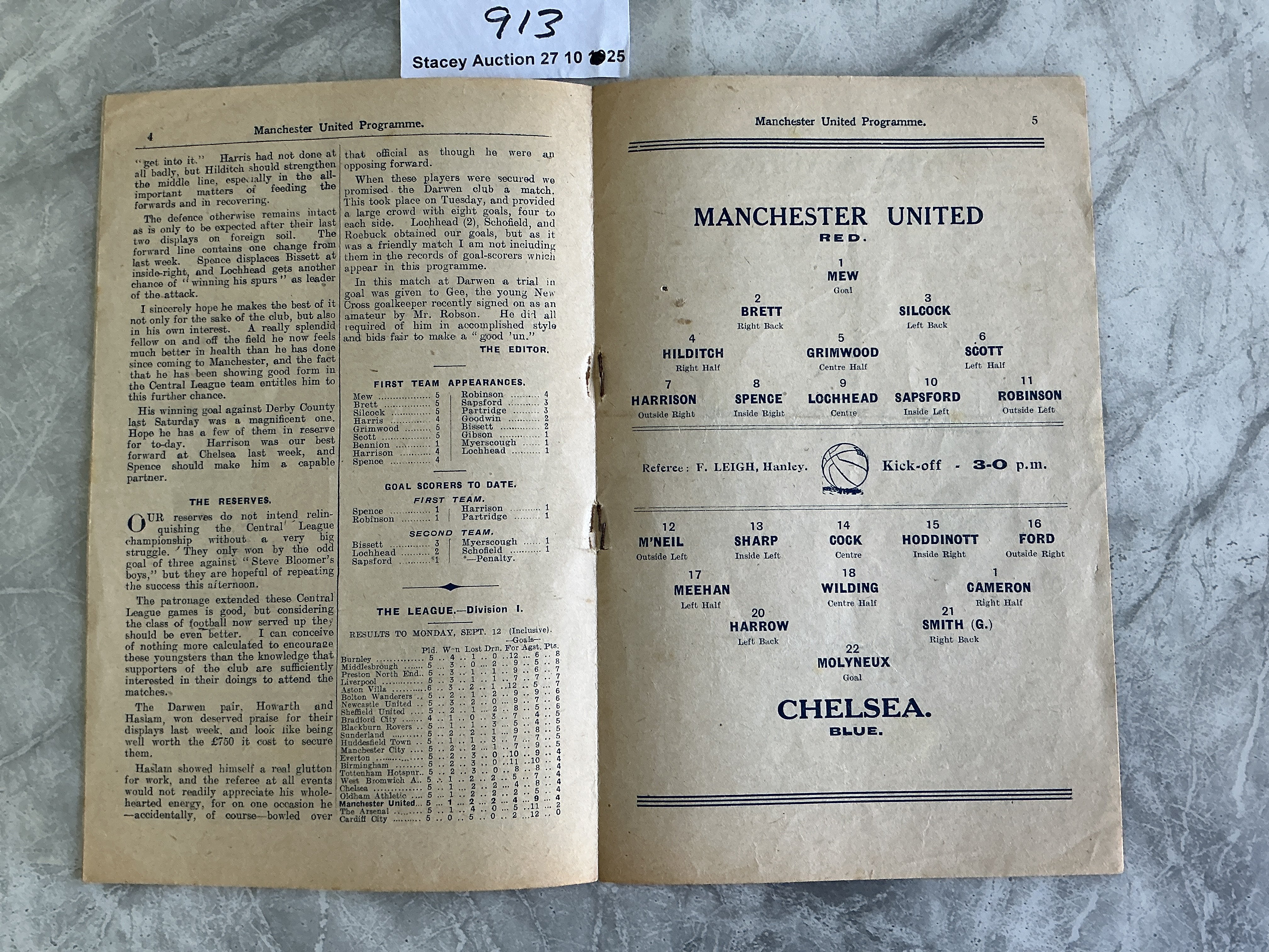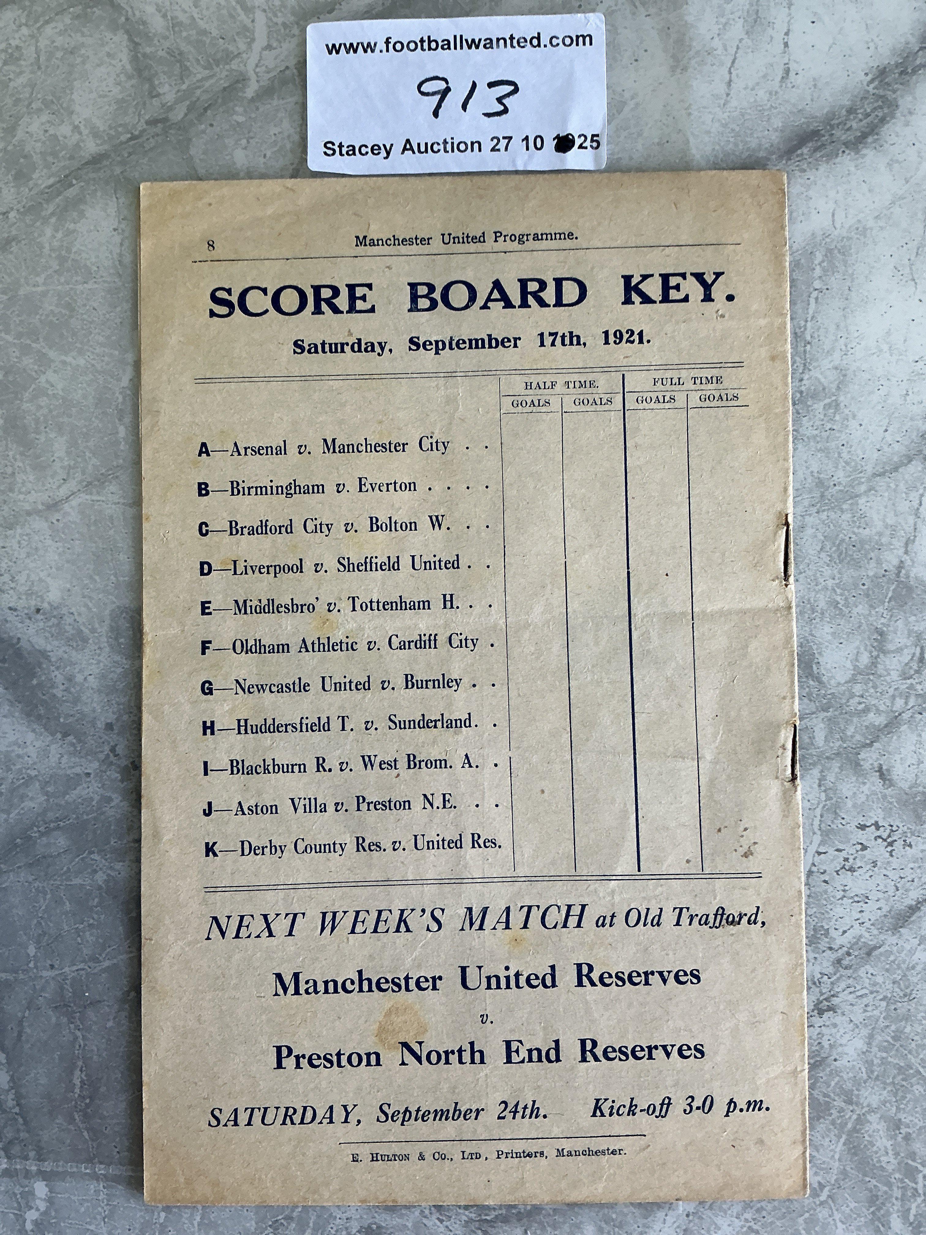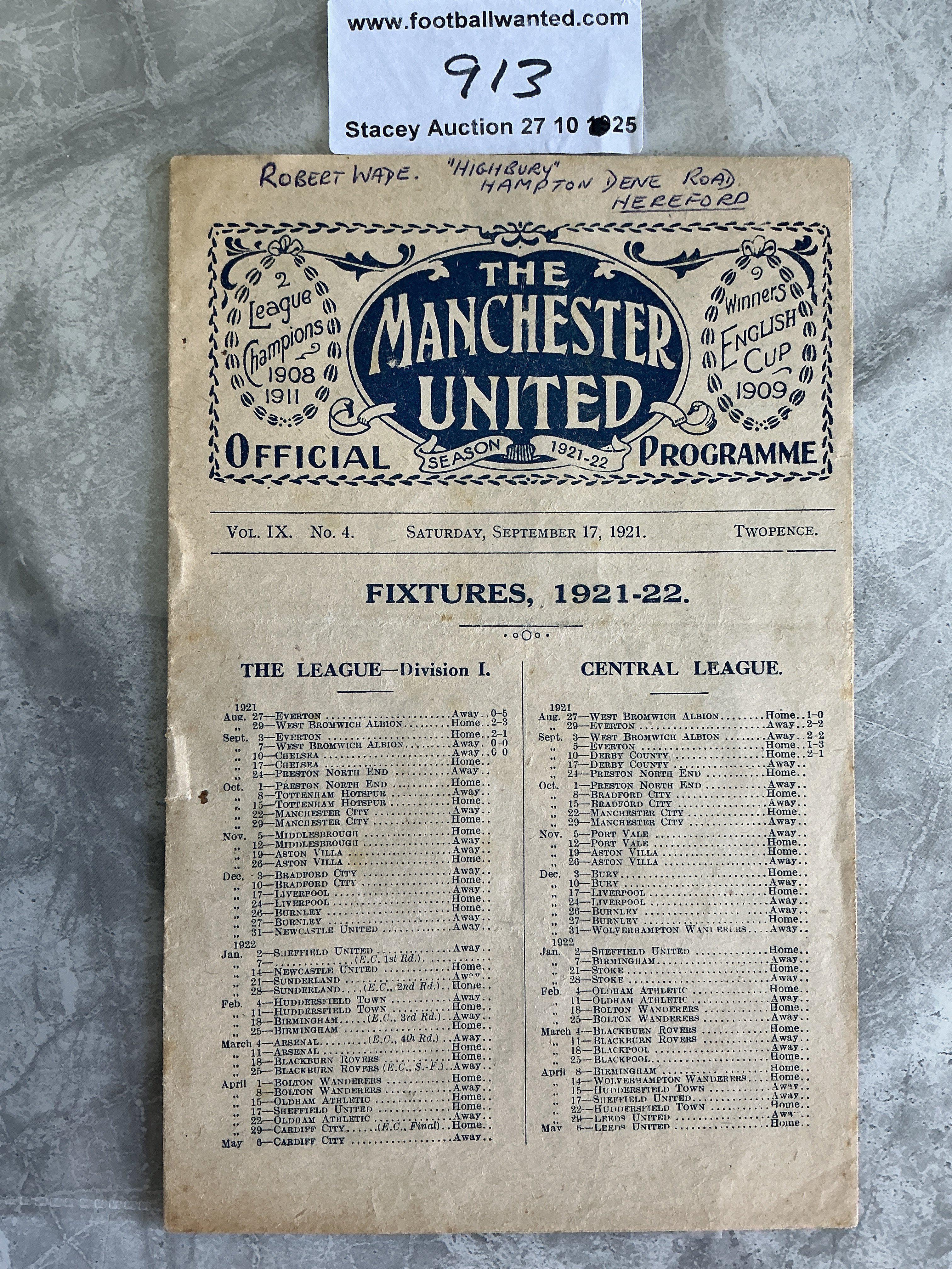 1921 - 1922 Manchester United v Chelsea Football Programme: Good condition 8 pager 1st Division programme with no team changes. Name and address written to front page border.