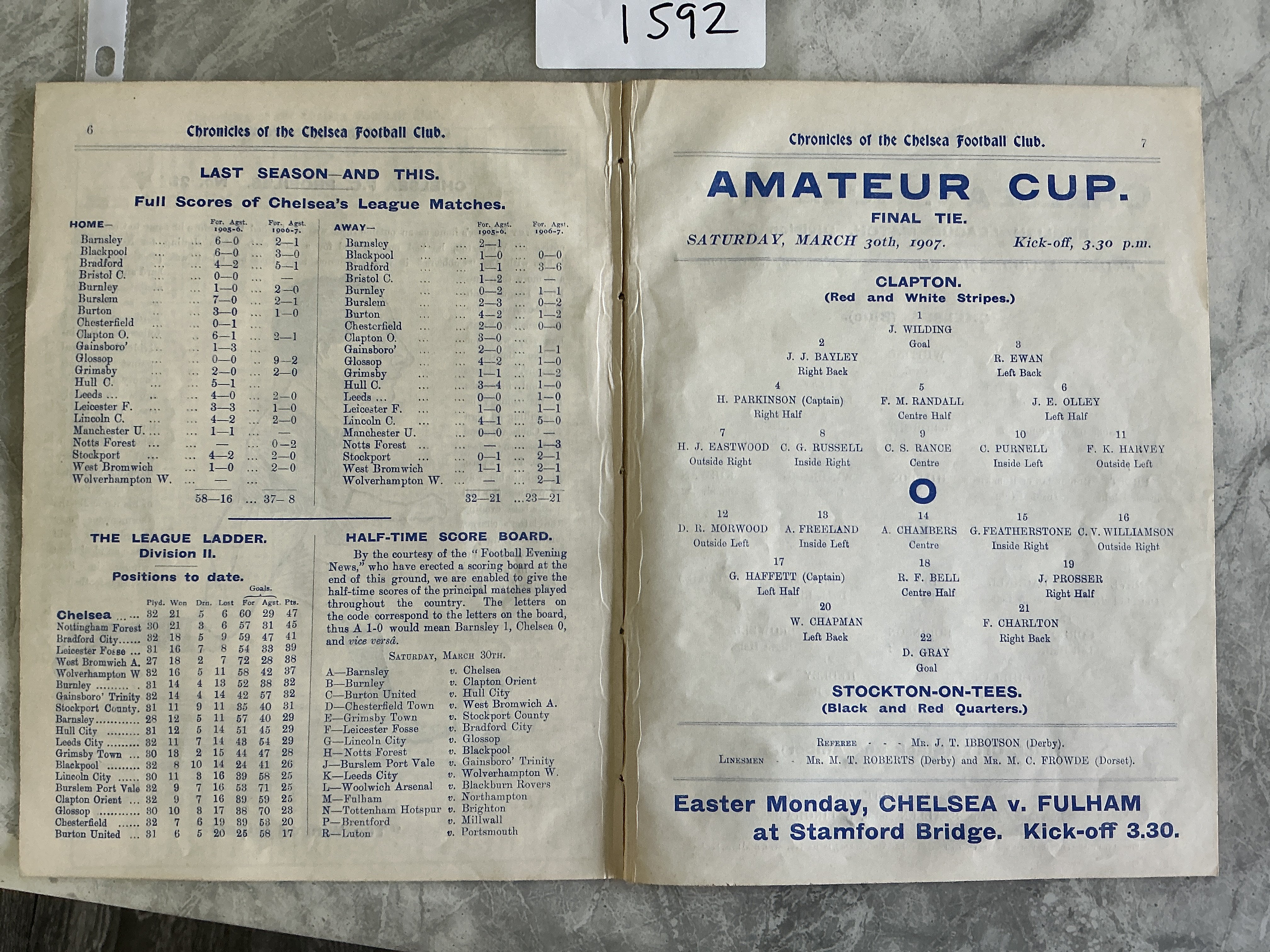 1906 - 1907 Amateur Cup Final Football Programme At Chelsea: Clapton v Stockton On Tees which doubles up as a Division 2 home match for Chelsea v Hull. Excellent condition ex bound with no team changes. (1)