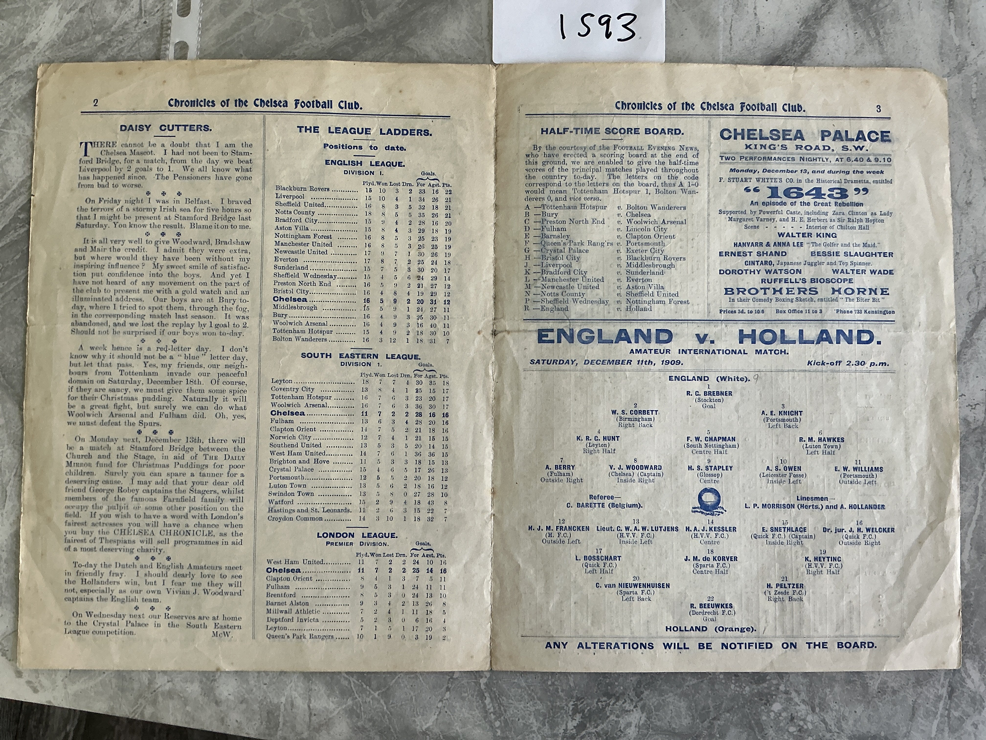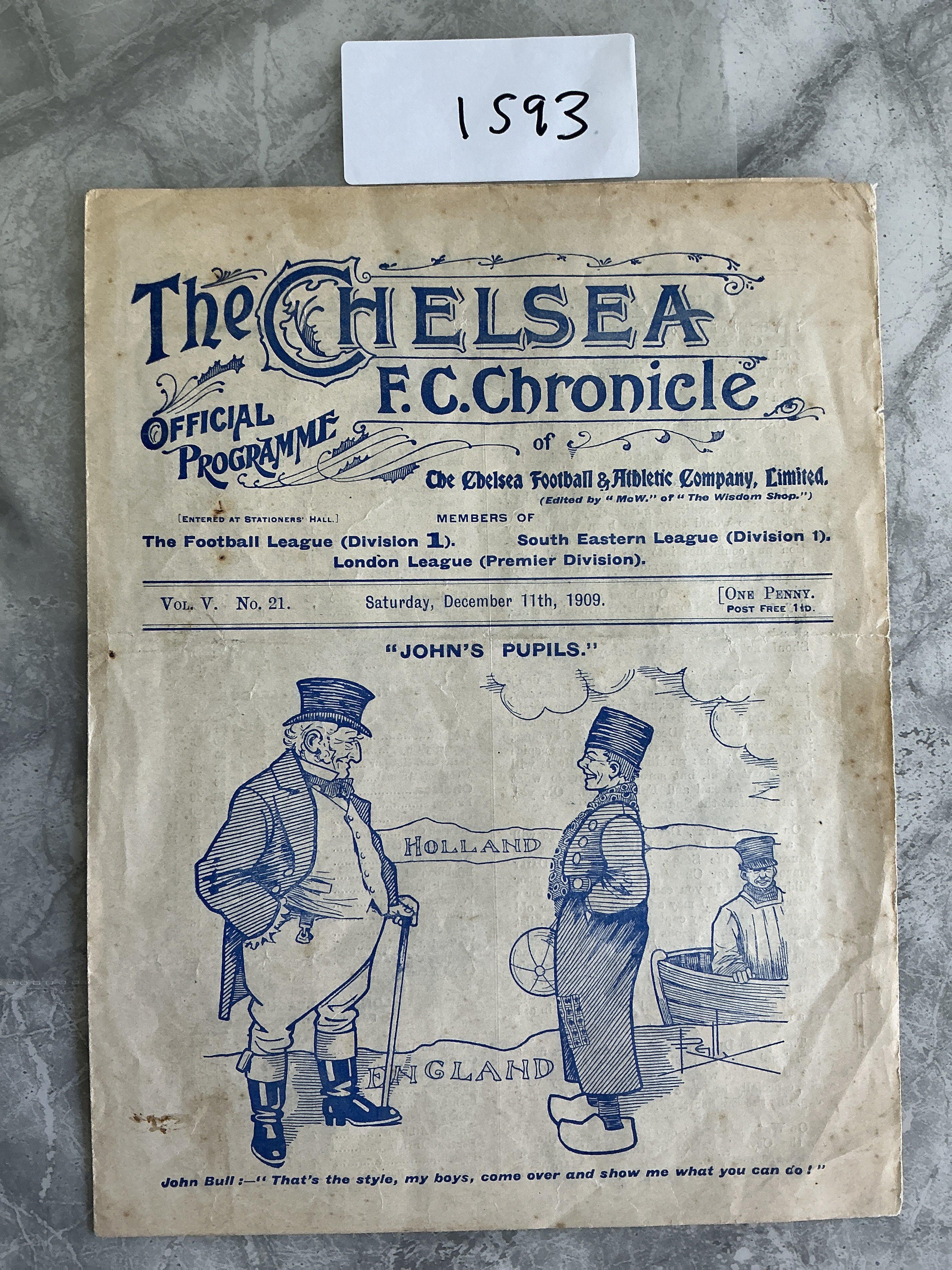 1909 - 1910 England v Holland Football Programme At Chelsea: Amateur International Match with players from Leicester Fosse Chelsea Portsmouth Fulham and Birmingham. Excellent condition 4 pager with no team changes.