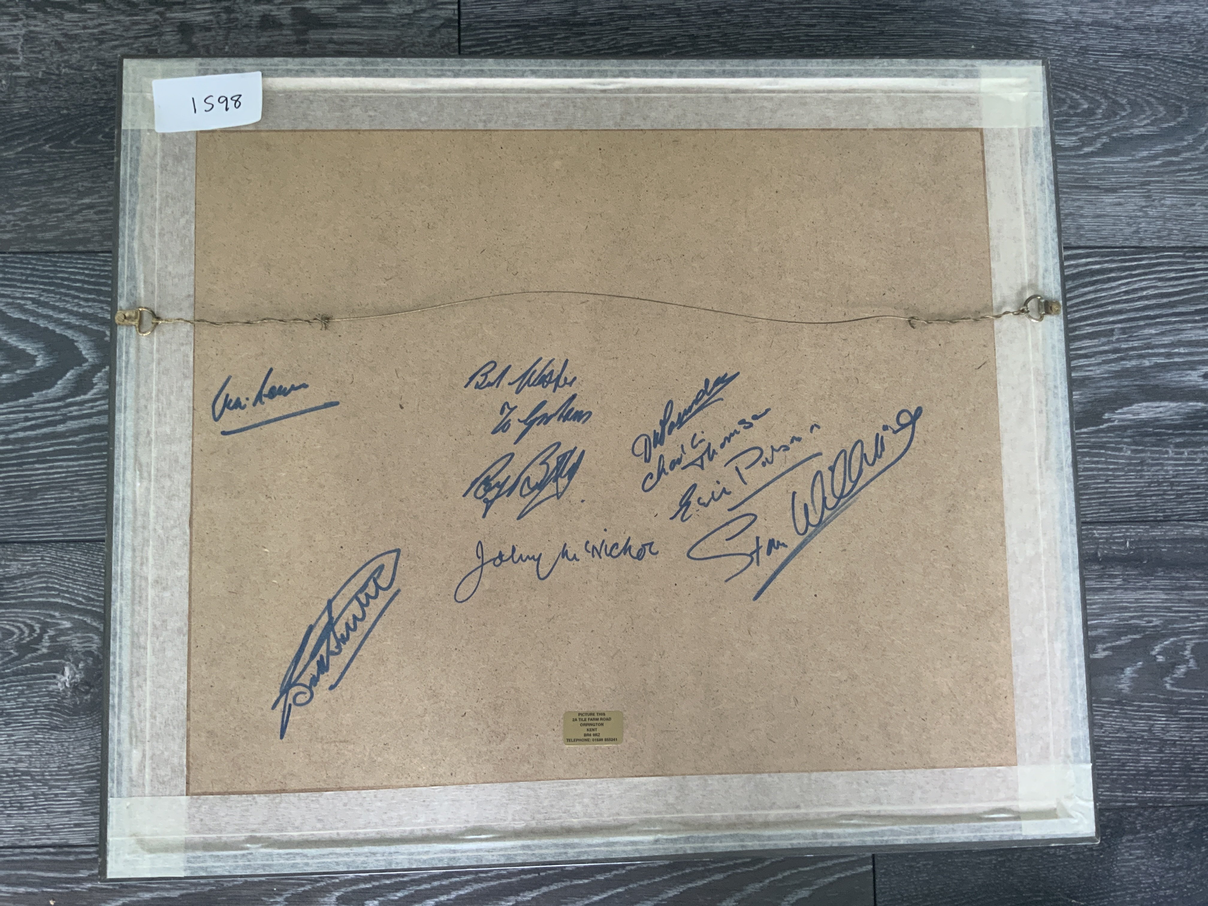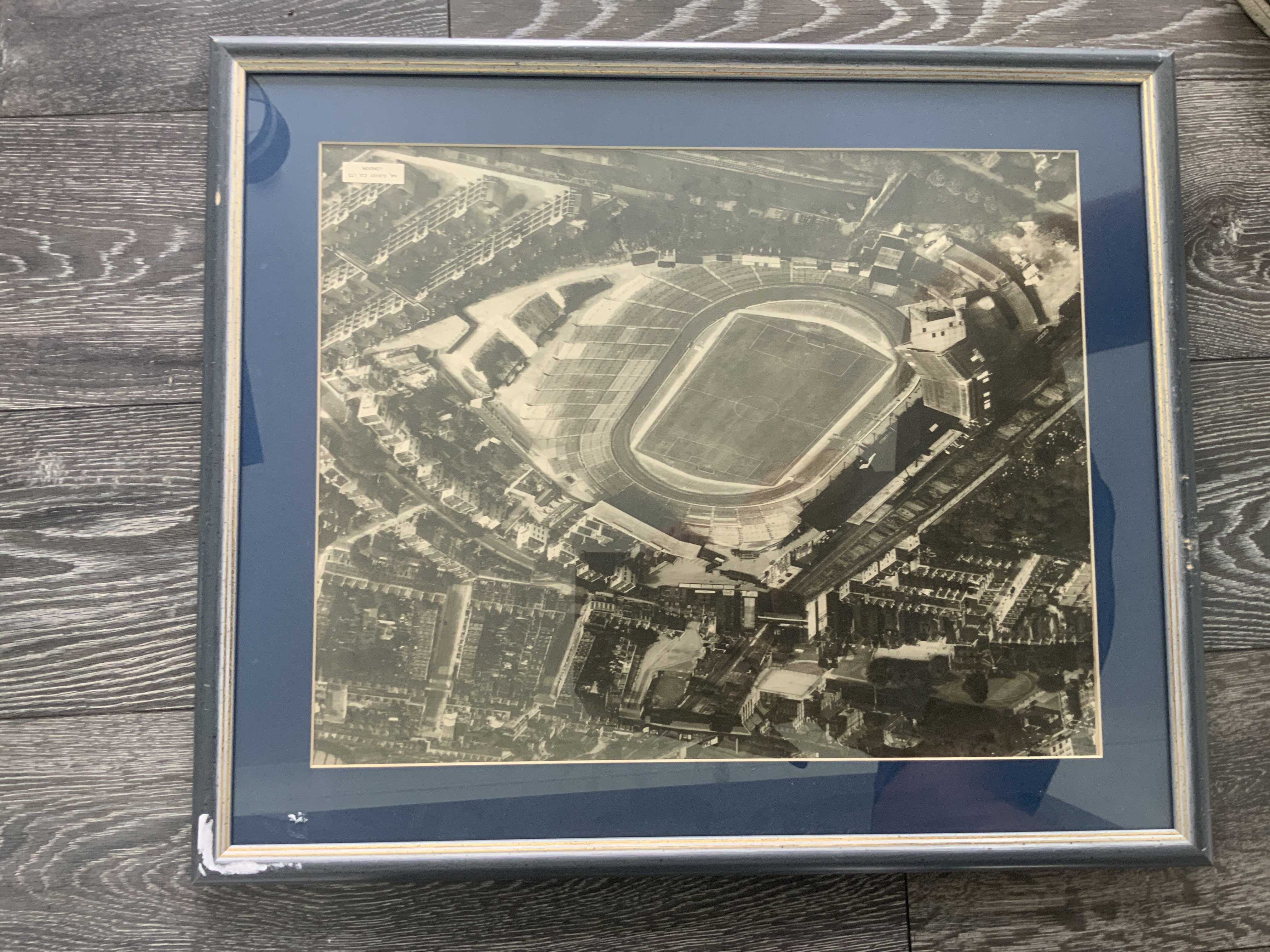 Chelsea 54/55 Framed Photo + Postcard: Division One champions original postcard. Large framed photo of an aerial shot of Stamford Bridge in the period signed to rear board of frame by 8 title winning players. Roy Bentleys autograph is dedicated but Parsons Lewis Smith Willemse Saunders Thomson McNichol etc are not. (2)