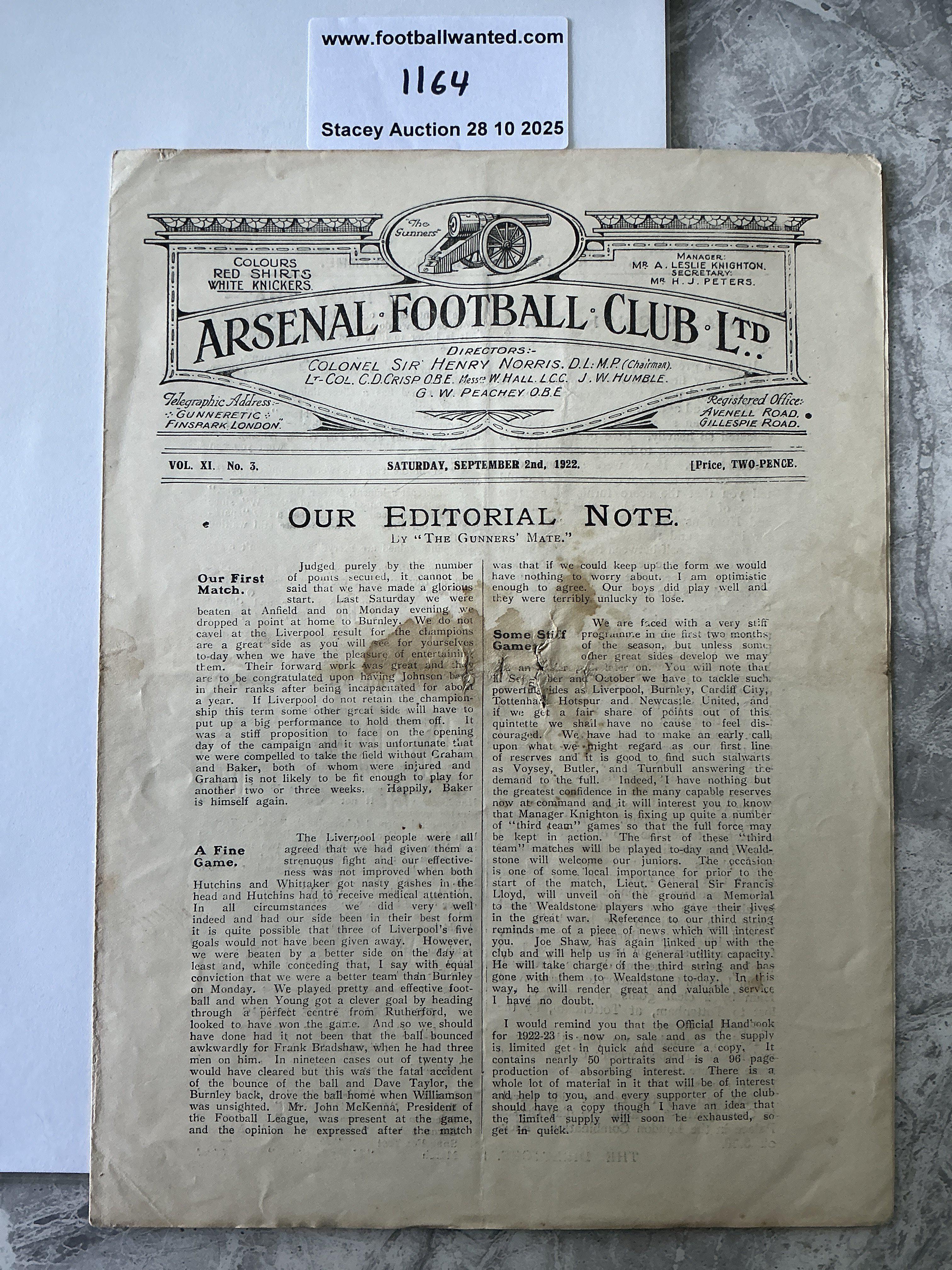 1922 - 1923 Arsenal v Liverpool Football Programme: Fair condition 4 page sheet with no team changes. Tiny tears to centre and small stain.