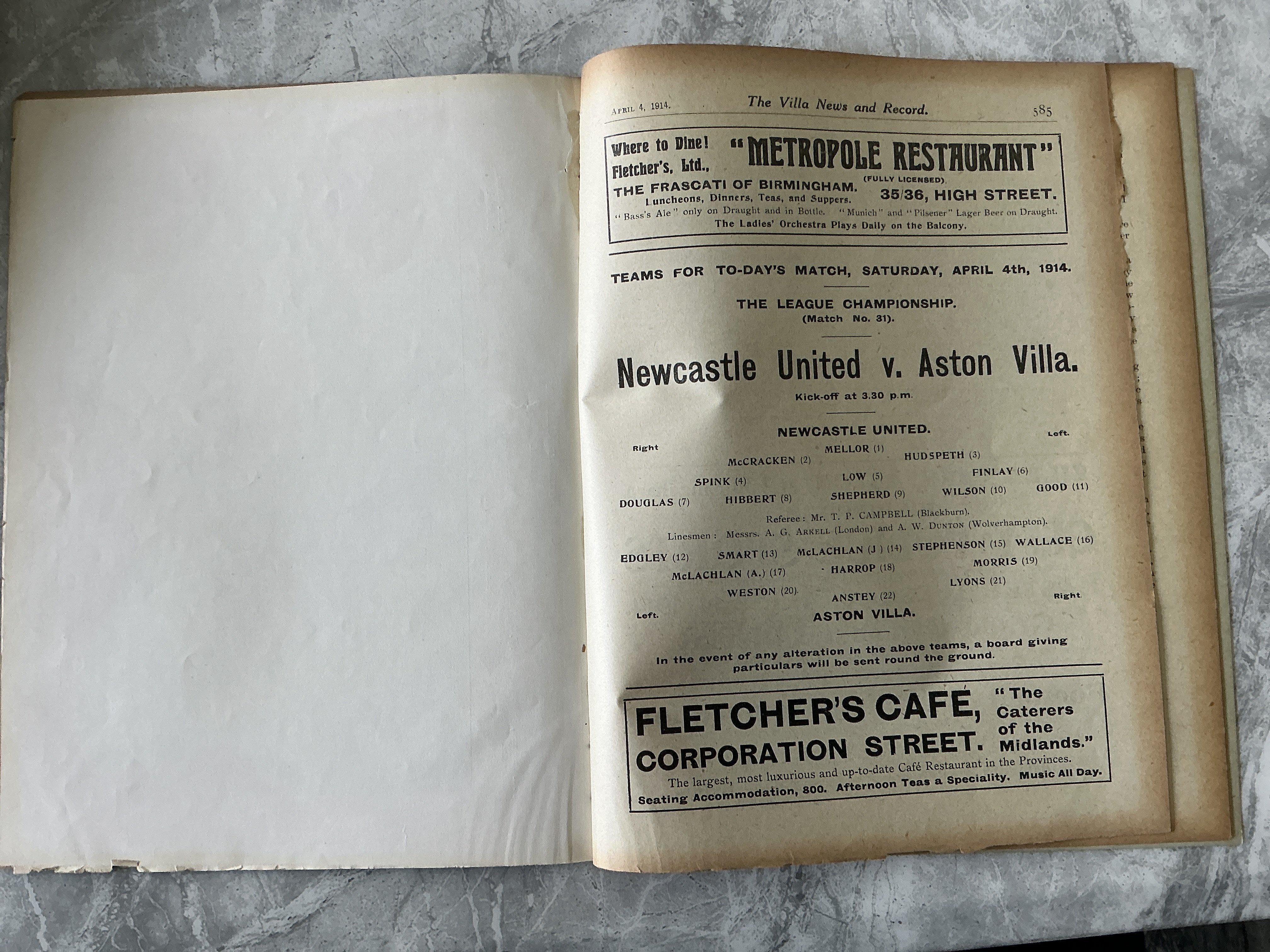 1913 - 1914 Aston Villa v Newcastle United Football Programme: Very good ex bound with covers 1st division league match. Villa were runners up this season. Only a few months before World War One started.