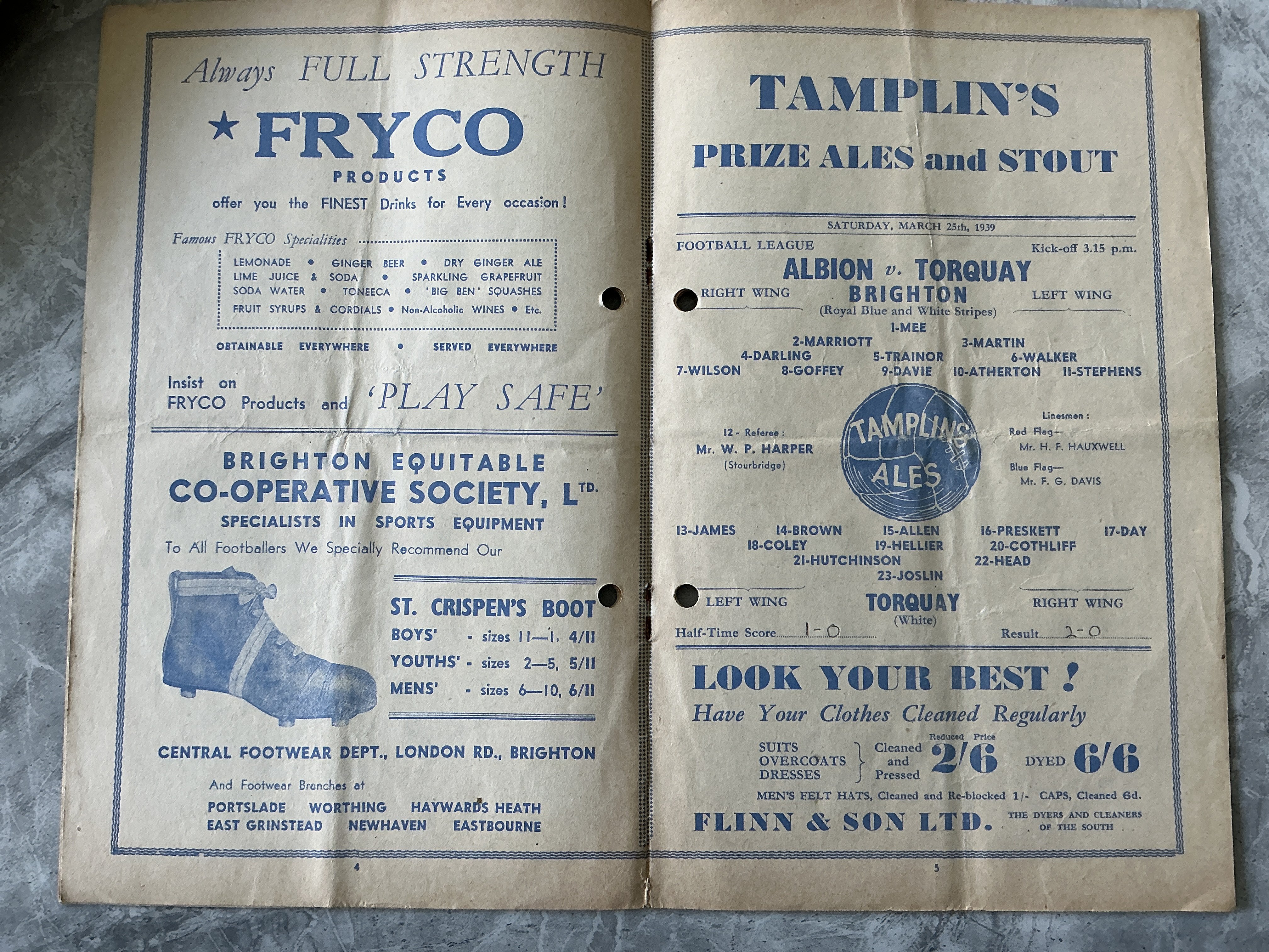 38/39 Brighton v Torquay United Football Programme: Good condition 3rd Division South programme although two punch holes. No team changes. Has some pencilled half times inside.